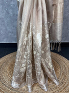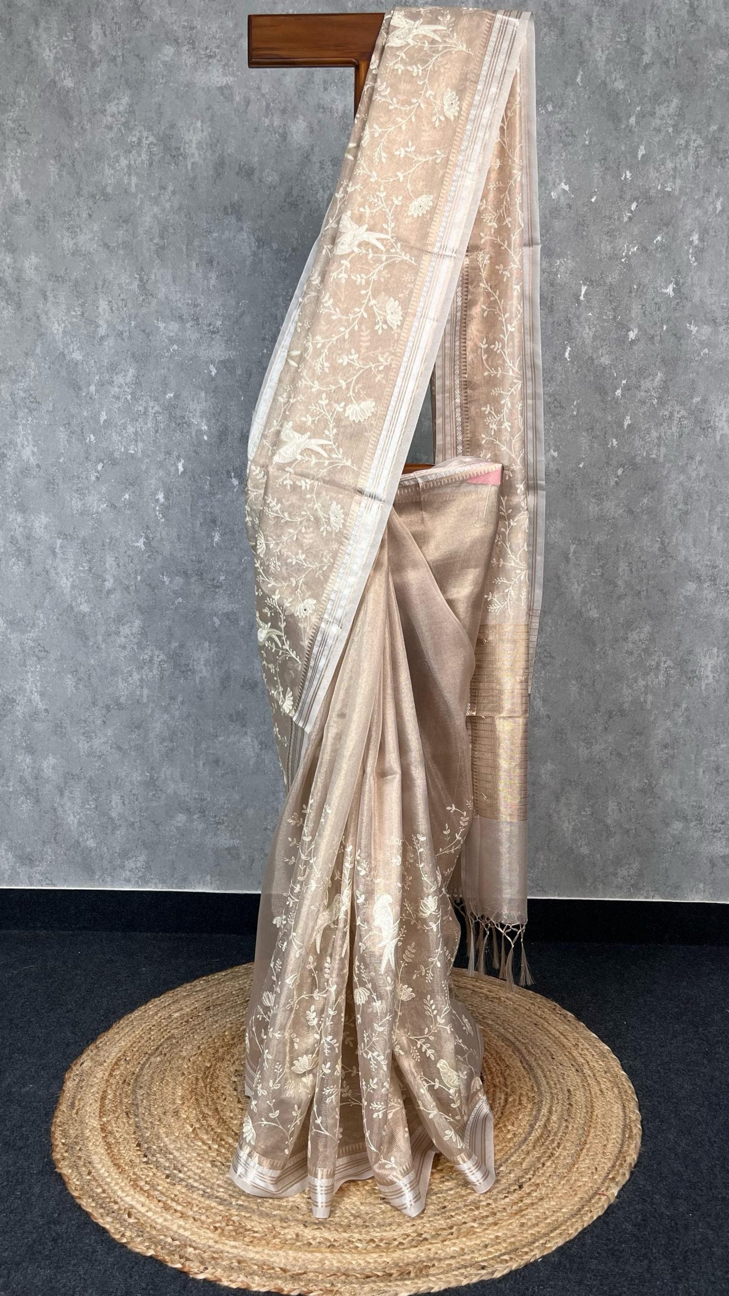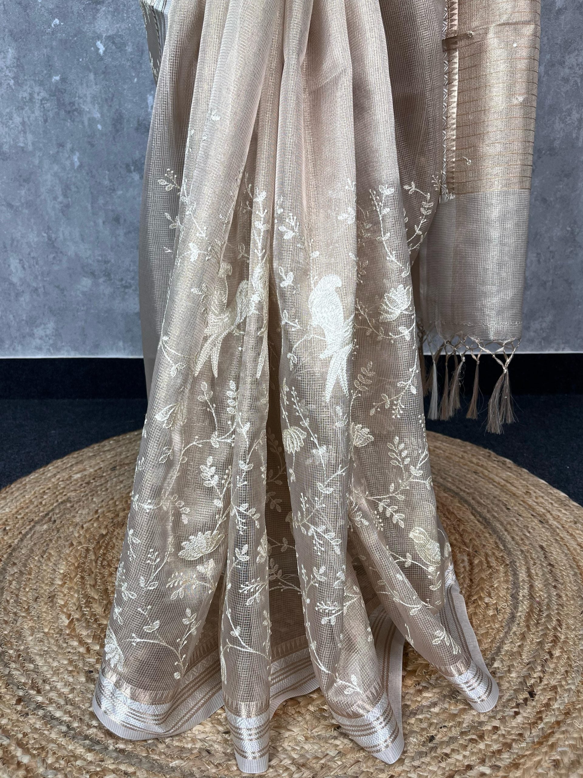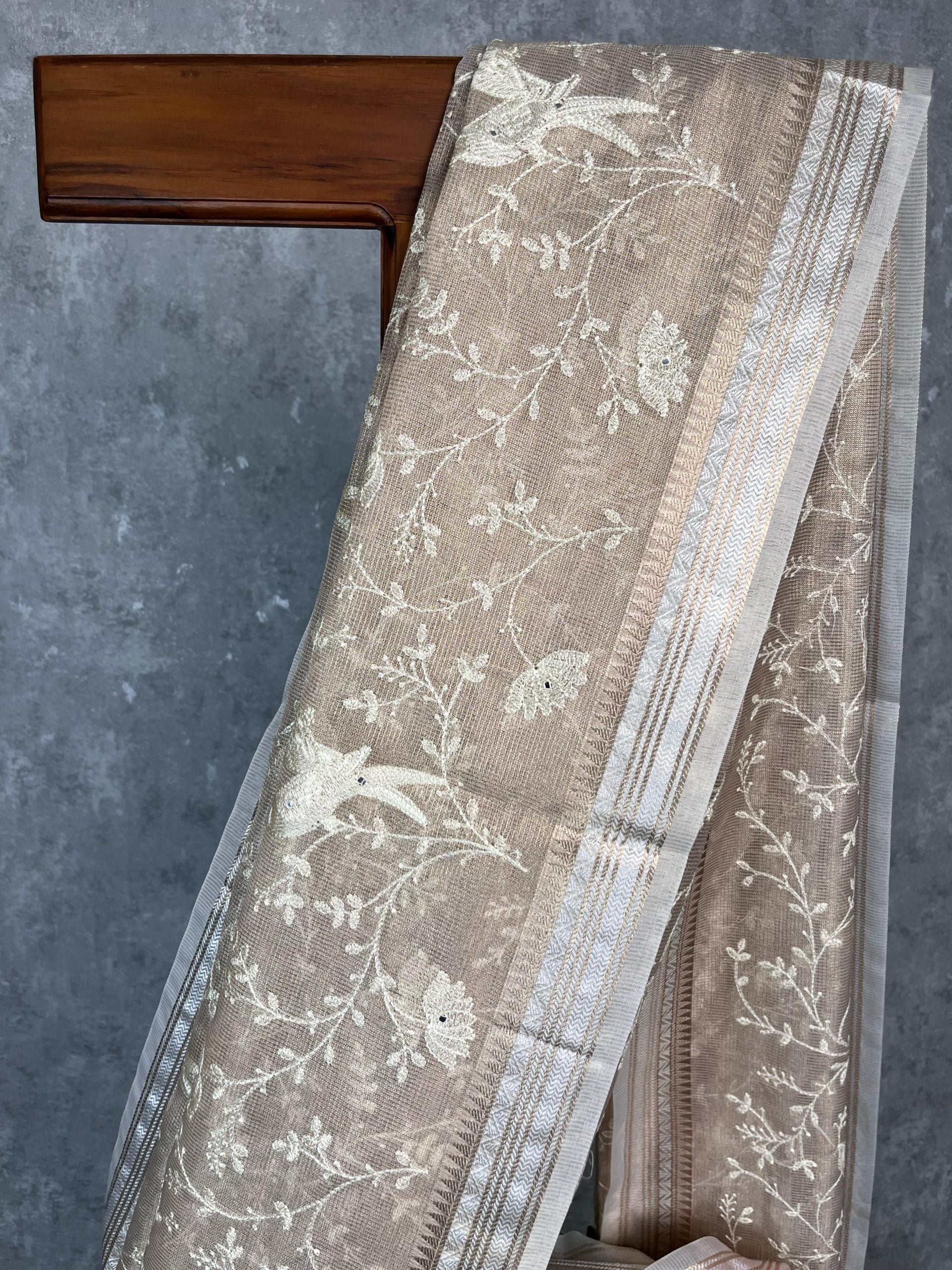 Tissue kota saree with beautiful thread embroidery all over the body. The has attached tissue kota fabric with embroidery along the sleeve edges.
