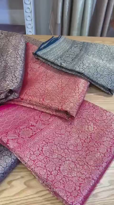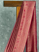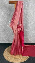 This stunning saree features a rich pink shade adorned with intricate golden zari weaving that adds a touch of regal elegance. The delicate motifs and detailed patterns enhance its luxurious appeal, making it perfect for weddings and grand celebrations. Its graceful drape and luminous finish give it a timeless, sophisticated charm.