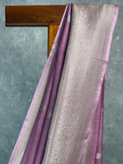 This elegant Banarasi saree is made from soft tussar georgette fabric in graceful dusty mauve shade. The body features a subtle sheen with delicate motifs, while the light pink contrast pallu and border are beautifully adorned with fine zari weaving. The saree comes with attached blouse piece.