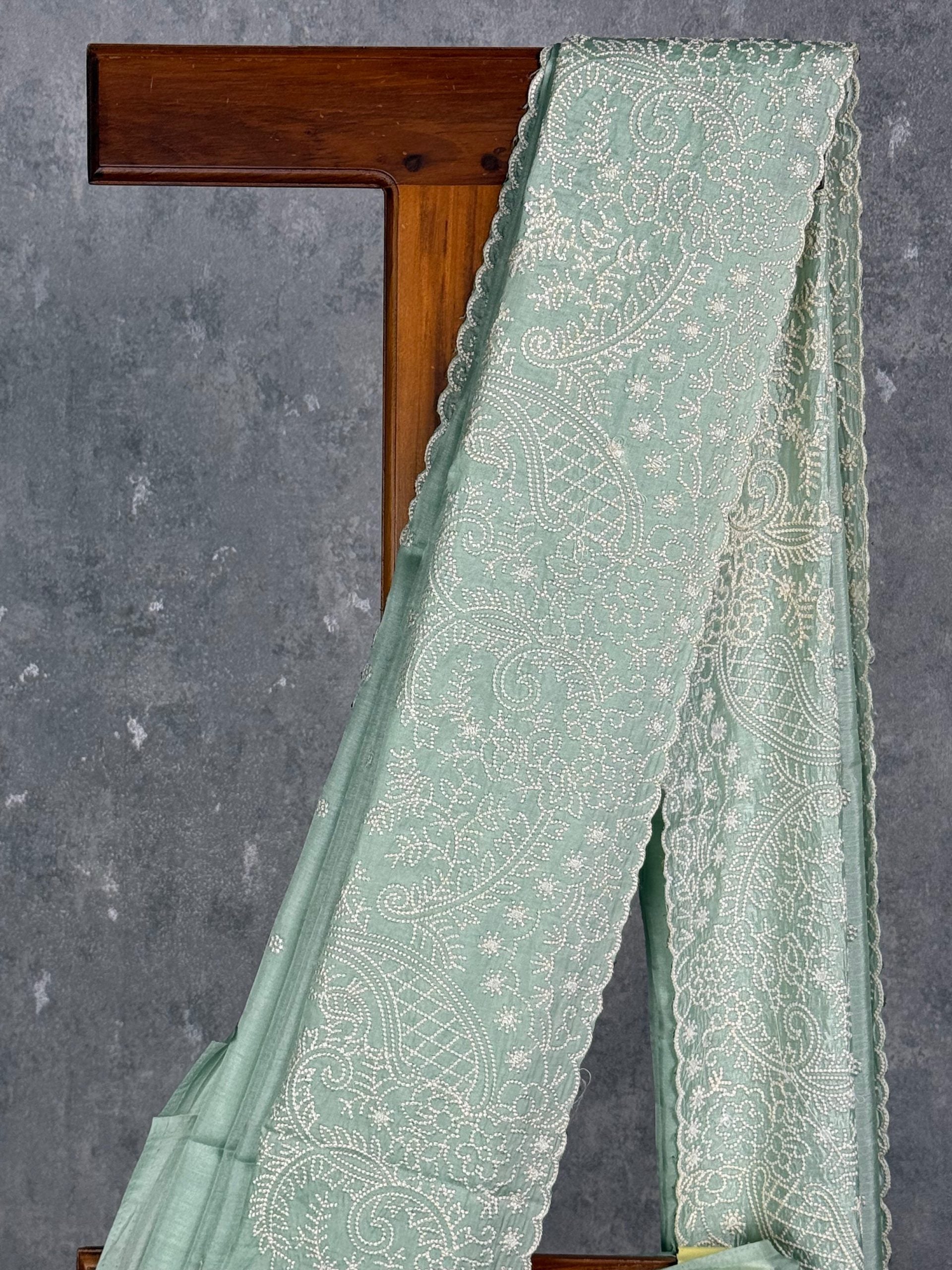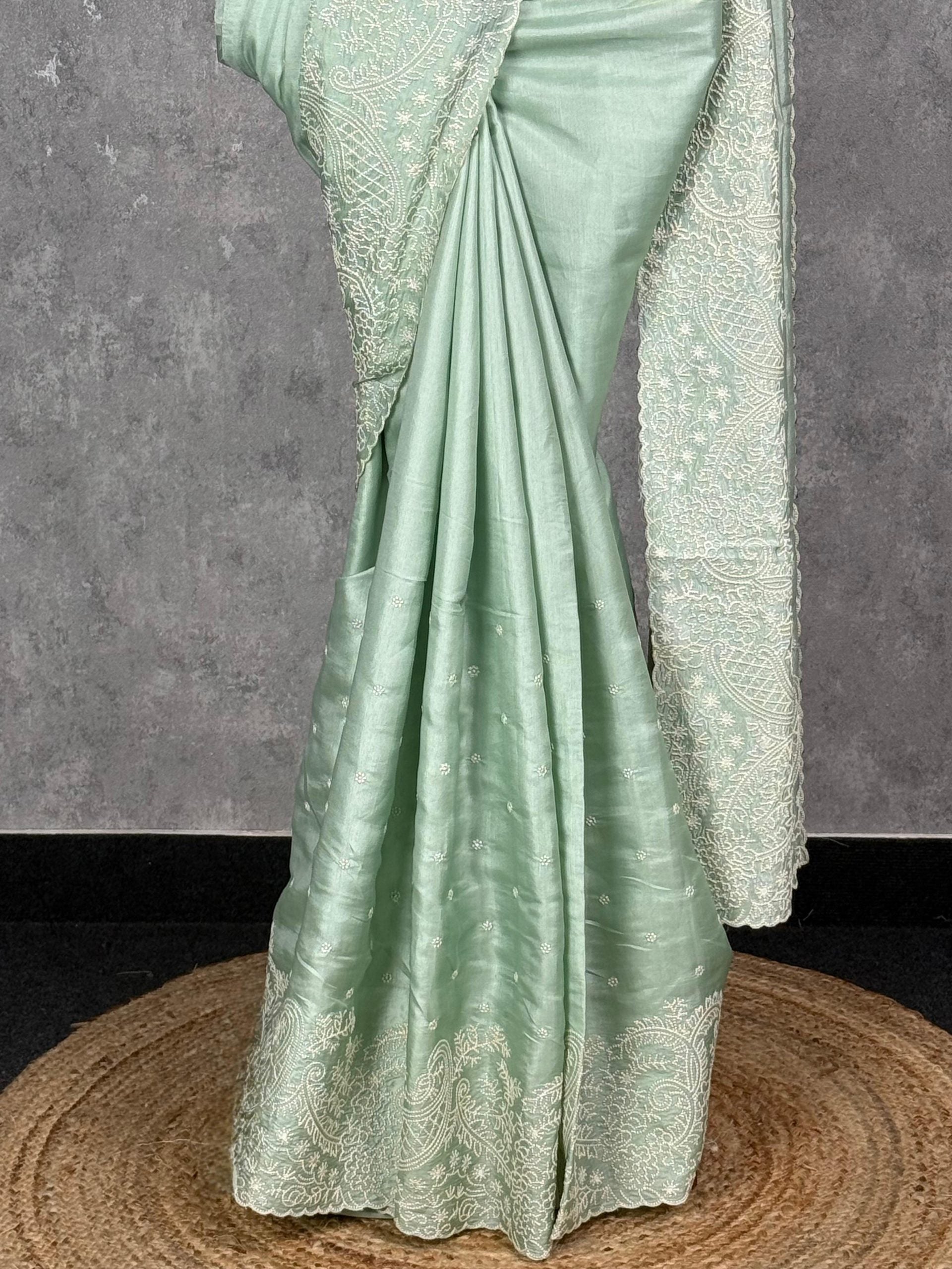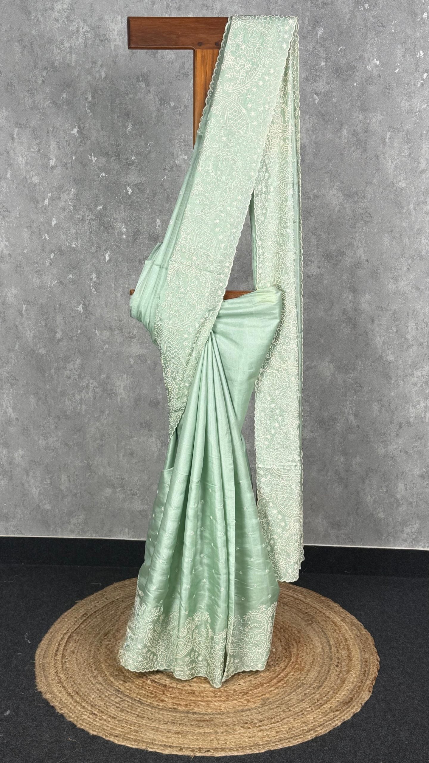 This saree features a soothing pastel pistachio green shade that brings a fresh and elegant appeal. The delicate white embroidery along the border and pallu enhances its refined and graceful look. Perfect for daytime functions, it beautifully blends subtle colour with timeless sophistication.