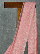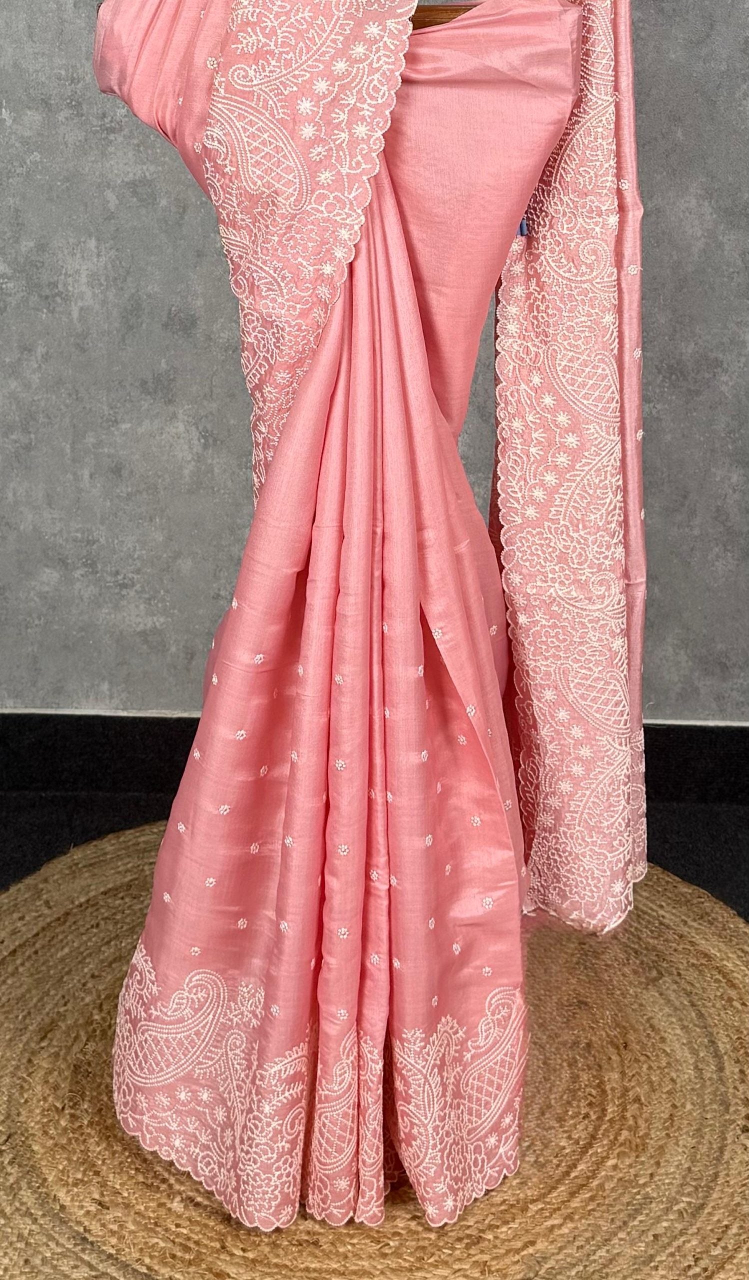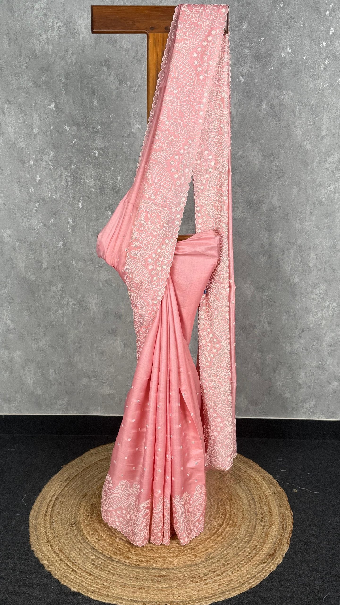This saree features a soft and charming baby pink shade that instantly adds a touch of sweetness and elegance. The delicate white embroidery along the border and pallu enhances its graceful, feminine appeal. Perfect for daytime events and festive gatherings, it blends subtle beauty with timeless sophistication.