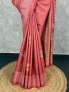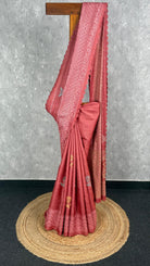 This elegant saree in a muted rose shade exudes timeless sophistication and charm. The intricate woven patterns along the border and subtle motifs across the drape add a touch of traditional artistry. Perfect for formal events or festive celebrations, this saree beautifully blends grace with understated luxury.