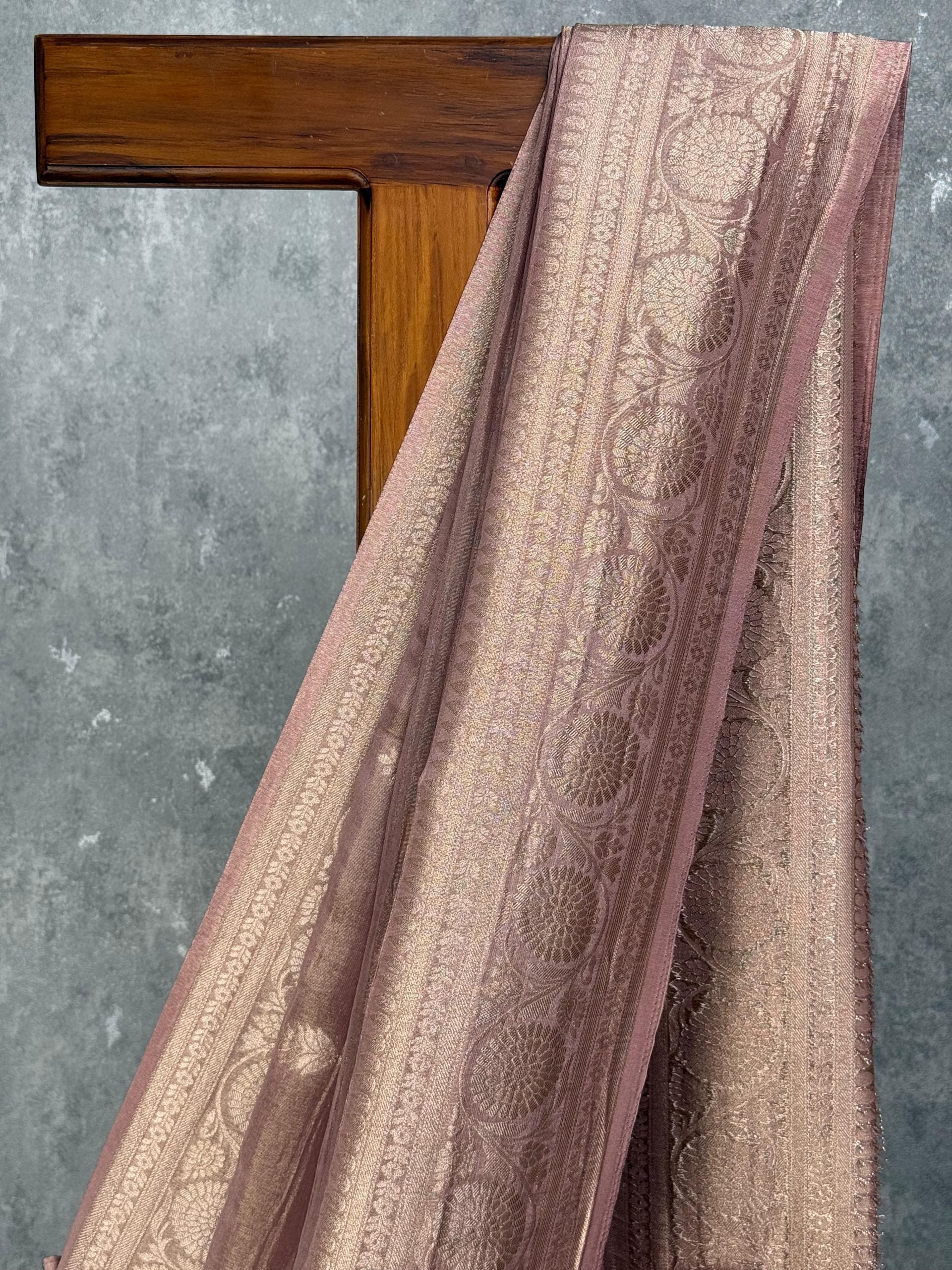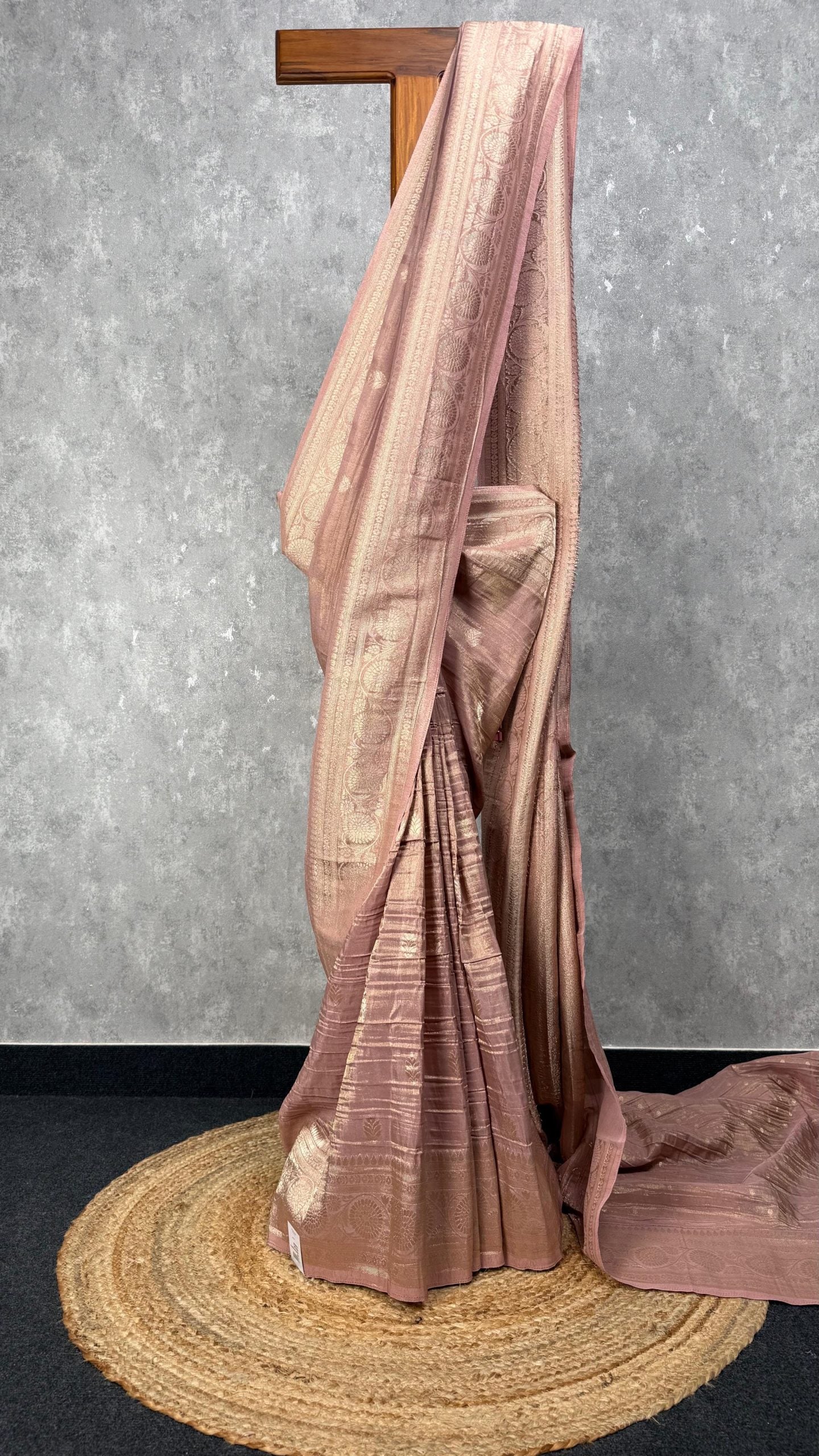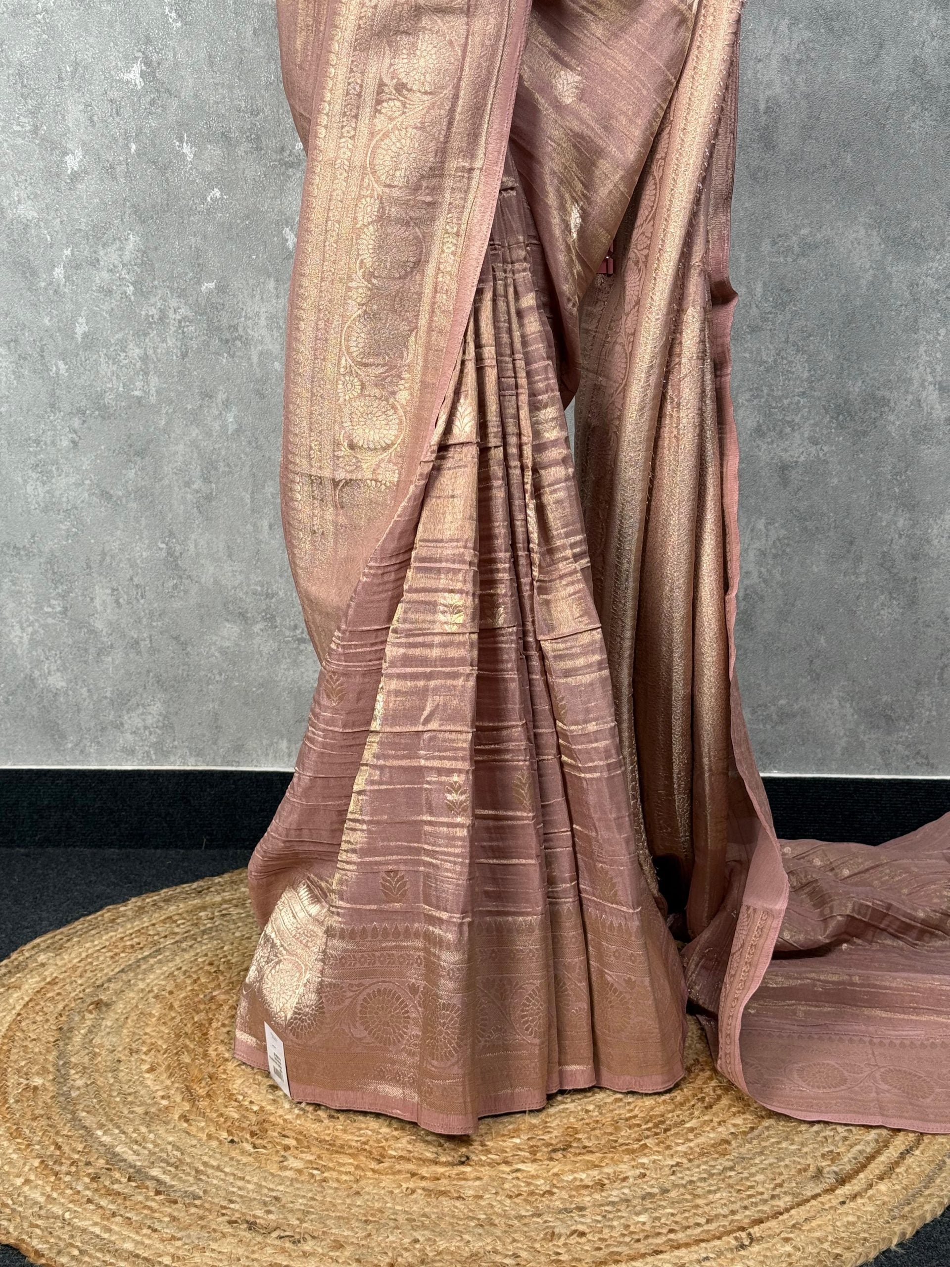 This is a graceful crushed tissue silk Banarasi saree in a beautiful copper pink shade. It features delicate golden zari weaving along the border and pallu, adding a touch of elegance. The crushed texture enhance its traditional charm. The saree comes with self color blouse piece.