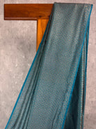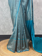 This Chanderi antique sari-brocade Banarasi saree features a refined teal-blue intricately woven with traditional brocade patterns in antique zari. The saree comes with attached self color blouse piece.