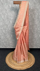 Crushed chiffon saree with zari pitta work all over the body and heavily embroidered border. The saree is in peach colorand has attached self color blouse piece.