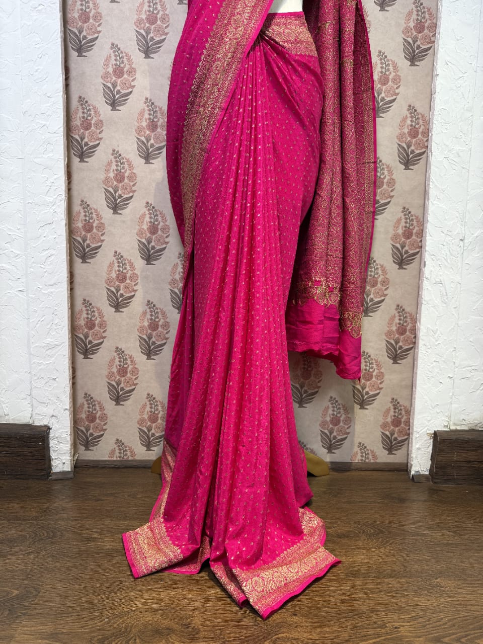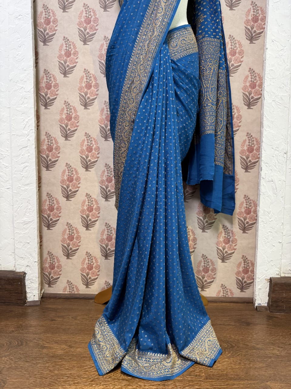 Keep the garment wrapped in cotton fabric. It is advisable to fold your organza saris in a roll for better preservation. Avoid spraying perfume directly onto the garment. Do not use naphthalene balls while storing it. Remove any stains or spots only with white petrol. Store the garment in a moderate climate, as zari can react to weather changes.