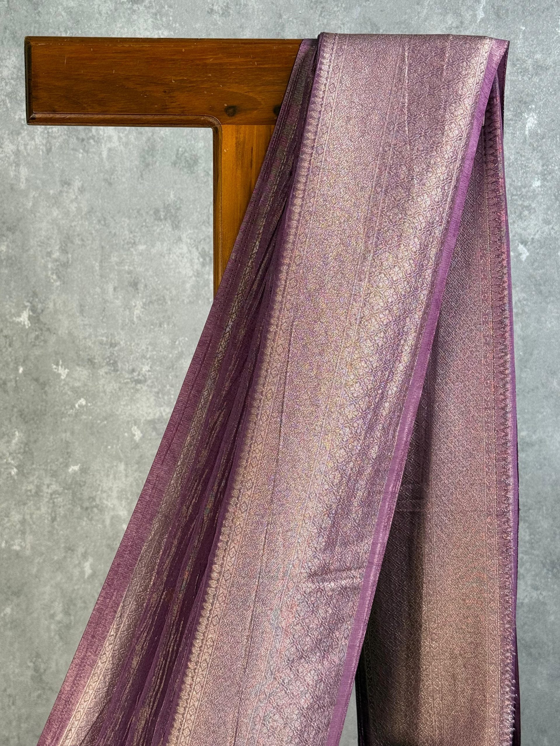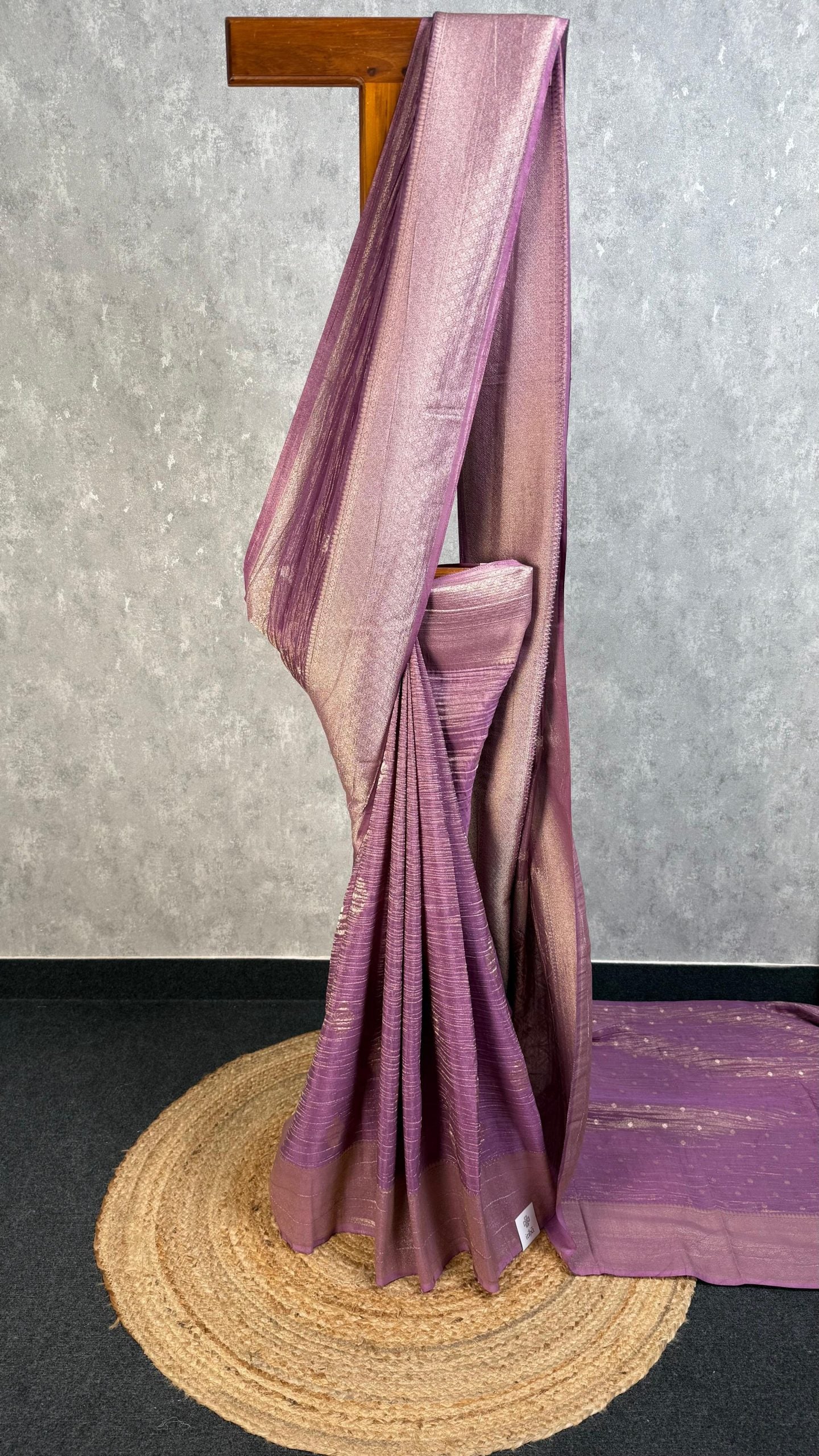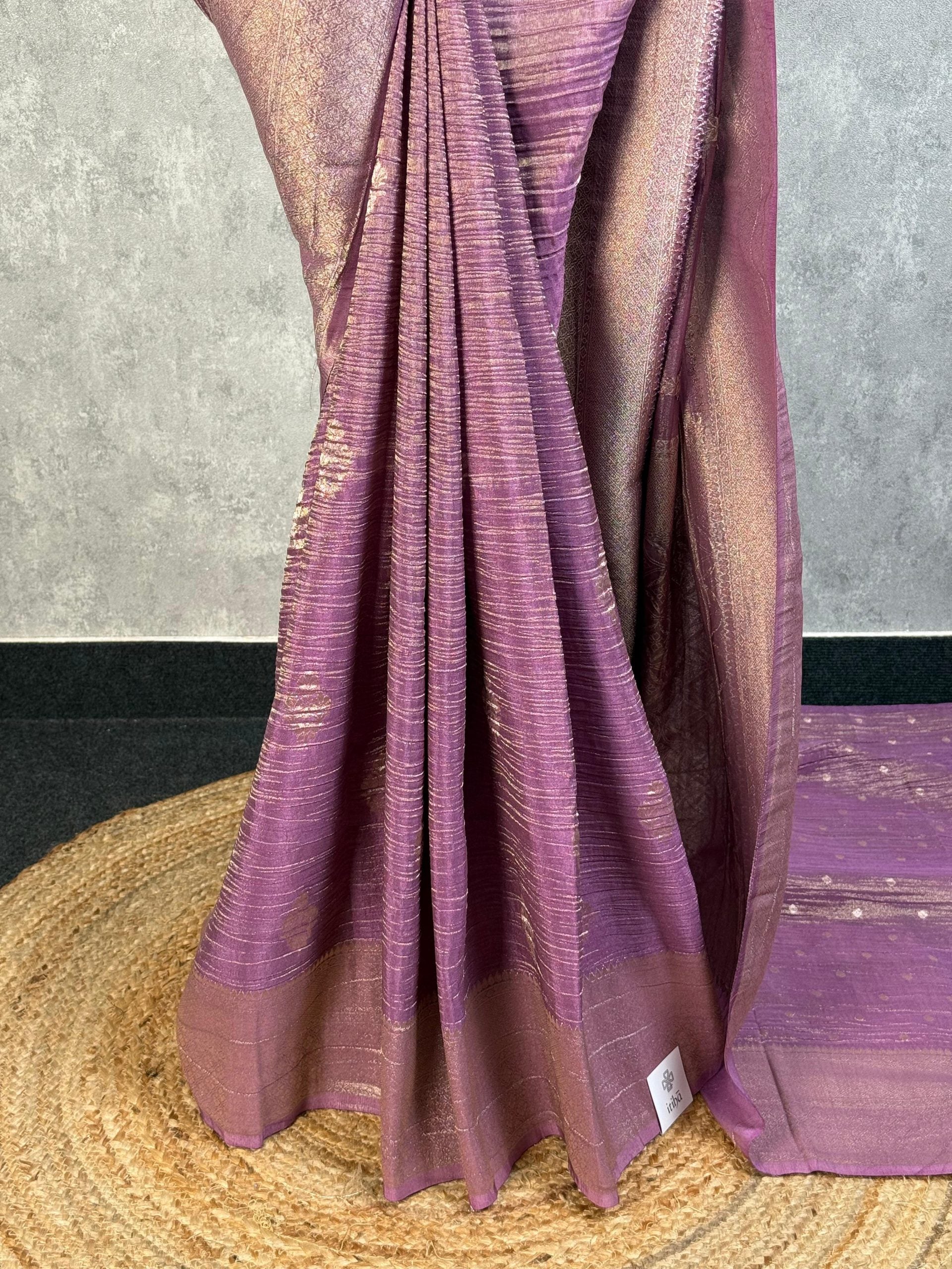 This crushed tissue silk Banarasi saree is in a vibrant lilac colour with a shimmery texture. The saree features intricate patterns woven with golden accents, adding a touch of elegance. The fabric has a crushed tissue effect giving it a unique texture. The saree showcases traditional Banarasi craftsmanship with its rich patterns and colour. The saree comes with attached self color blouse piece.