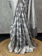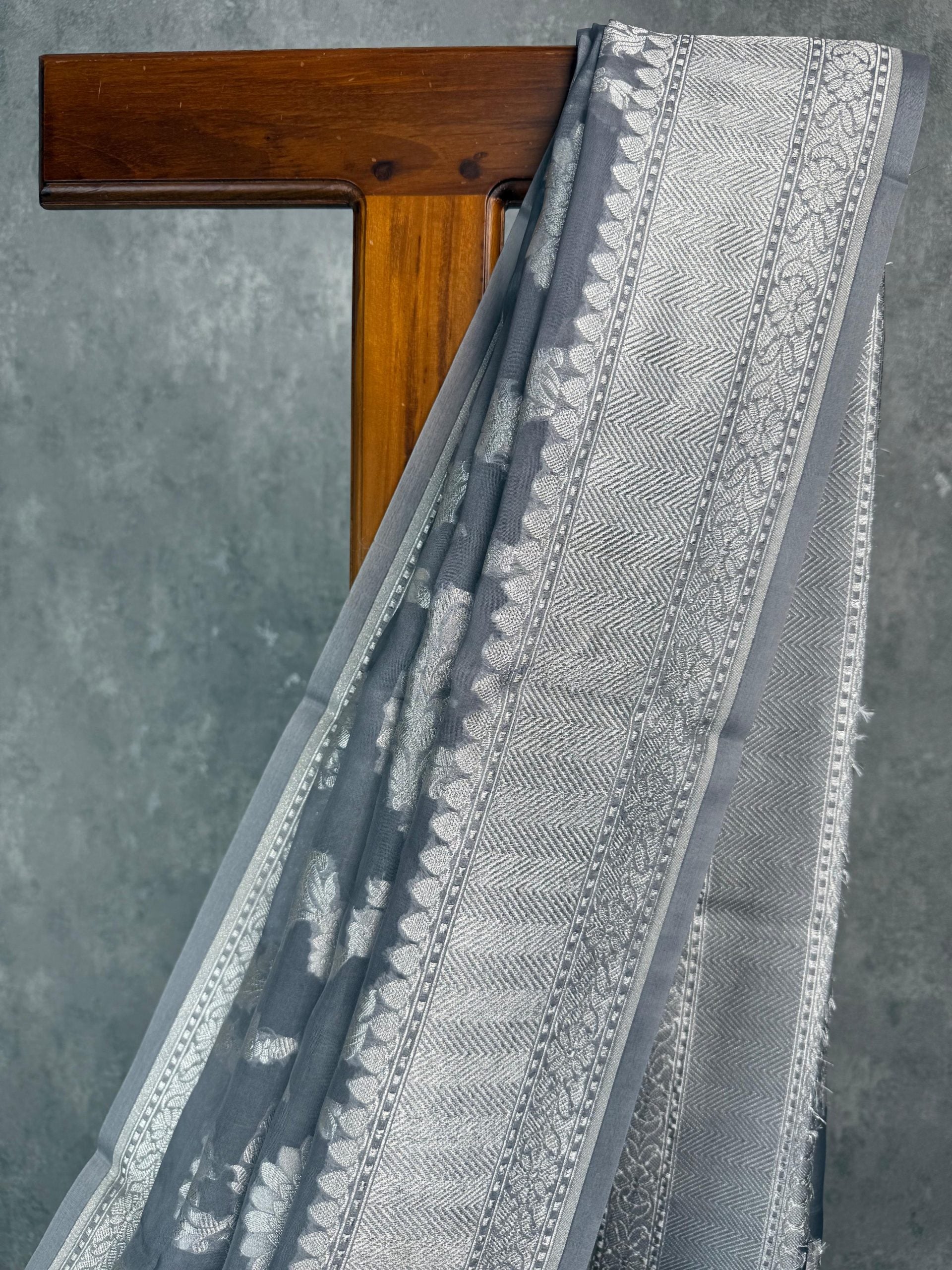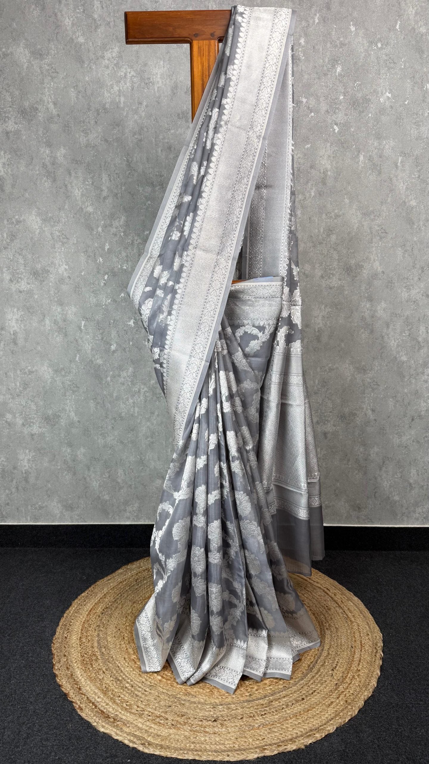This elegant Banarasi saree is crafted from kora silk in a refreshing grey shade, It features intricate all-over silver zari jaal work that adds a touch of traditional charm. The saree comes with attached self color blouse piece.