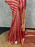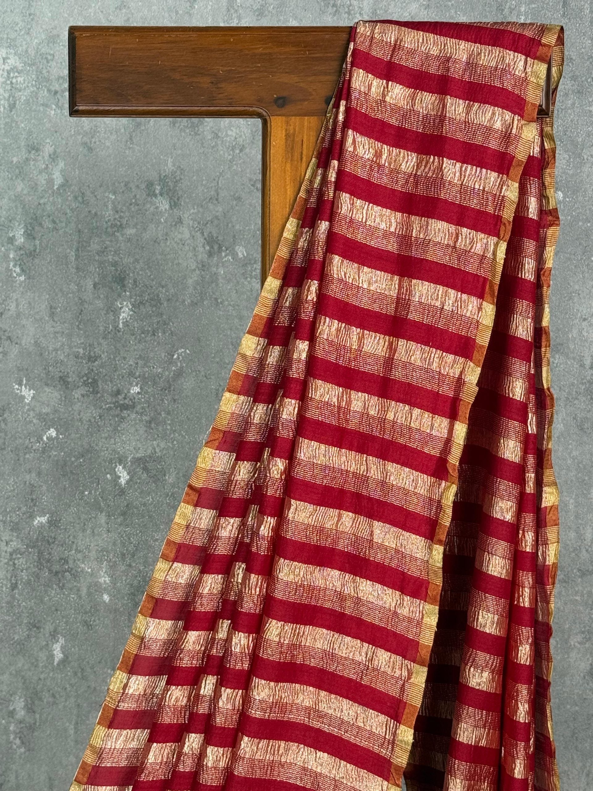 This saree showcases a stunning blend of rich red and gold tones, brought to life through its eye-catching horizontal striped pattern. The shimmering texture adds a festive radiance, while the soft drape gives it an elegant and graceful fall. Perfect for celebrations, weddings, and traditional gatherings, it beautifully balances vibrance and sophistication.