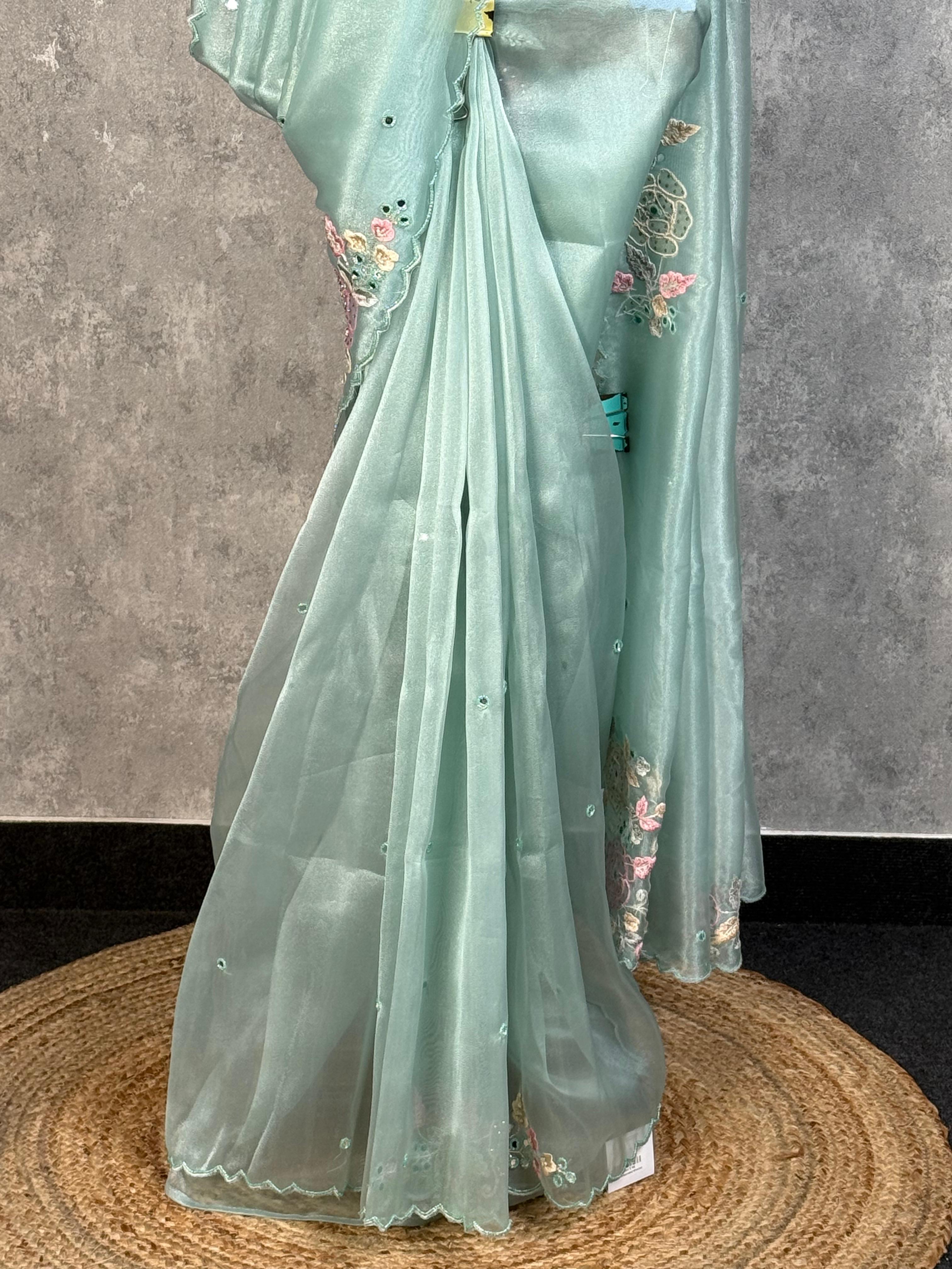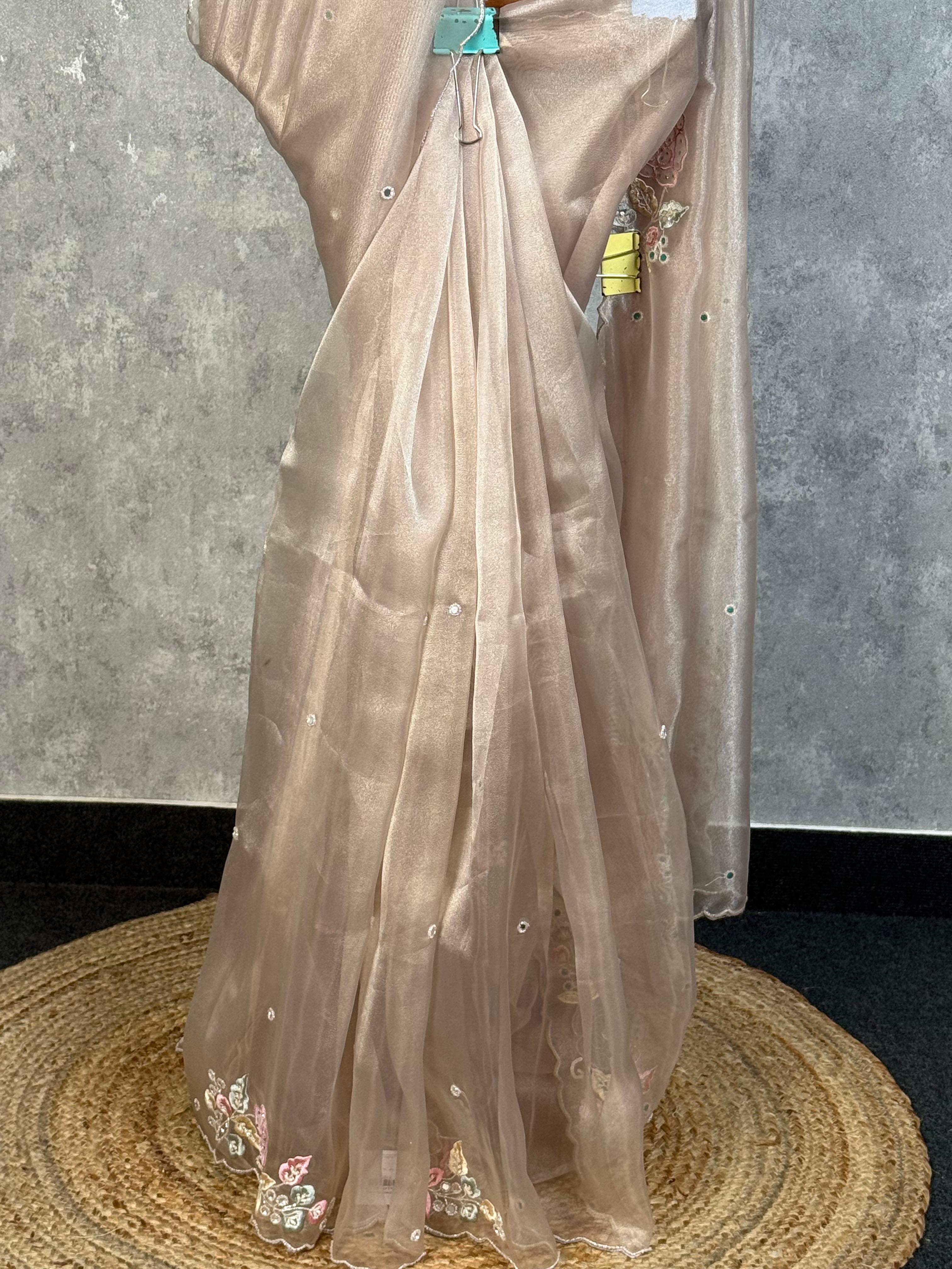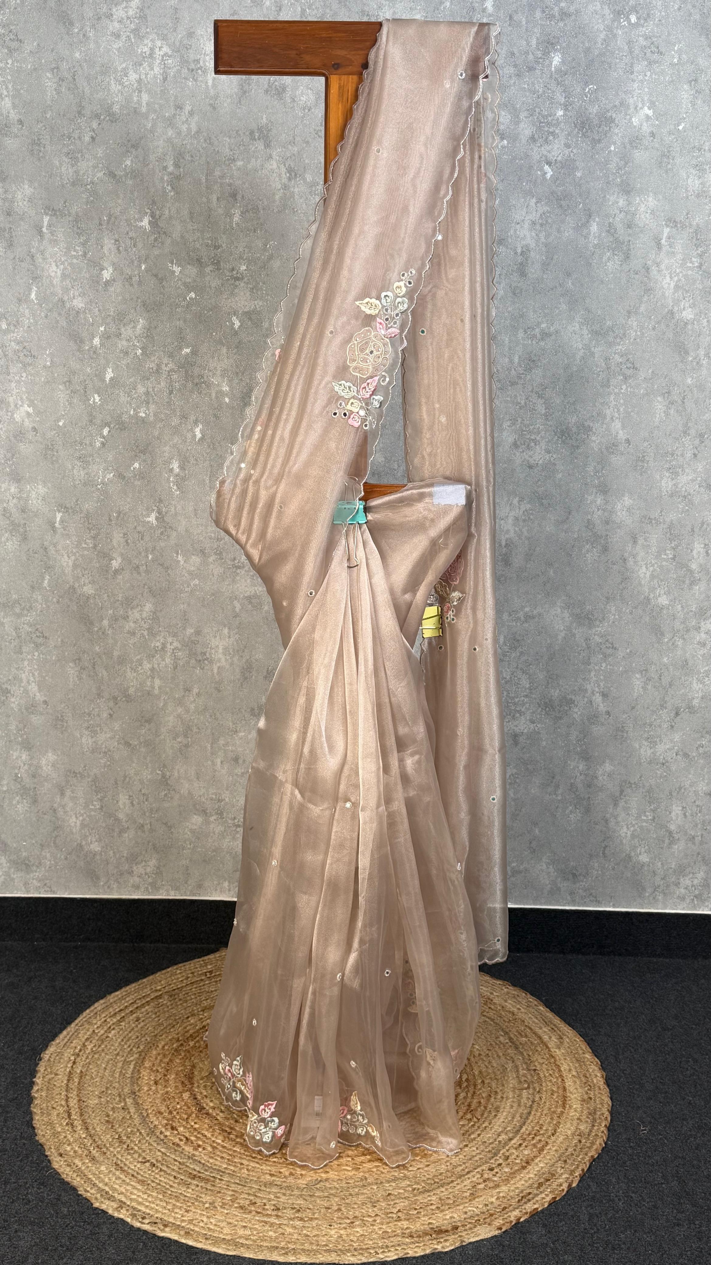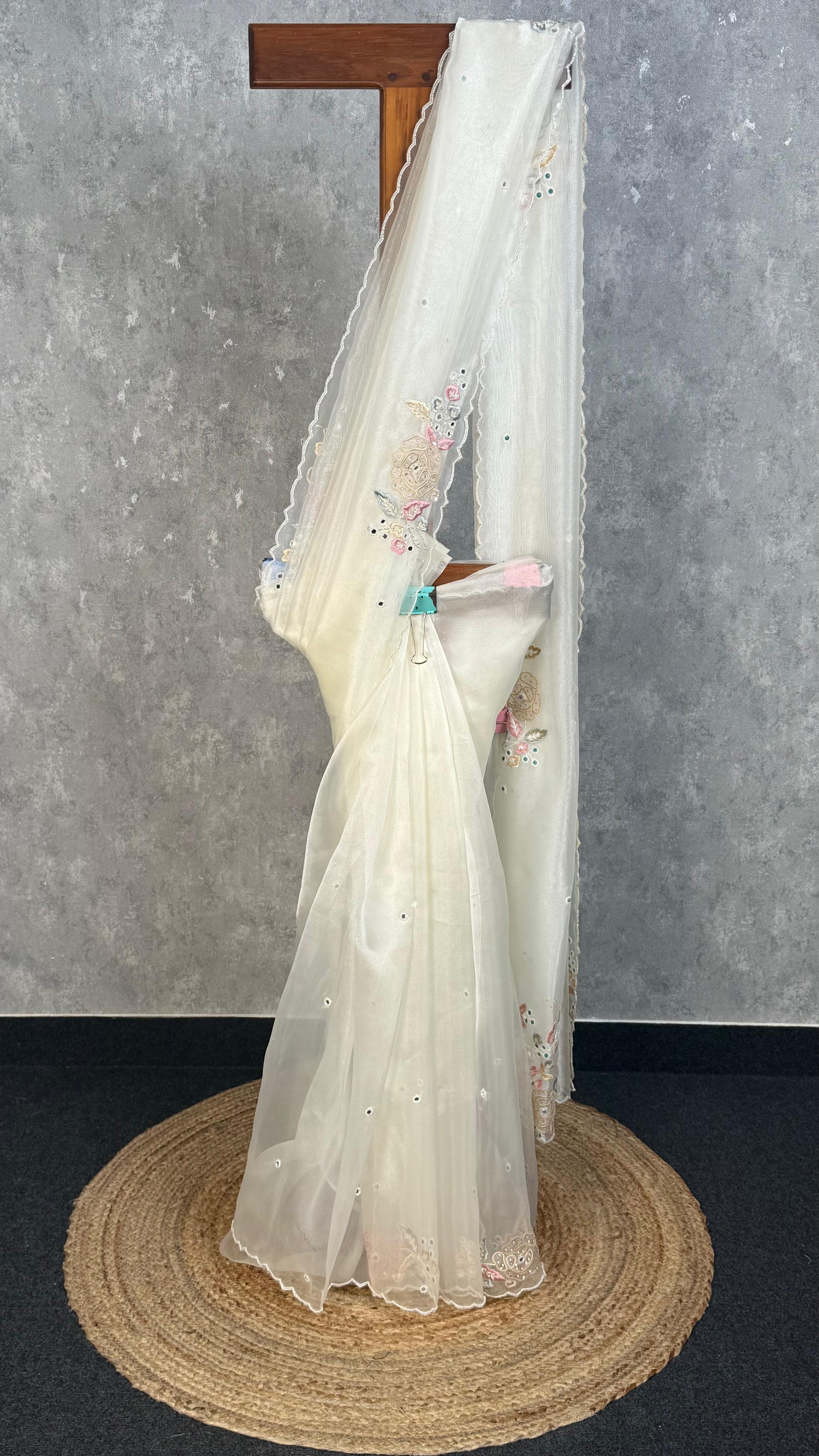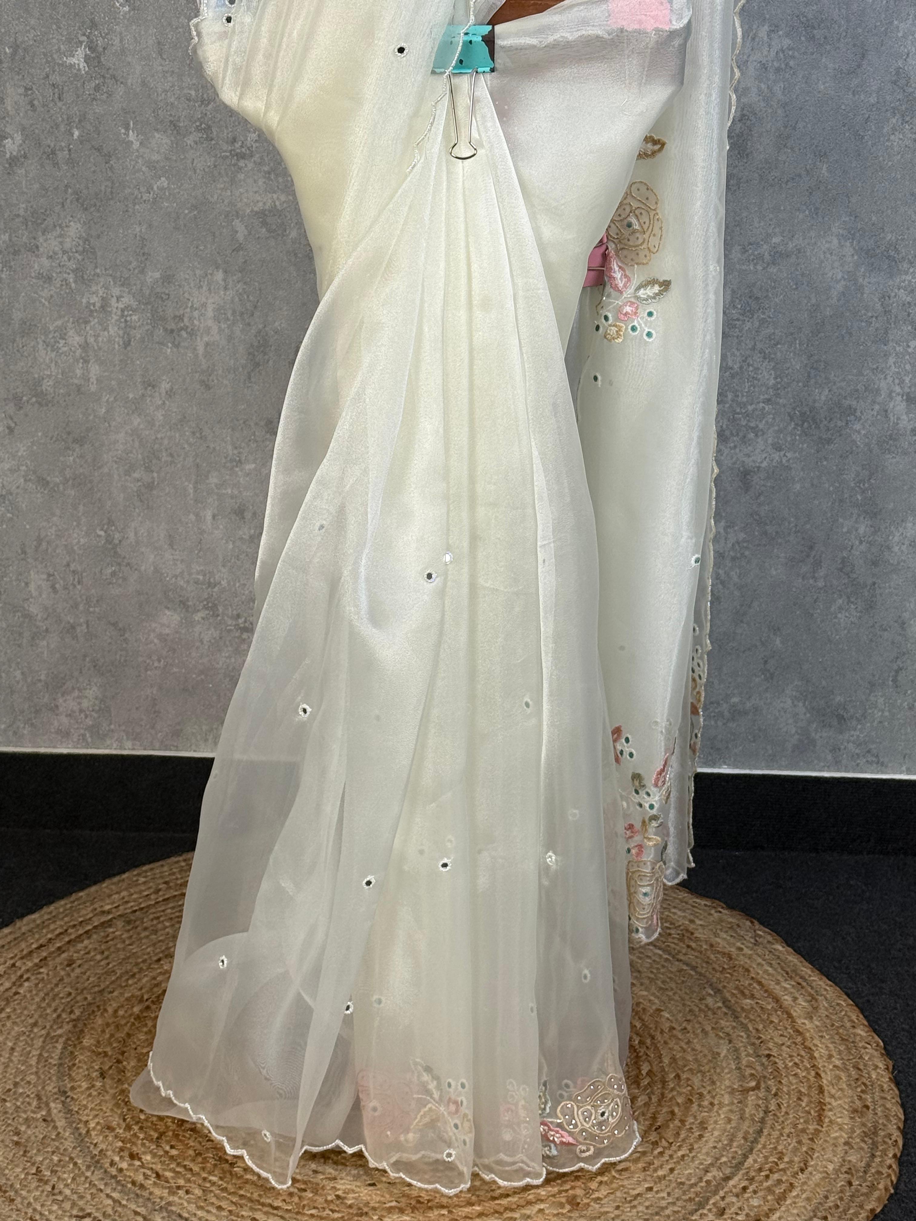 This elegant organza saree features delicate embroidery work that brings timeless grace to your wardrobe. The lightweight fabric drapes beautifully, making it perfect for weddings, festivals, and special occasions. Crafted with attention to detail, this piece combines traditional artistry with modern sophistication.