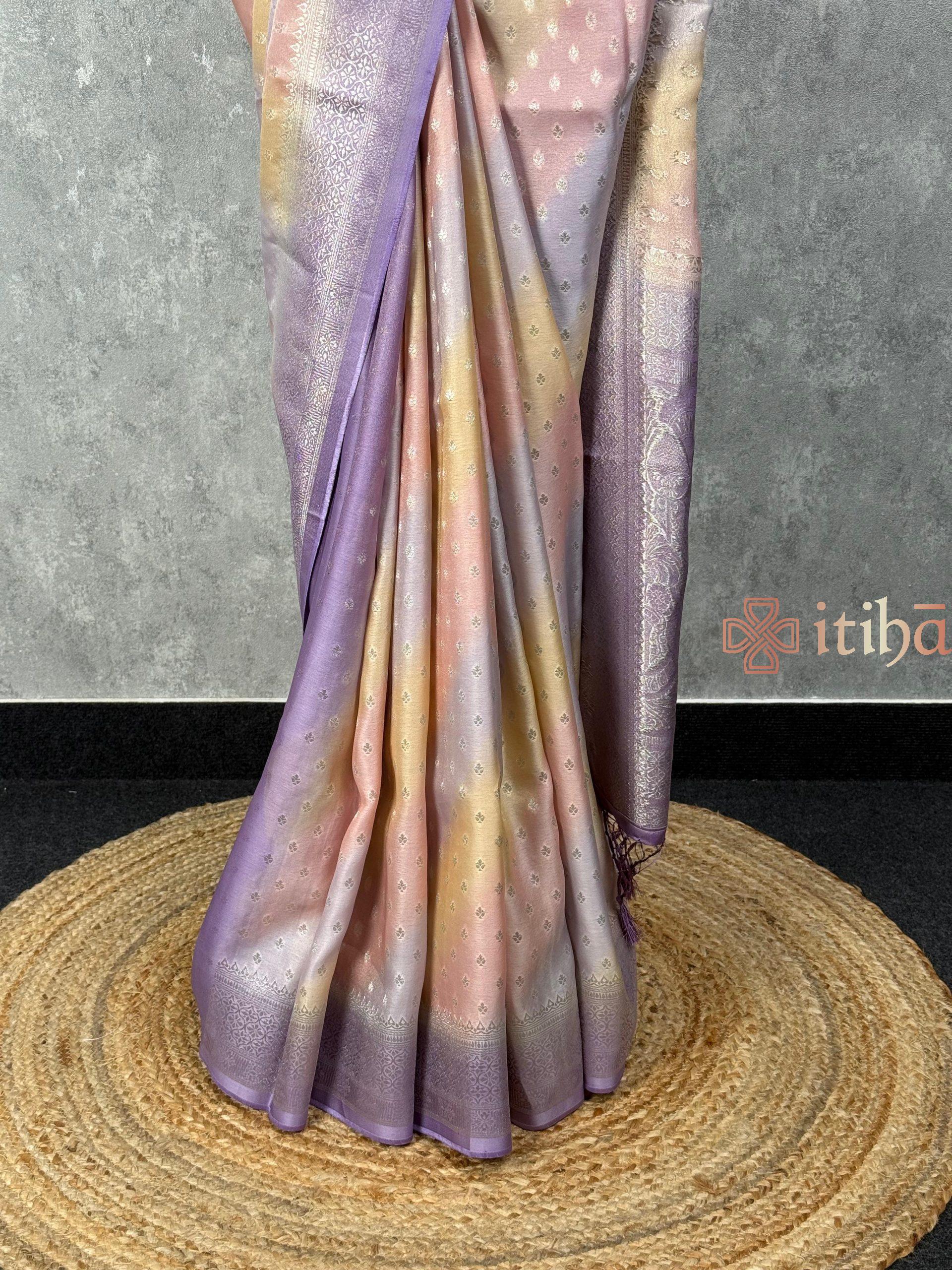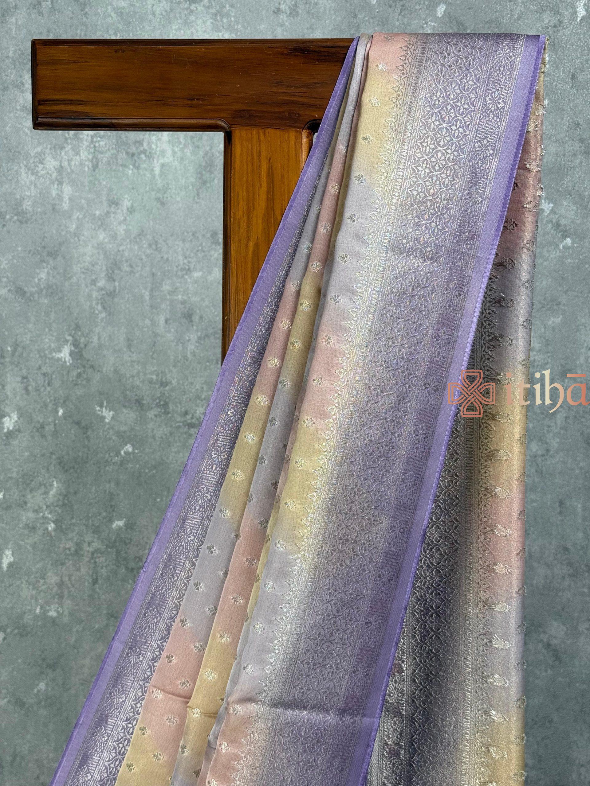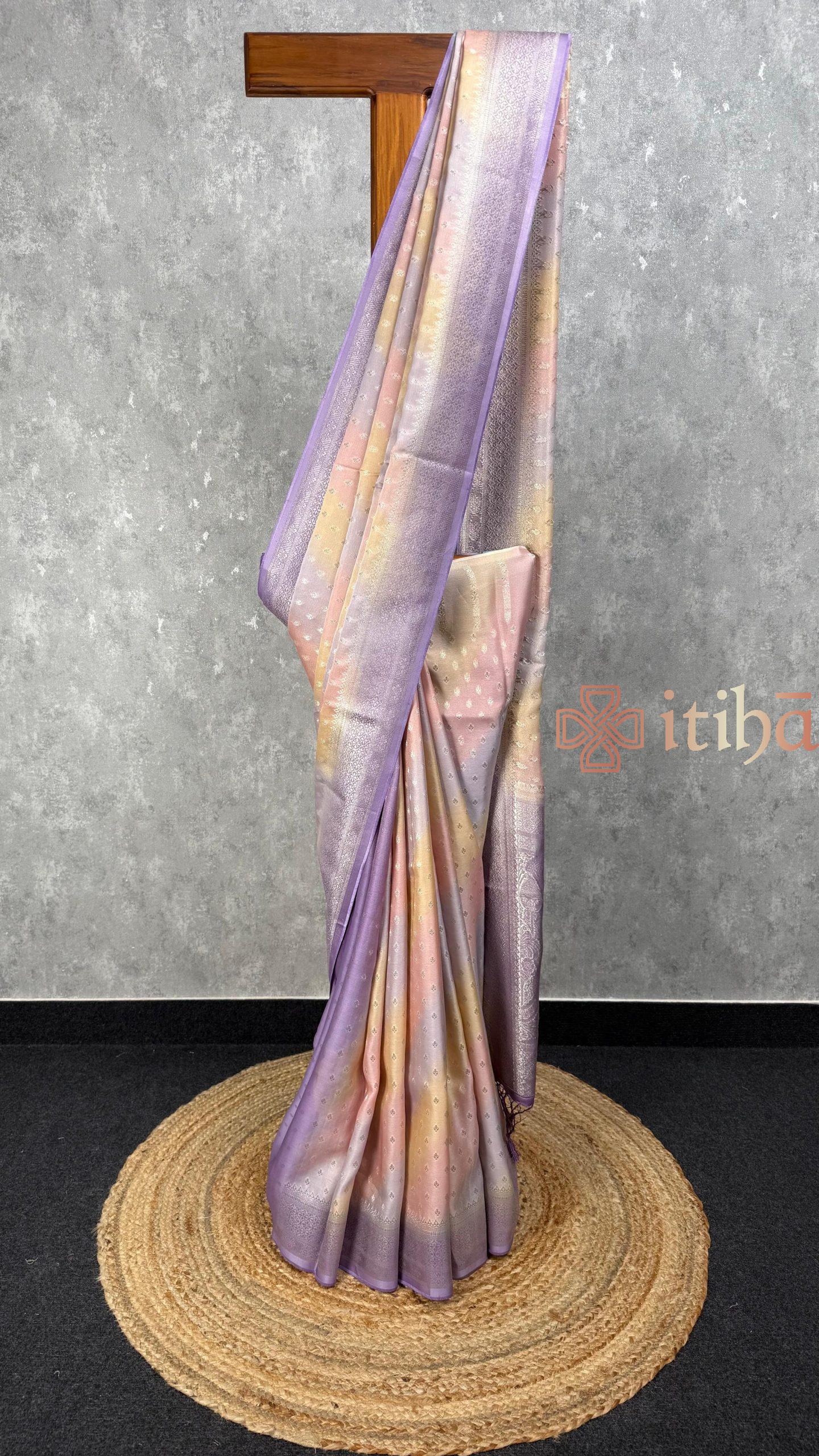 This vibrant Satin Georgette Banarasi Saree showcases a soothing blend of pastel peach, yellow and soft rose pink. Adorned with delicate woven buttas and a richly woven Banarasi border in purple shade, it radiates elegance and charm. The saree comes with attached self color blouse piece.