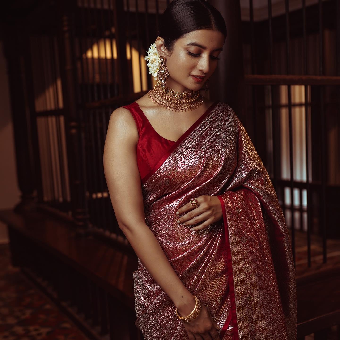 Keep the garment wrapped in cotton fabric. It is advisable to fold your organza saris in a roll for better preservation. Avoid spraying perfume directly onto the garment. Do not use naphthalene balls while storing it. Remove any stains or spots only with white petrol. Store the garment in a moderate climate, as zari can react to weather changes.
