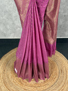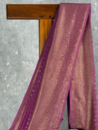 This stunning Semi Georgette Antique Zari Banarasi Saree comes in a vibrant magenta shade, admired with intricate antique gold zari weavings. The saree comes with attached self color blouse piece.