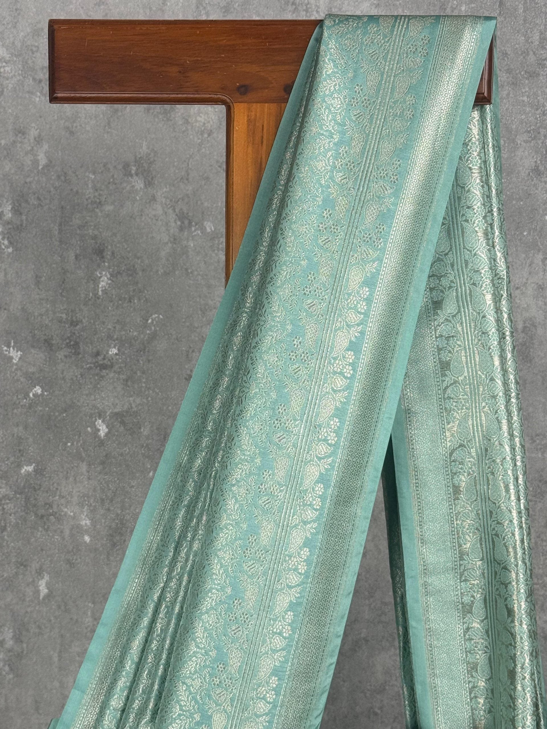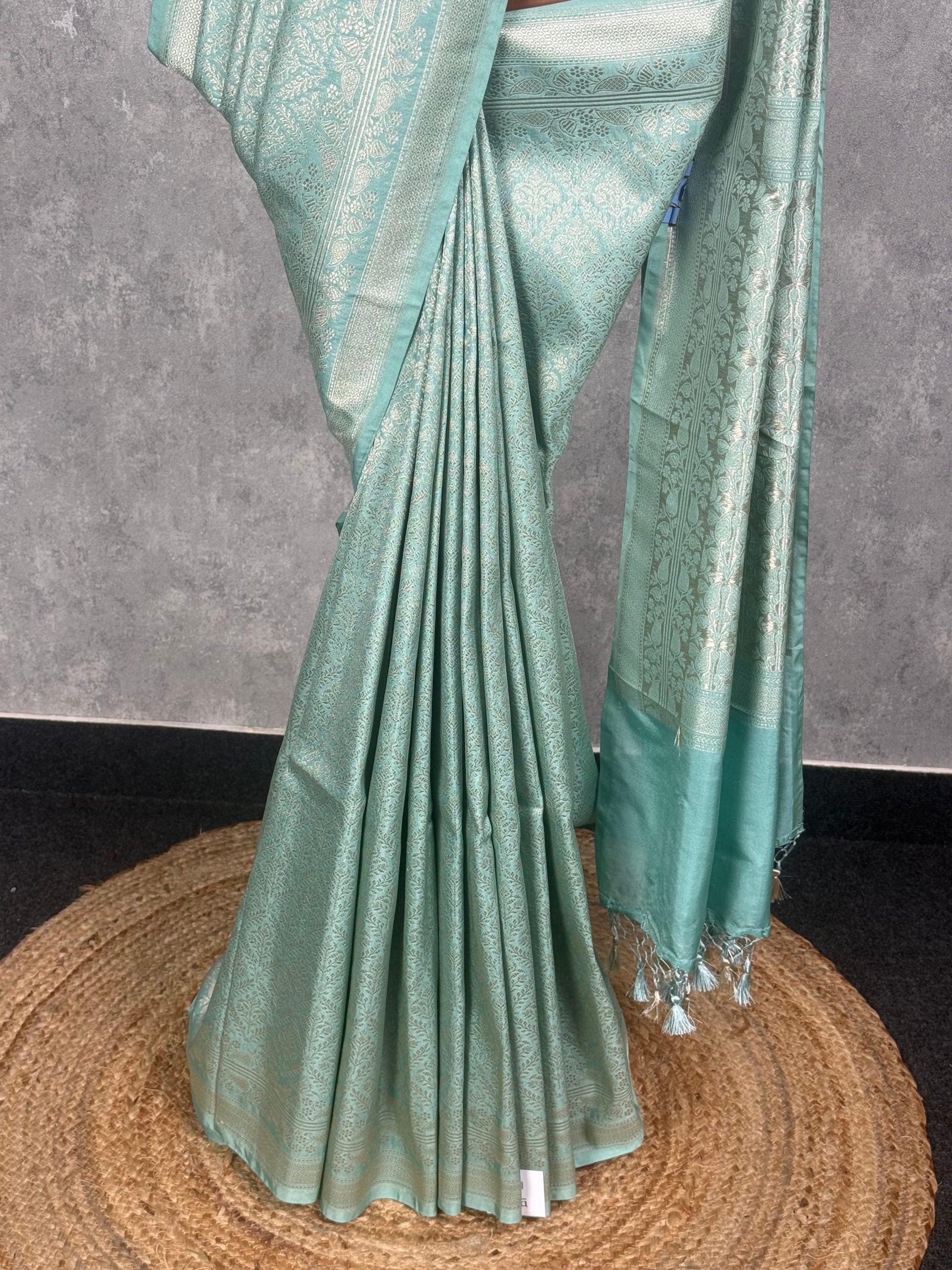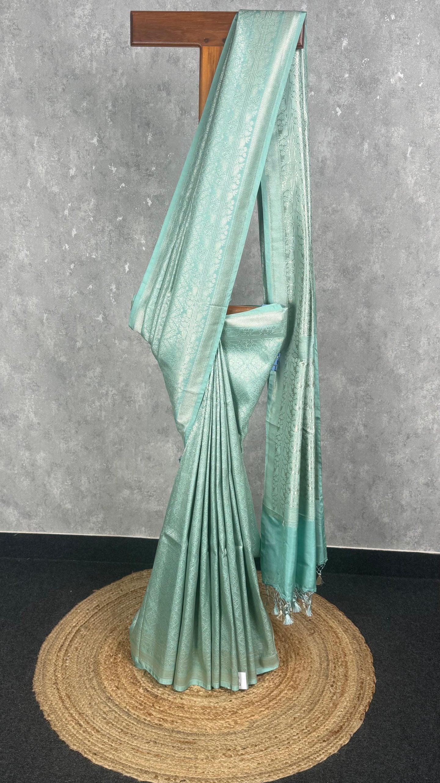 This saree showcases a soothing sea-green hue with a lustrous finish that highlights its intricate woven detailing. The elegant motifs running throughout the drape add a refined traditional charm. Perfect for festive and formal occasions, it brings together grace, sophistication, and timeless beauty.