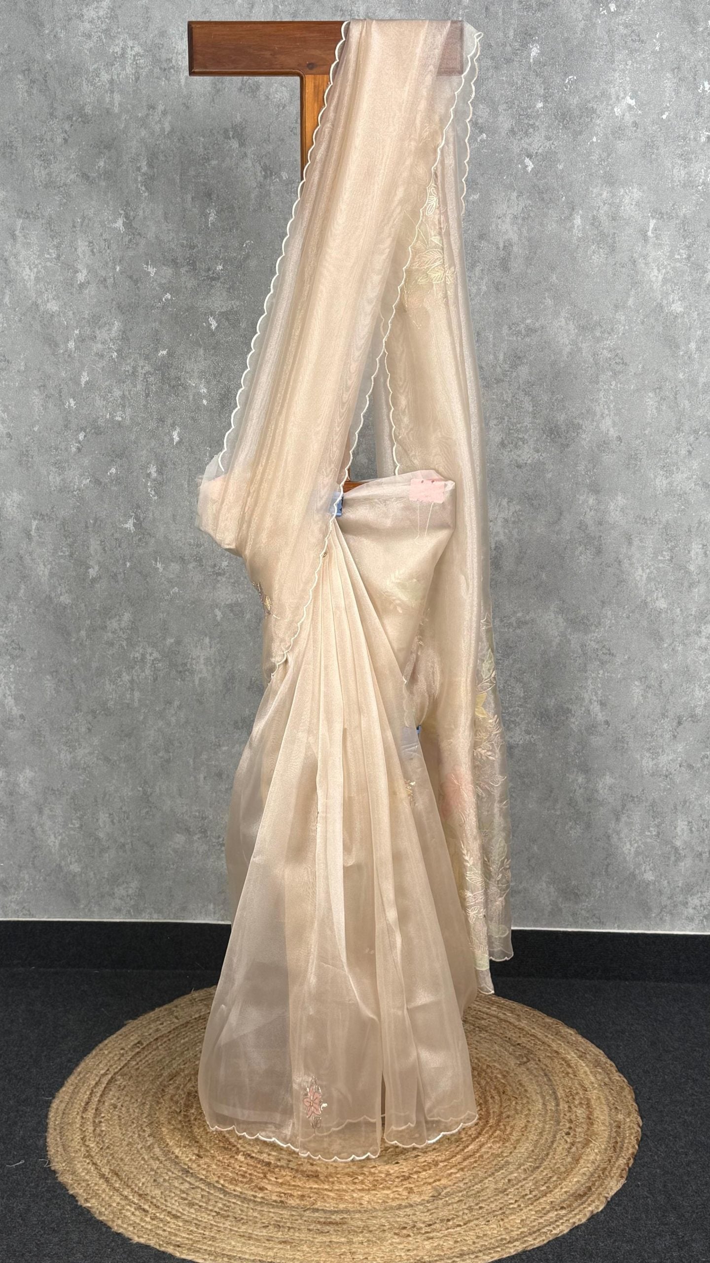 This saree showcases a soft beige-gold tone with a sheer, luminous finish that gives it a delicate and elegant appeal. The scalloped borders add a refined touch, while the subtle floral detailing enhances its graceful charm. Perfect for light festive occasions and daytime celebrations, it offers a beautifully understated, sophisticated look.