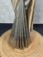 This semi raw silk weaving Banarasi saree features a grey base with intricate gold zari patterns. The saree has a gold border adorned with floral motifs and gold buttis scattered across the body. The pallu showcases a rich gold zari design with floral patterns. The saree is crafted with traditional Banarasi weaving techniques. The saree comes with attached self color blouse piece.