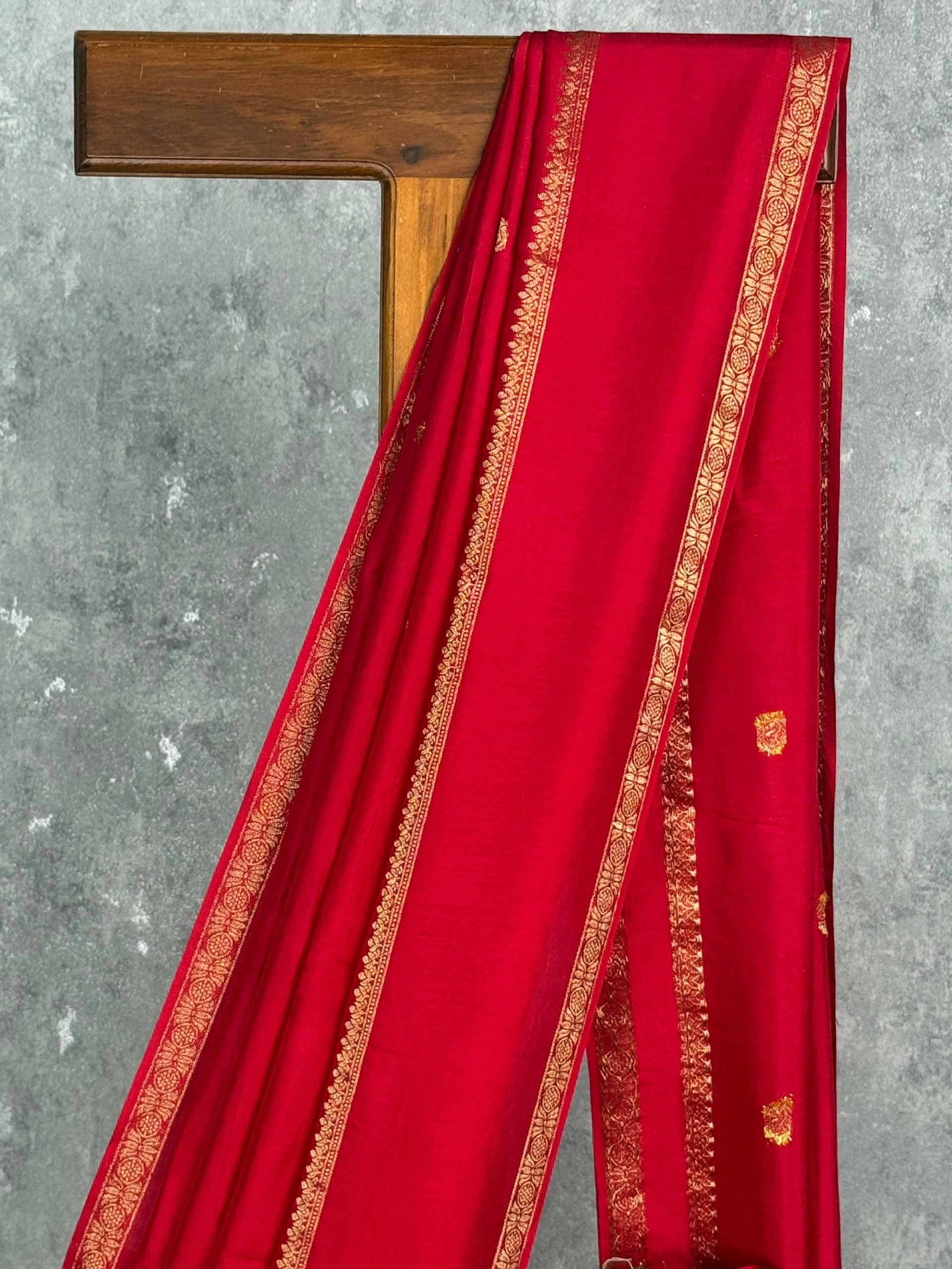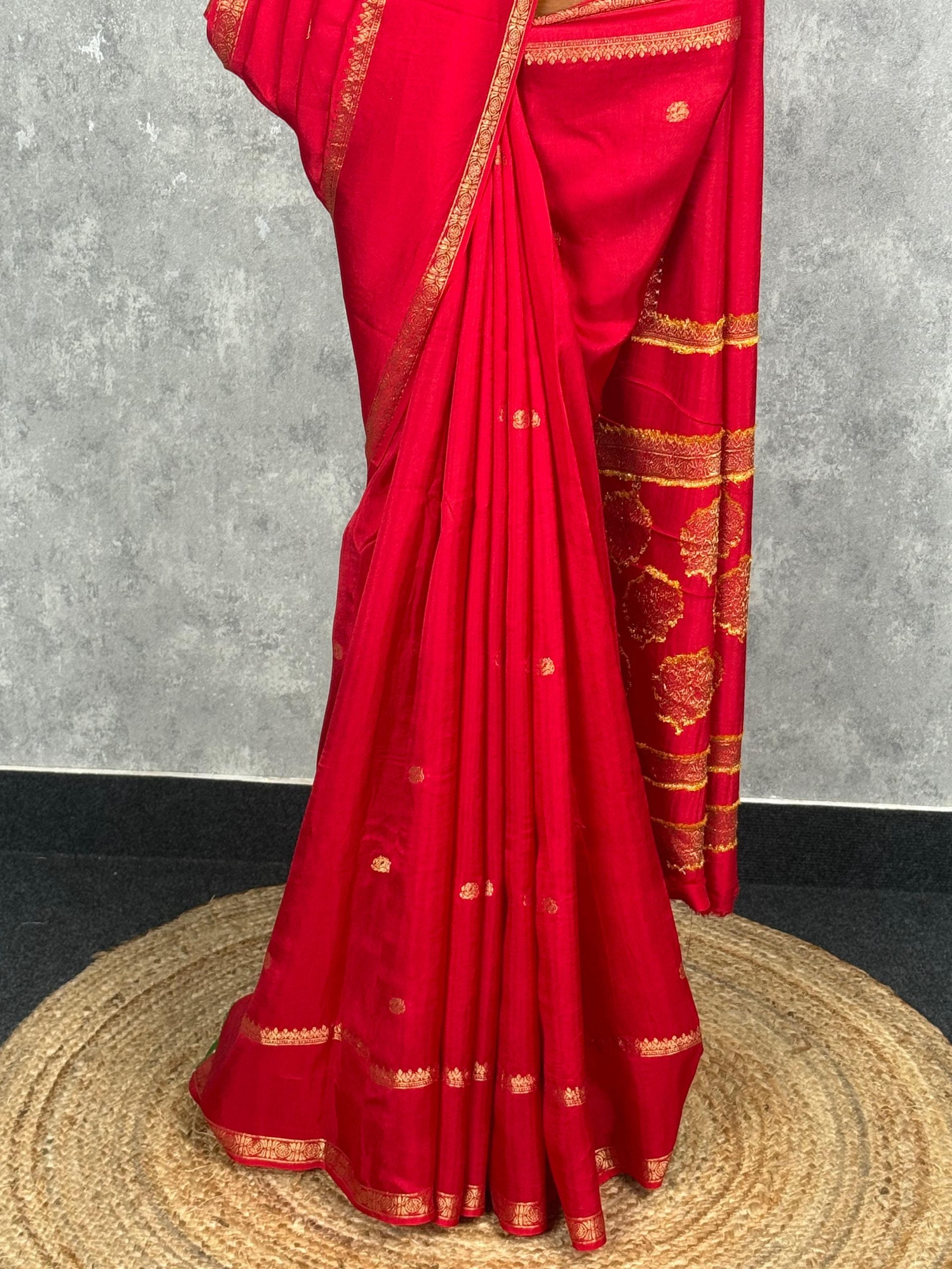 This saree radiates timeless elegance with its rich red shade beautifully complemented by intricate golden zari work. The traditional motifs and detailed borders add a regal charm, making it perfect for festive occasions and grand celebrations. Its classic appeal and vibrant color make it a standout choice for any special event.