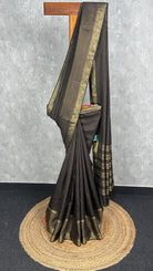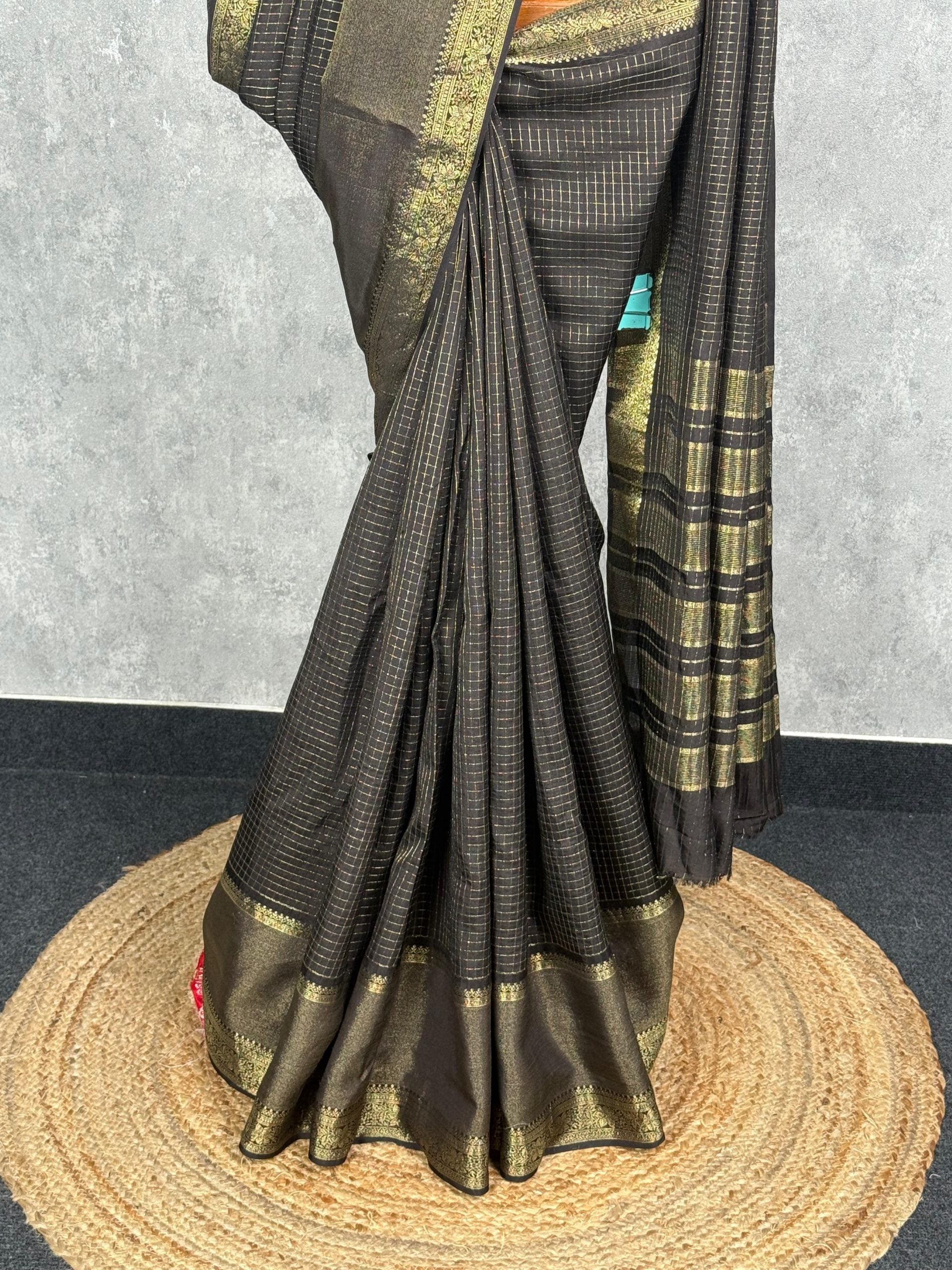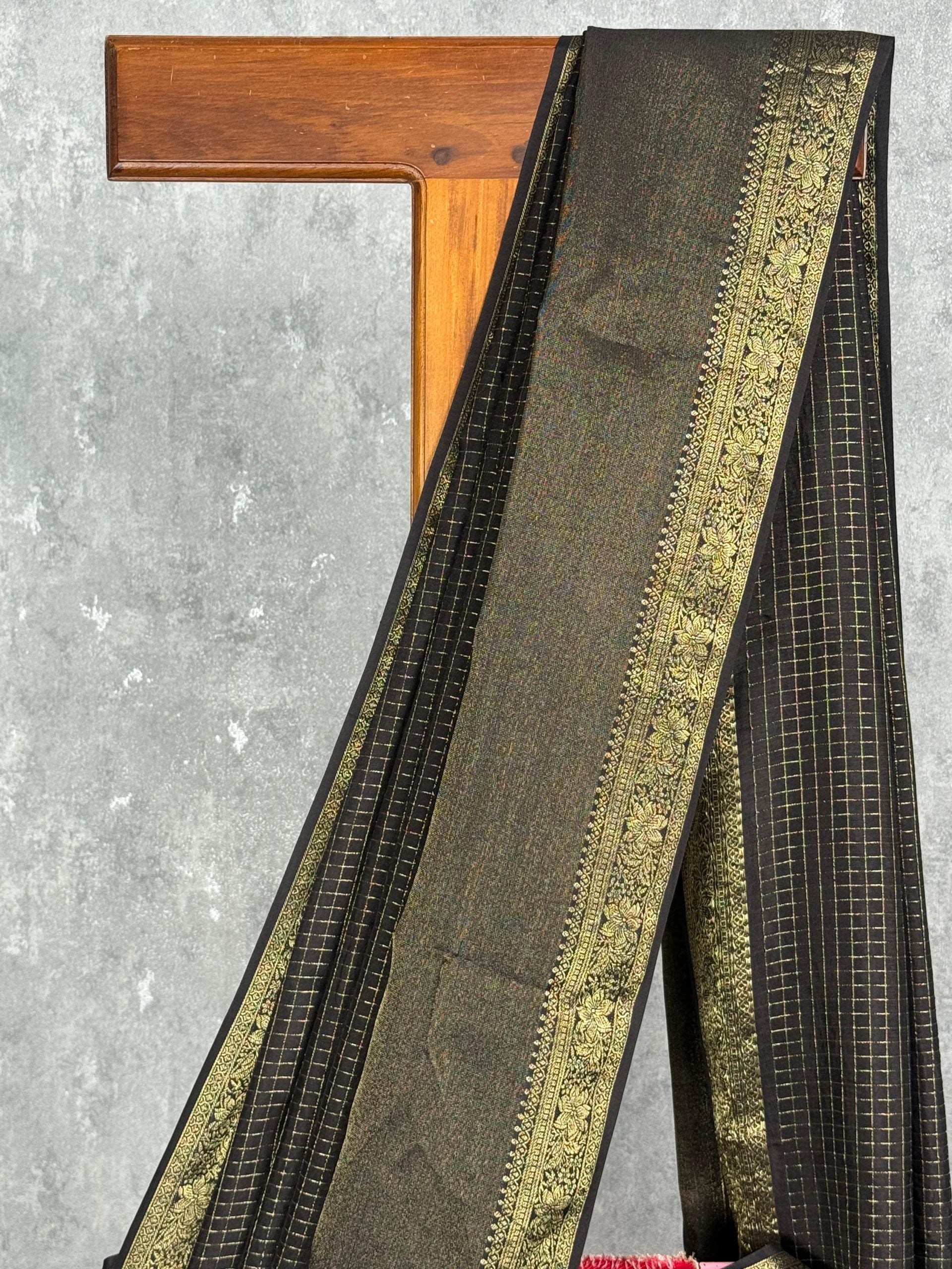 This saree showcases a rich and elegant combination of deep black with antique gold detailing, creating a timeless and regal appeal. The subtle checked pattern paired with the intricate golden borders adds sophistication and depth to its look. Perfect for festive occasions and evening events, it embodies classic charm with a modern touch.