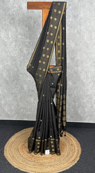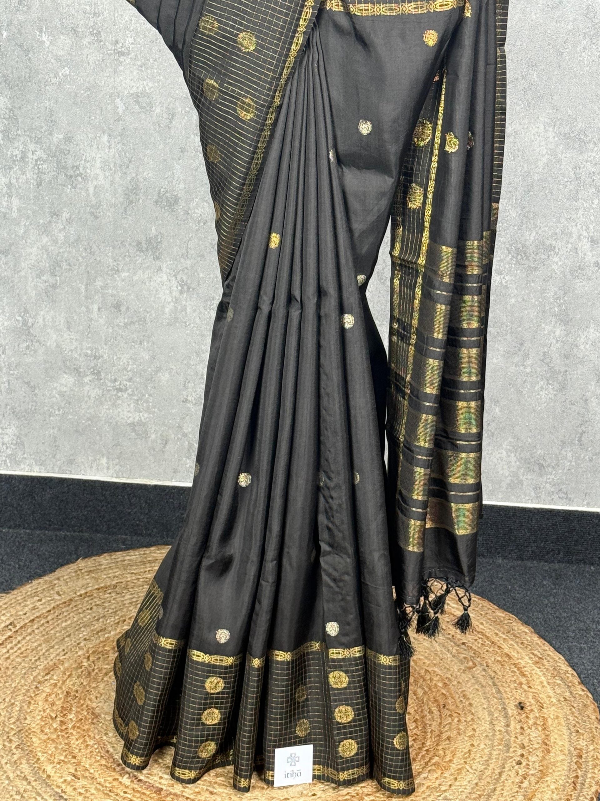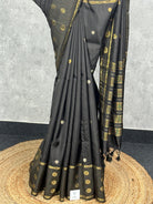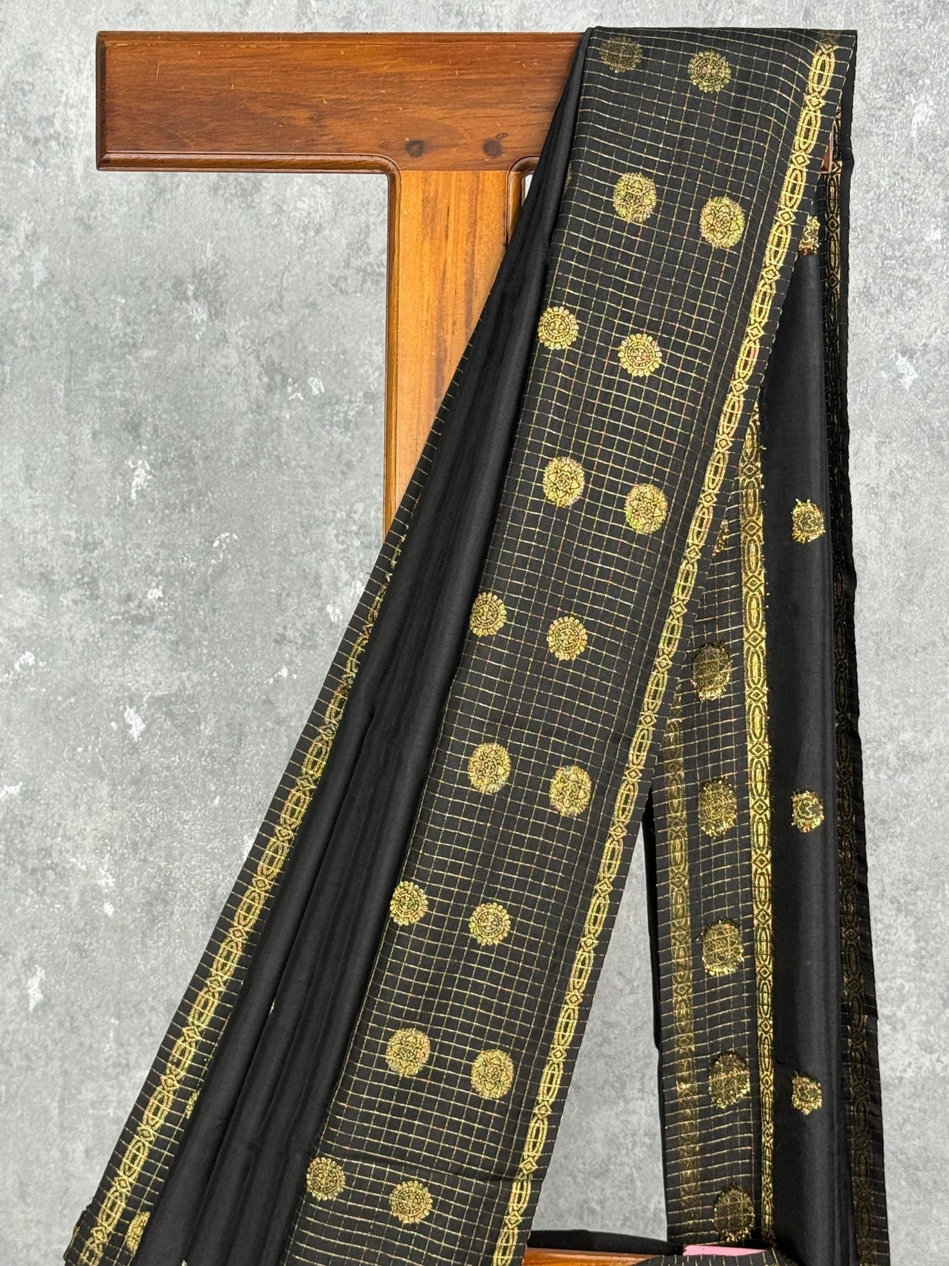 This saree exudes timeless sophistication with its deep black base enriched by intricate gold zari motifs. The grid-patterned pallu and ornate border add a regal touch, making it perfect for festive occasions and elegant evening events. Its rich contrast and classic detailing create a truly striking look.
