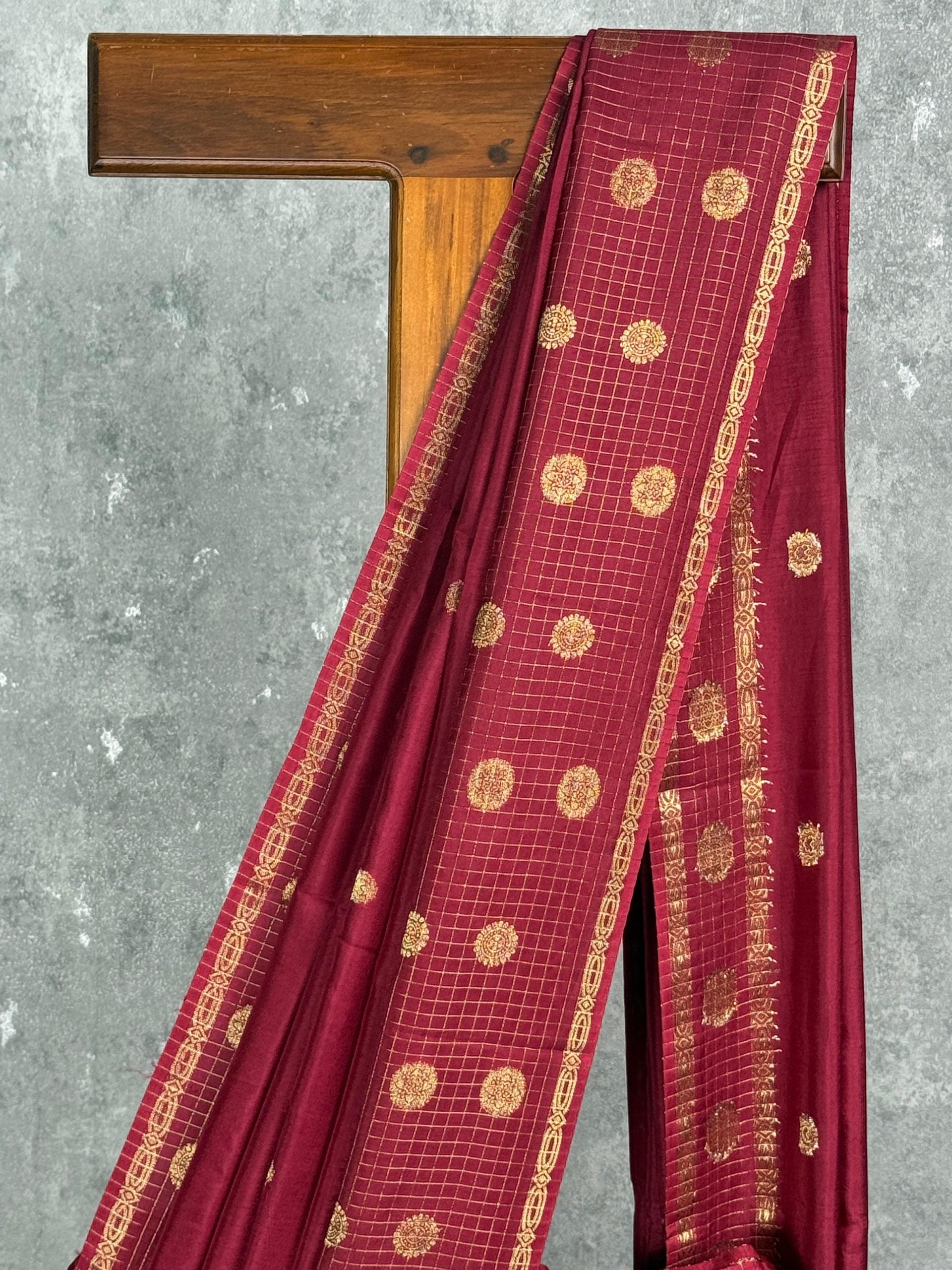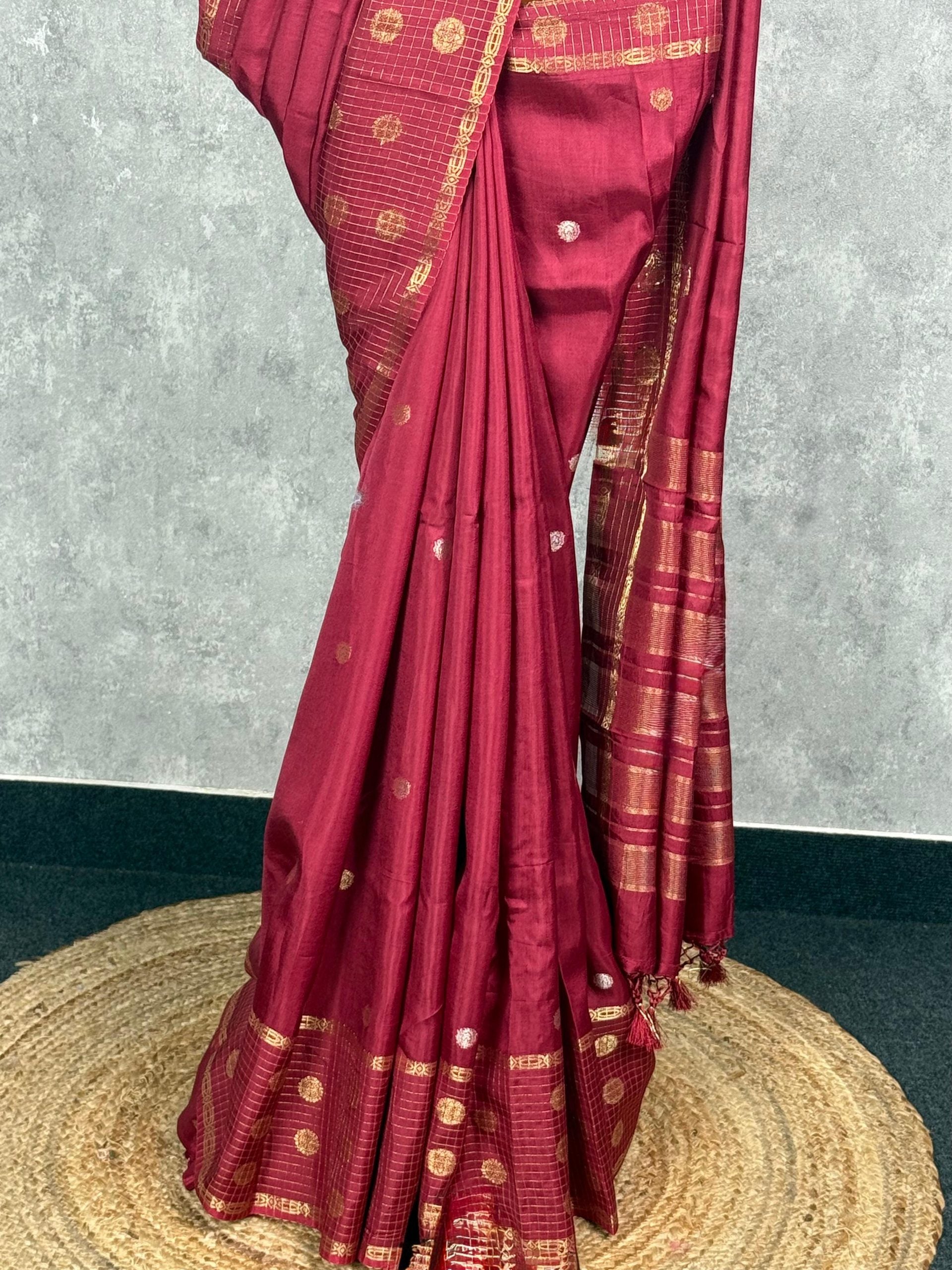 This saree features a rich maroon hue adorned with classic gold zari motifs that bring out its regal charm. The checkered pallu and intricately woven border add a traditional touch, making it perfect for festive occasions and cultural celebrations. Its elegant drape and timeless appeal make it an exquisite addition to any wardrobe.