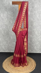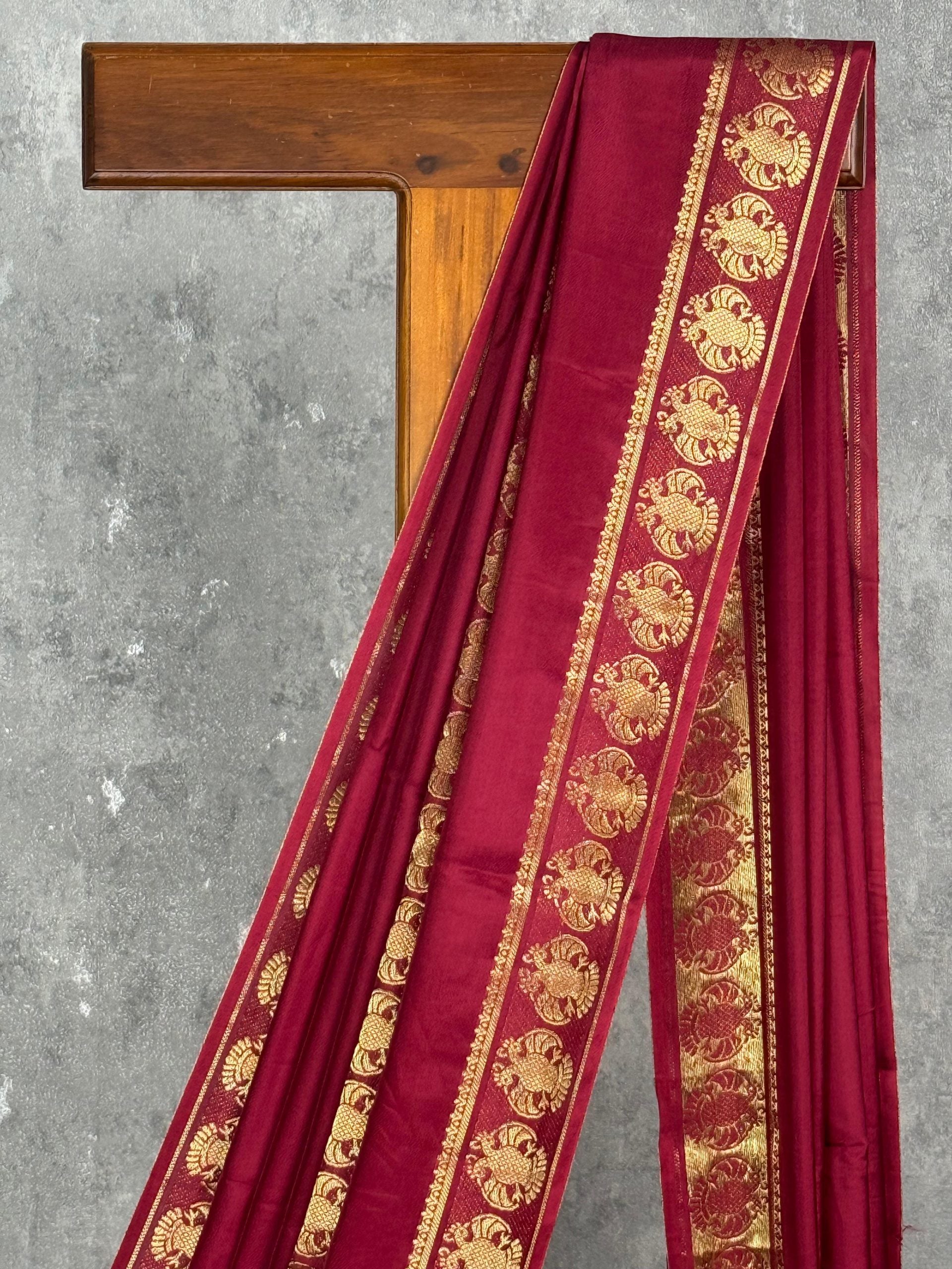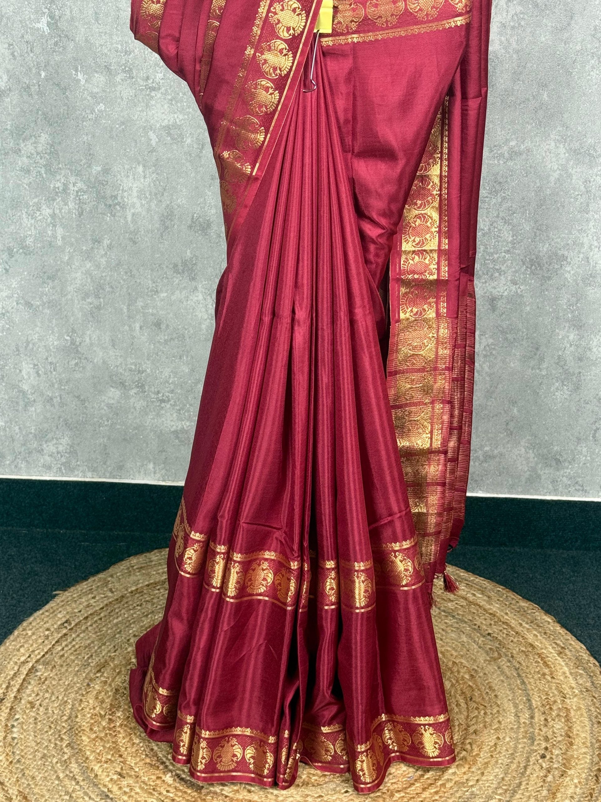 This saree shines in a rich wine-maroon shade, beautifully accented with intricate gold zari motifs that add a regal touch. The broad ornamental borders and detailed pallu elevate its traditional elegance, making it perfect for weddings and festive occasions. With its luxurious sheen and graceful drape, it creates a timeless and sophisticated look.