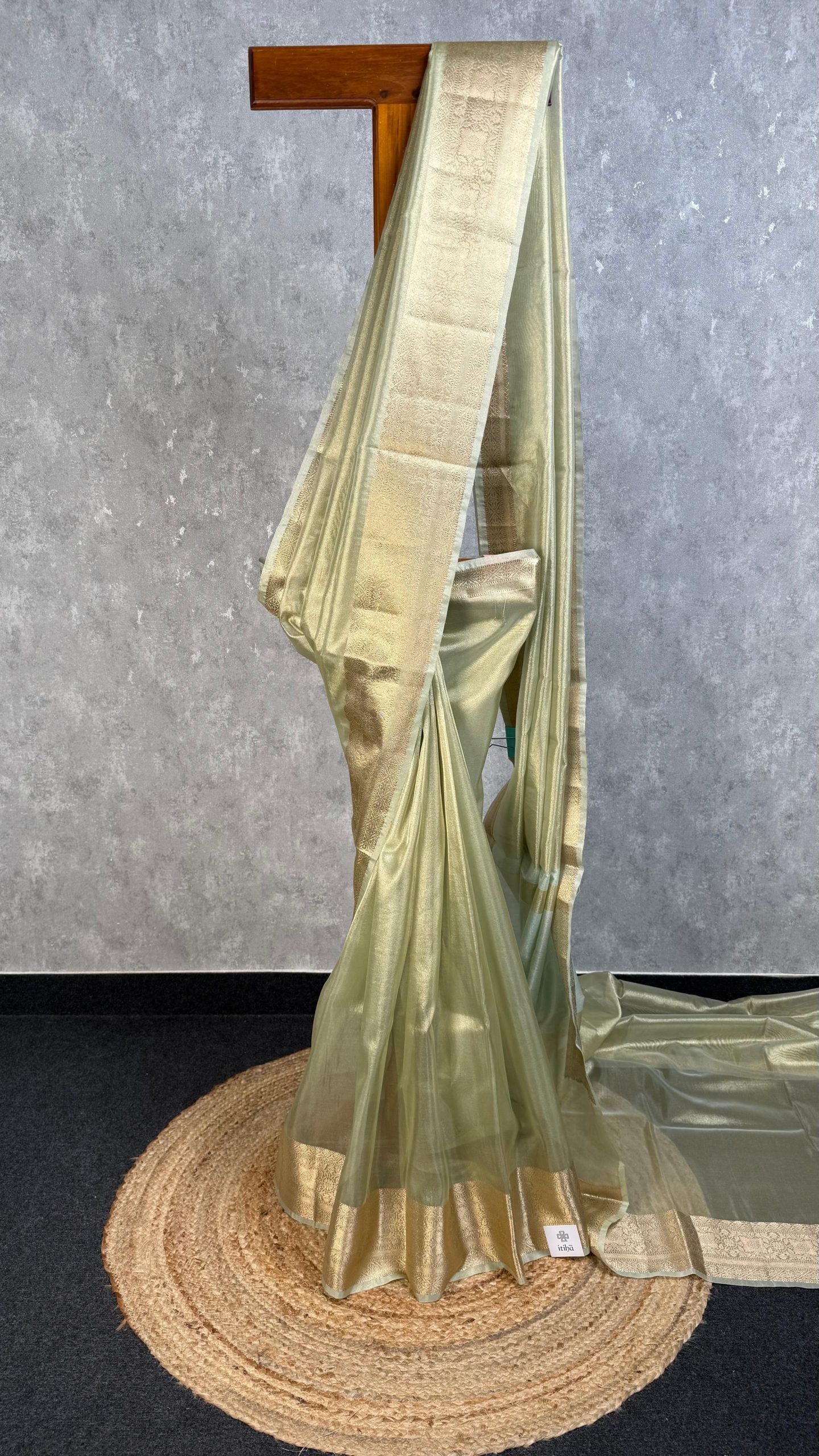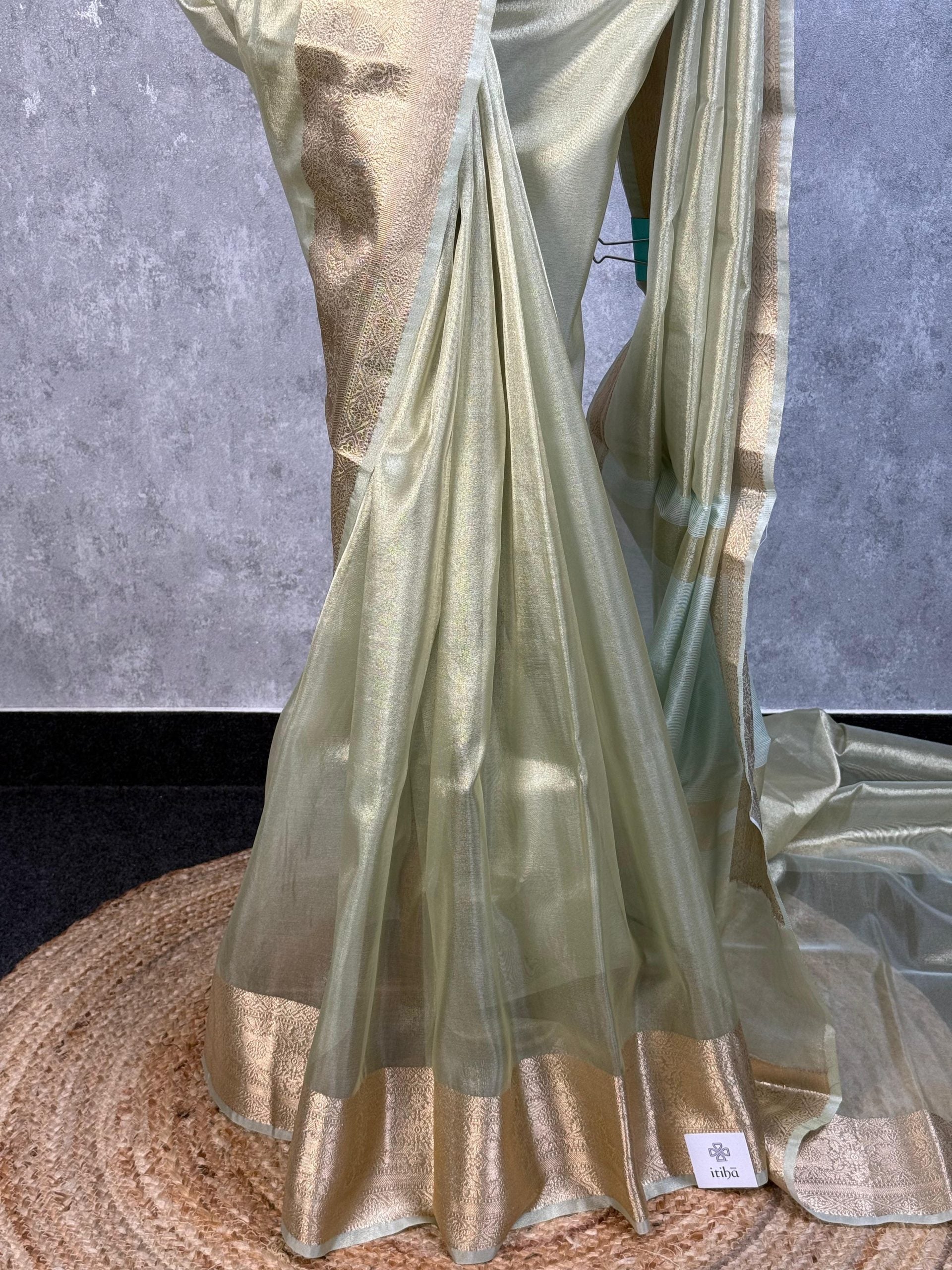This semi tissue organza Banarasi saree features a light green colour with gold stripes and patterns throughout the fabric. The saree has a subtle yet elegant design with gold accents adding a touch of sophistication. The semi tissue organza material gives the saree a lightweight and airy feel. The saree showcases traditional Banarasi craftsmanship with its intricate gold patterns.The saree comes with attached self color blouse piece.