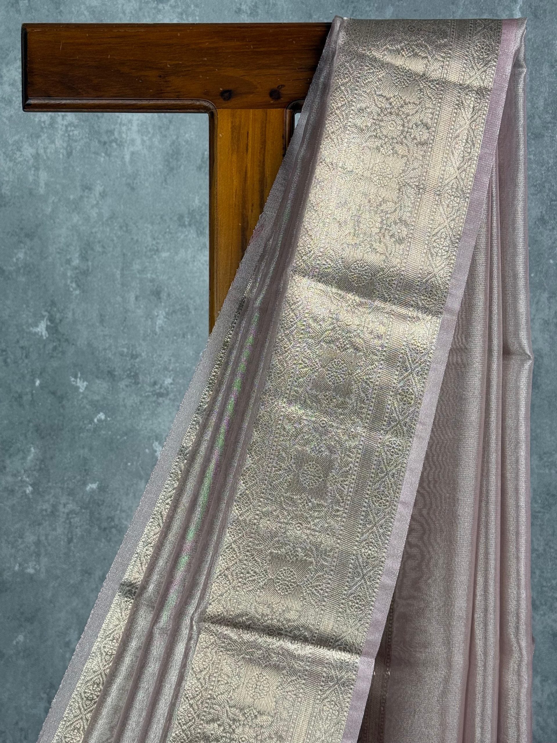 This semi tissue organza Banarasi saree features a golden lilac colour with gold stripes and patterns throughout the fabric. The saree has a subtle yet elegant design with gold accents adding a touch of sophistication. The semi tissue organza material gives the saree a lightweight and airy feel. The saree showcases traditional Banarasi craftsmanship with its intricate gold patterns.The saree comes with attached self color blouse piece.