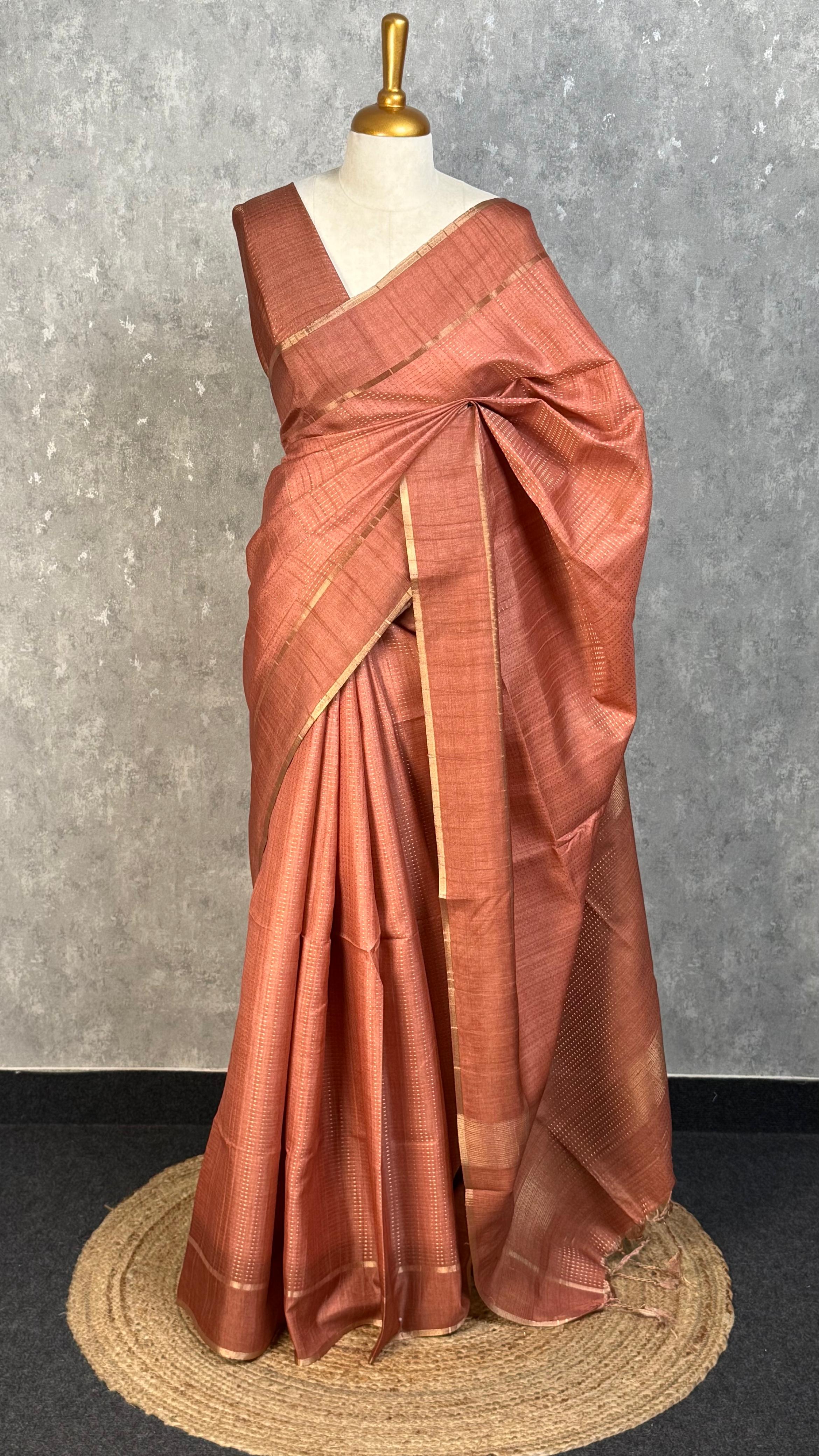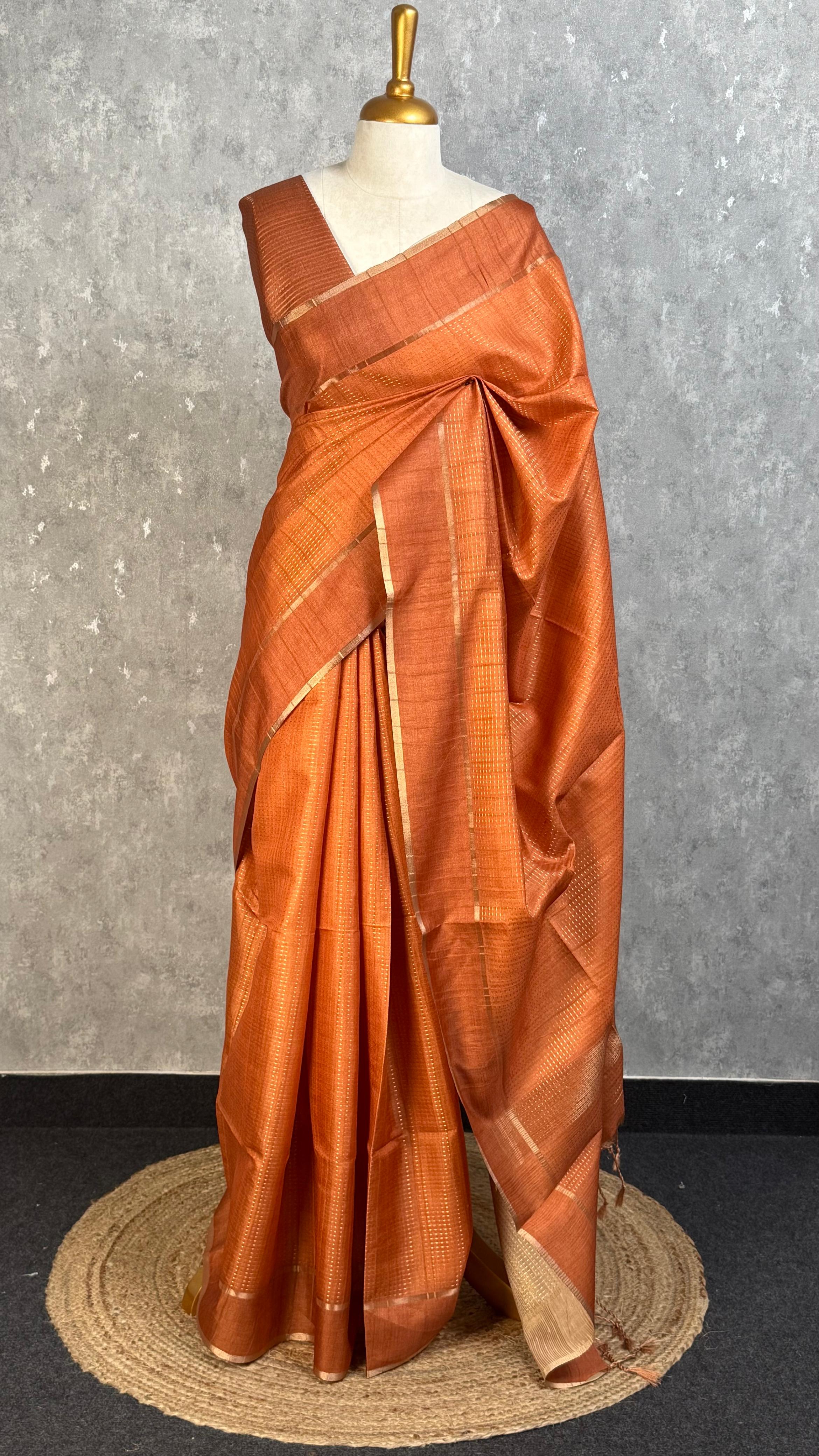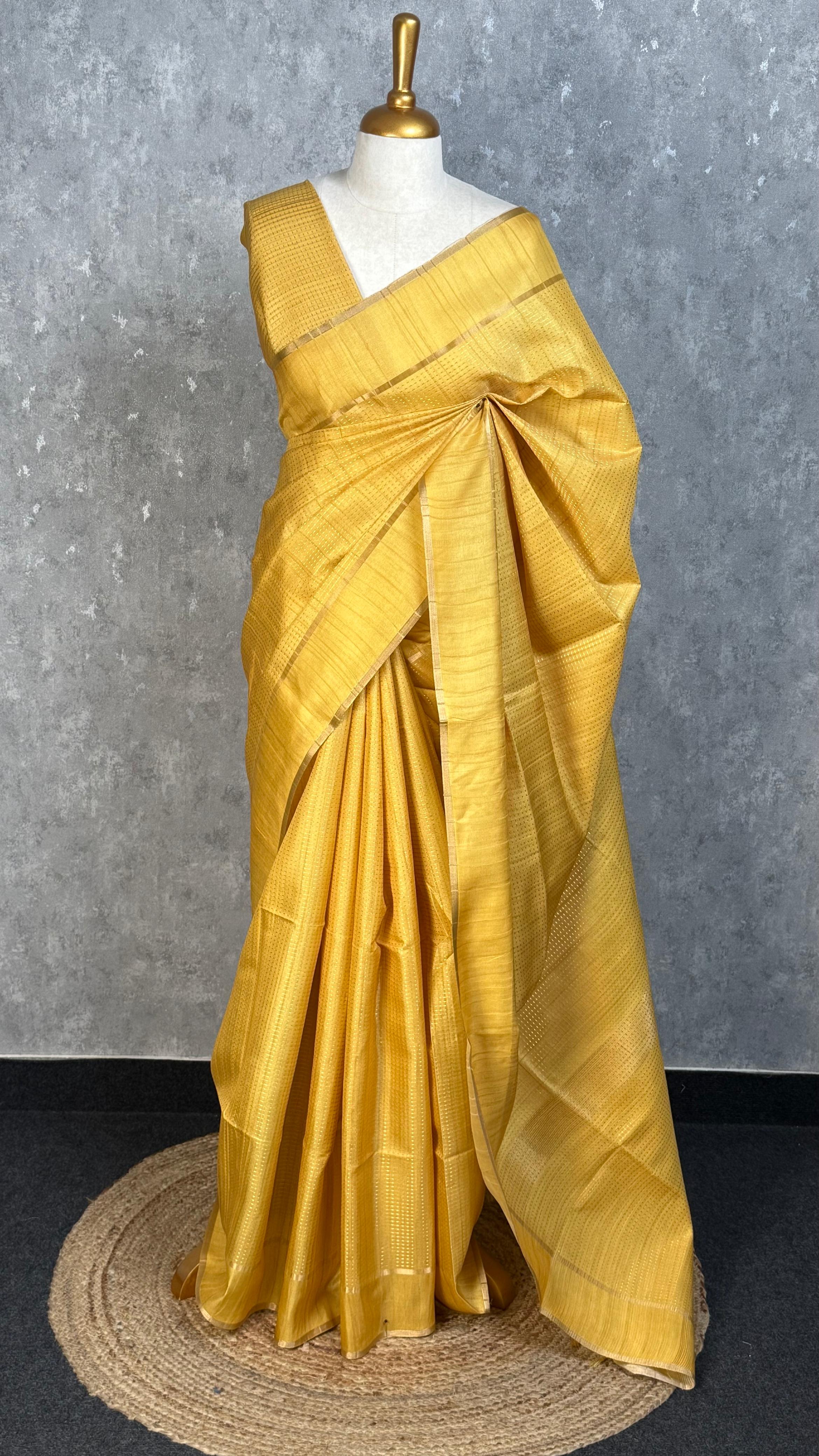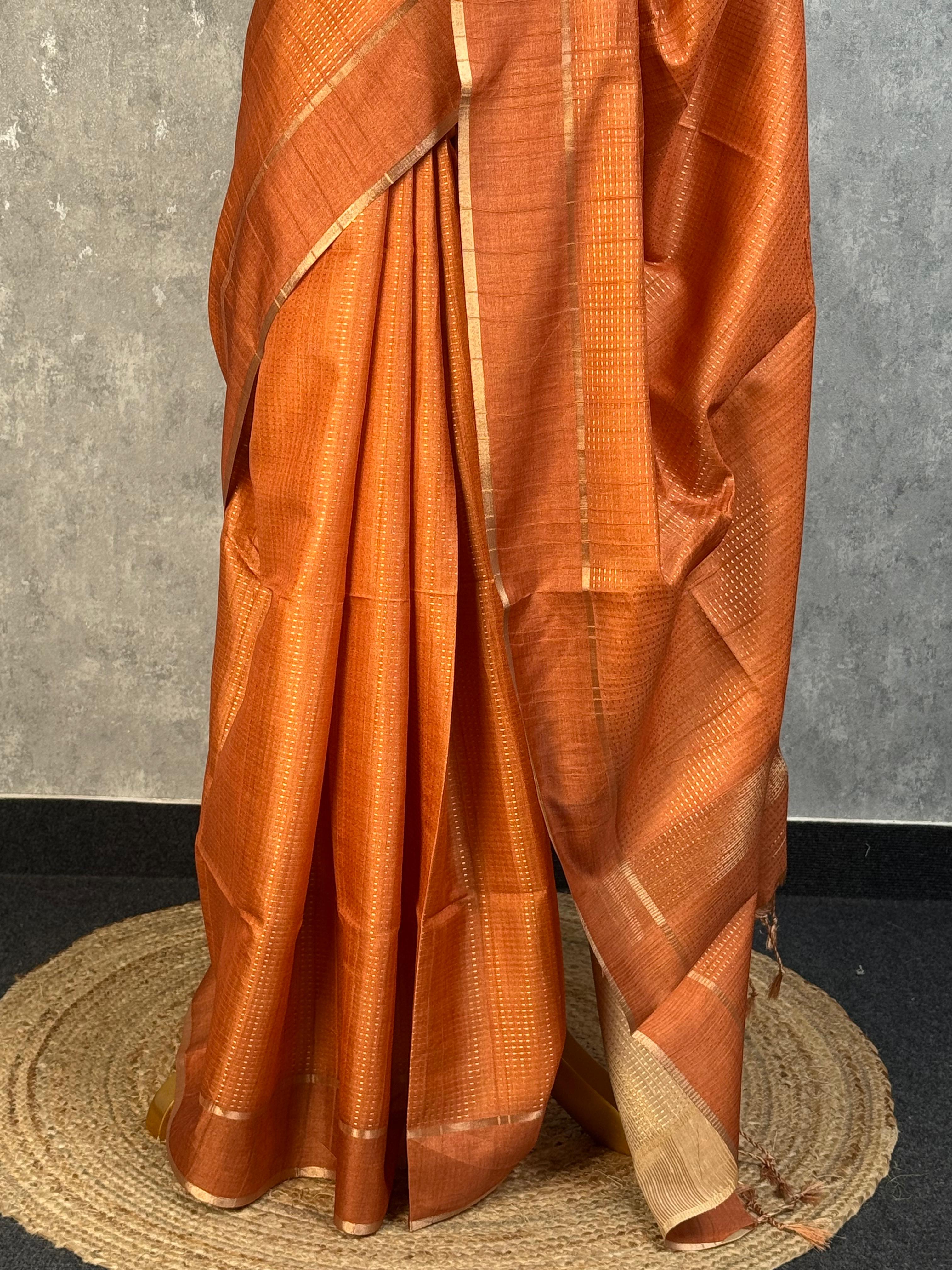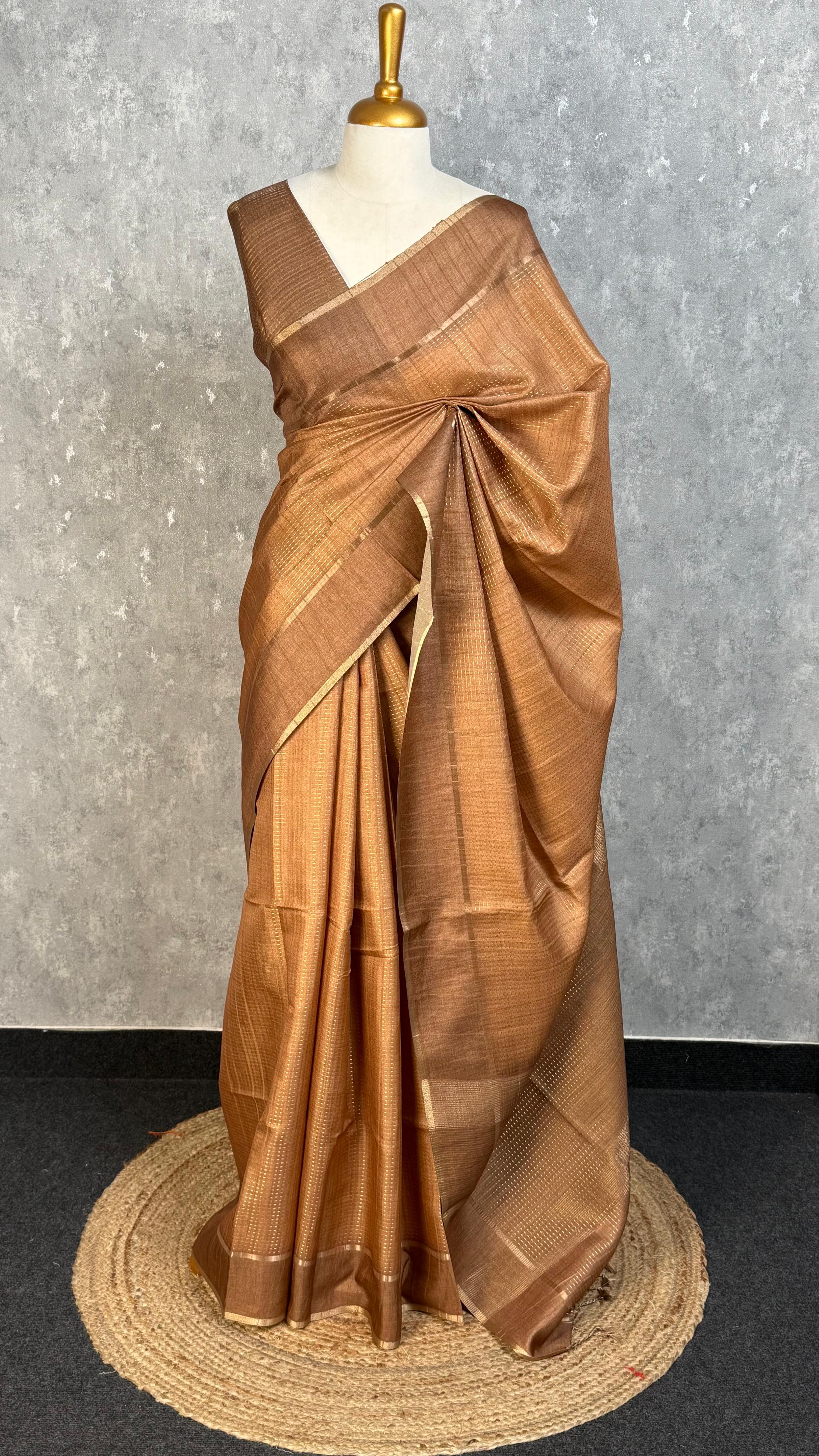 Drape yourself in timeless elegance with this Semi Tussar Banarasi saree, where traditional craftsmanship meets contemporary style. Woven with the finest semi tussar silk and adorned with intricate Banarasi patterns, this saree is perfect for weddings, festivals, and special celebrations. Experience the luxurious feel and graceful drape that makes every moment memorable.