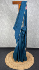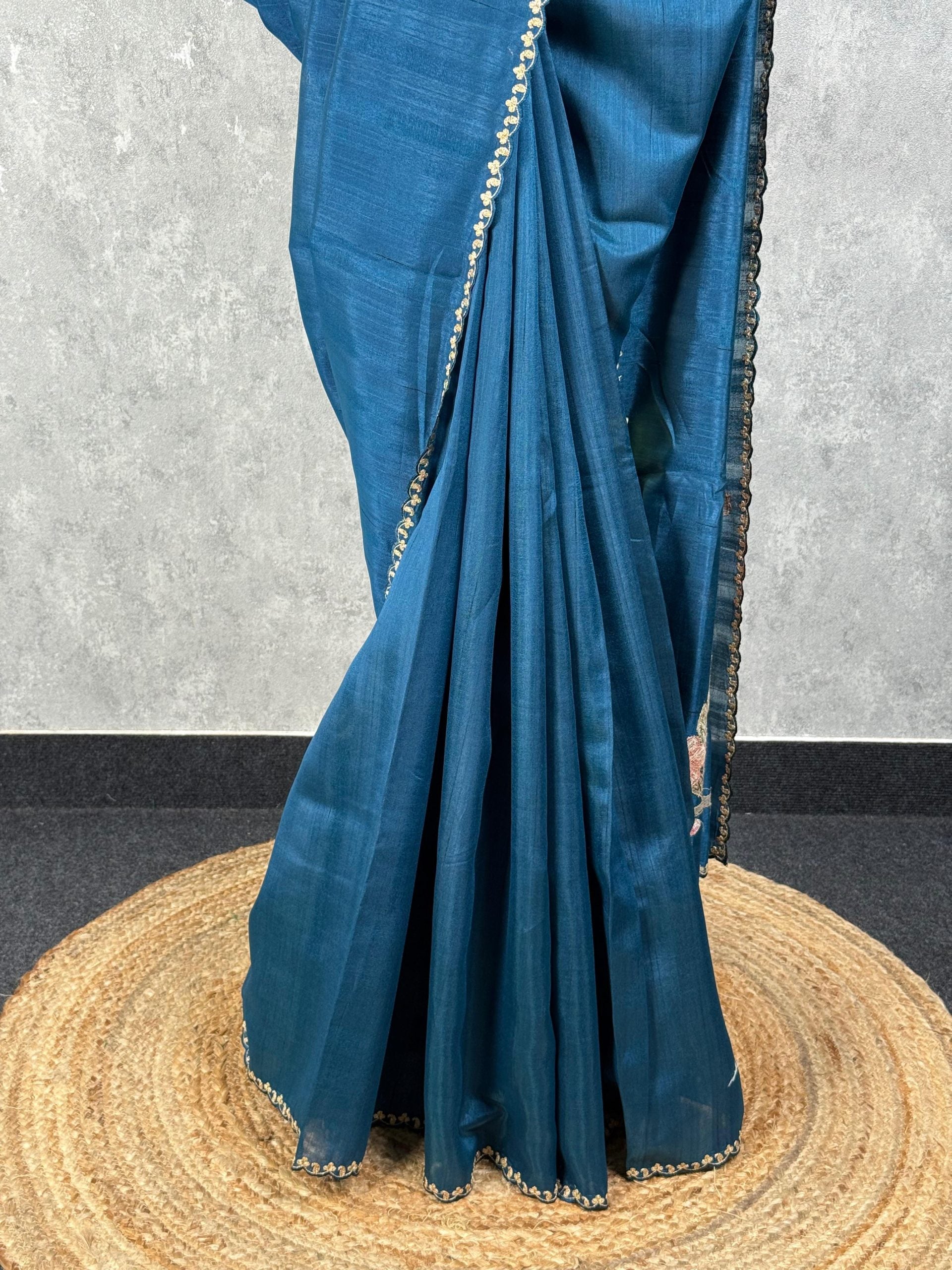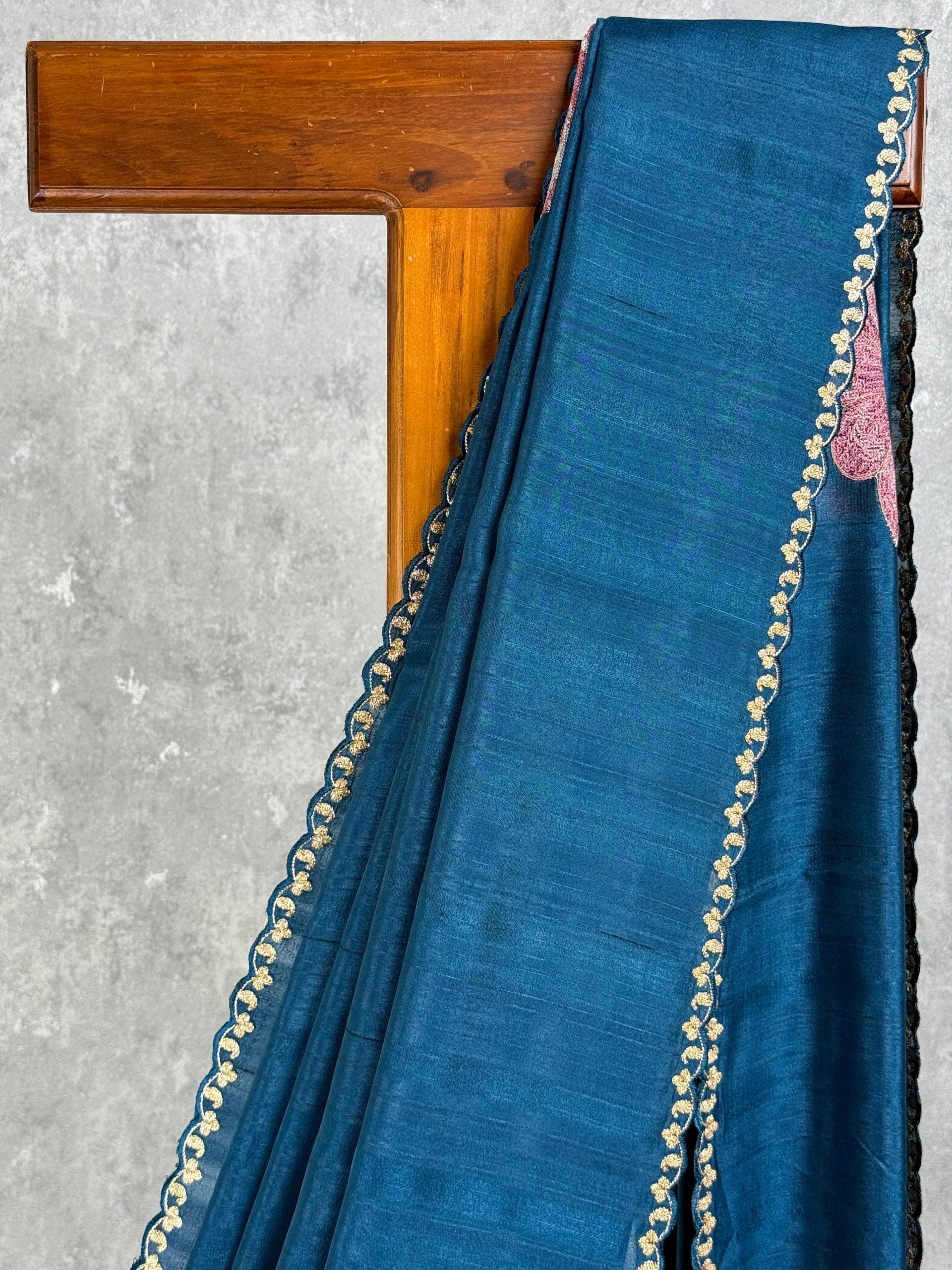 The saree is a beautiful teal blue color with intricate gold trim along the edges. The pallu features delicate floral embroidery, adding a touch of elegance to the overall design. The semi Tussar fabric gives the saree a soft and luxurious texture, making it perfect for special occasions. The saree comes with attached blouse piece.
