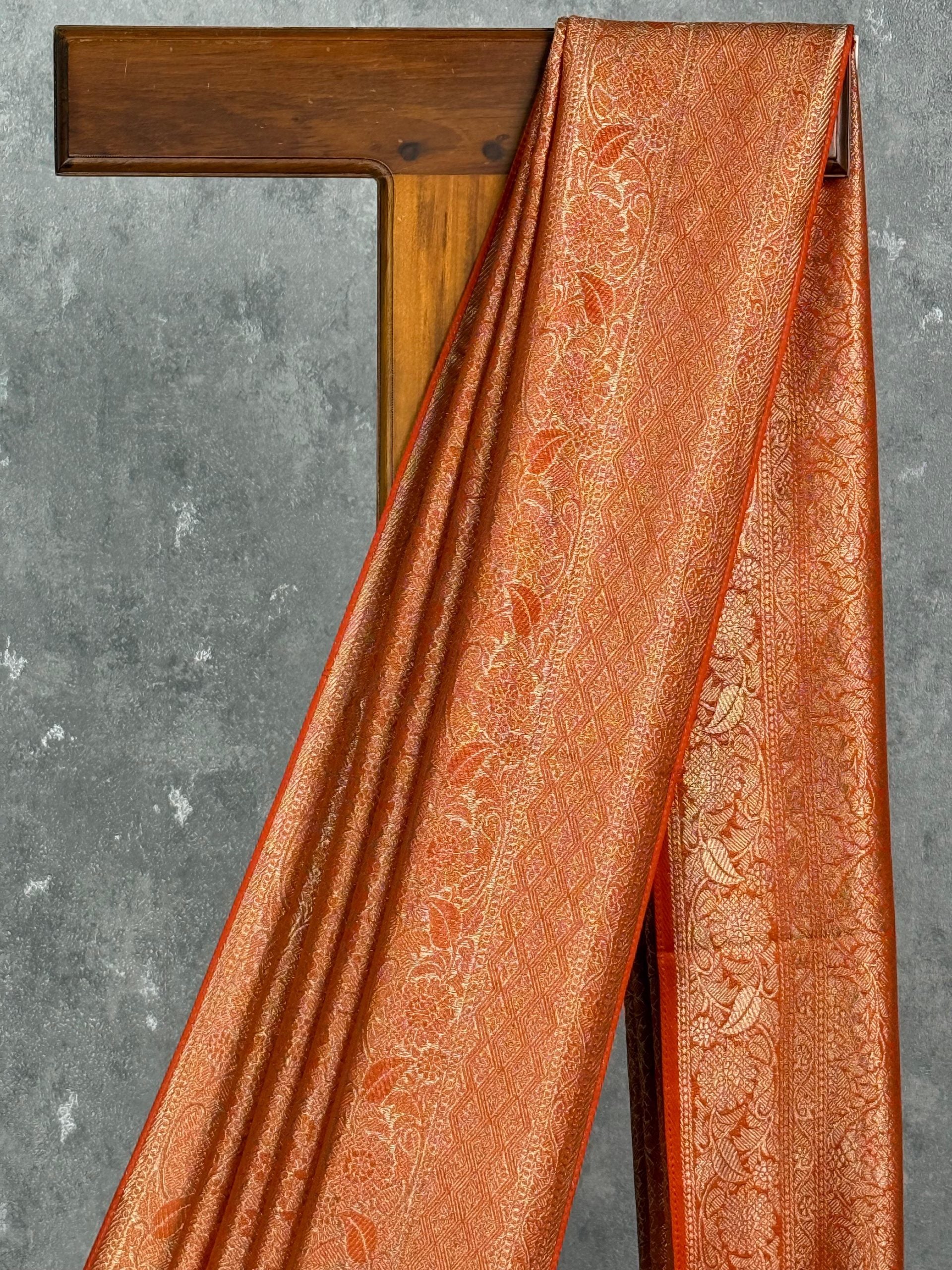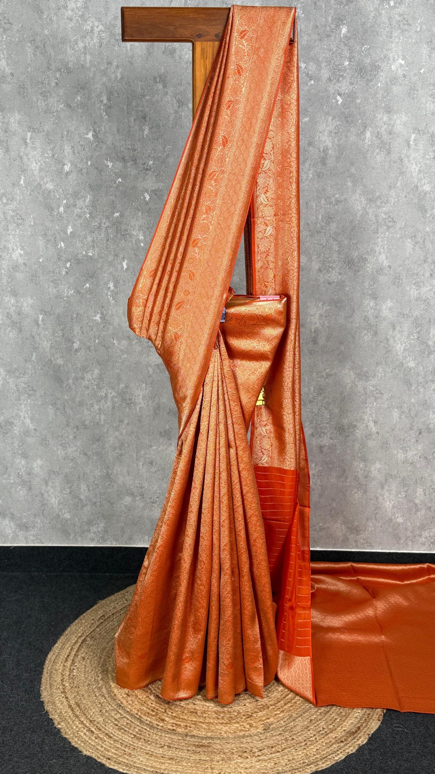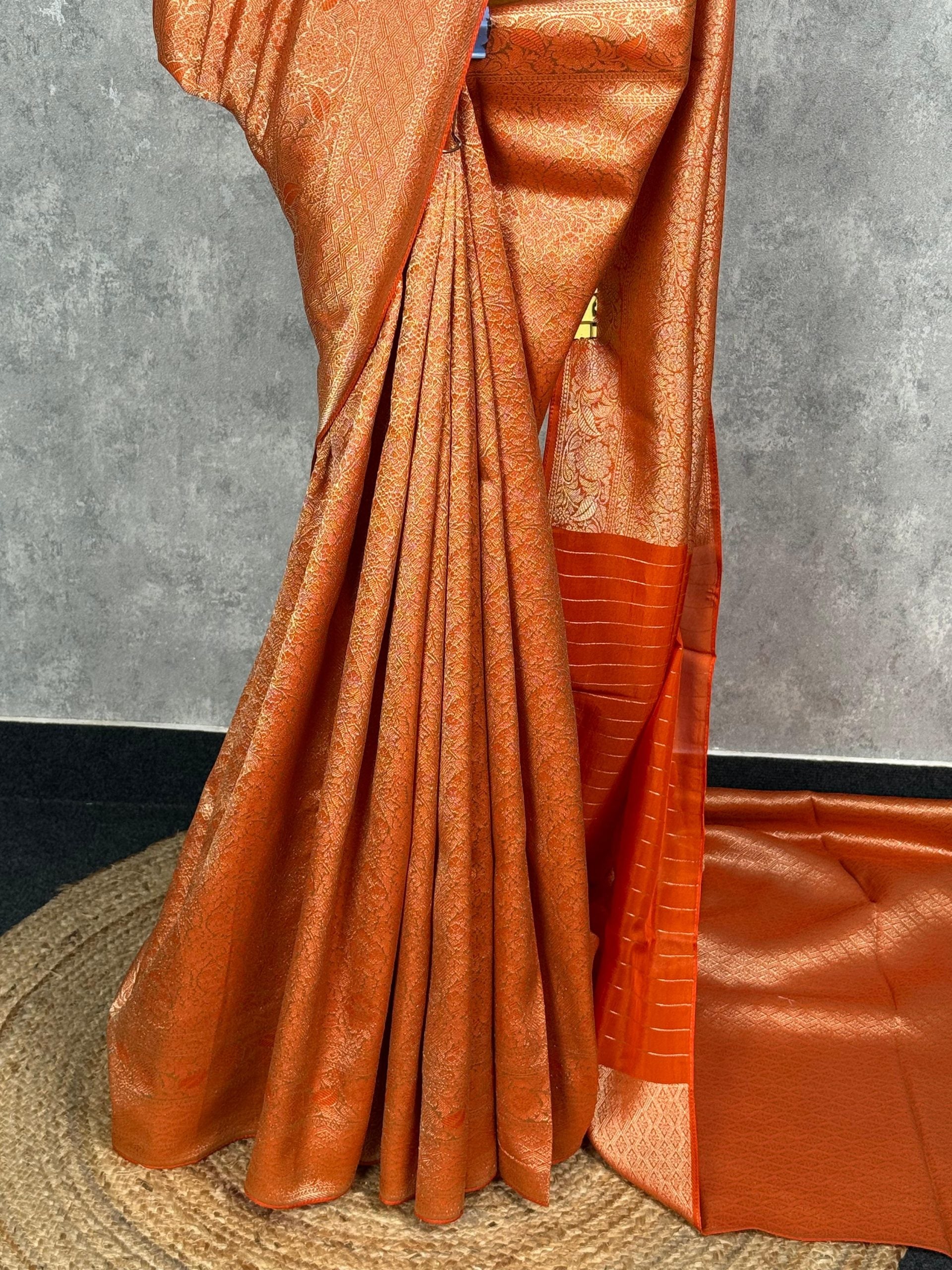 This elegant saree showcases a rich orange hue with intricate zari weaving that adds a beautiful, traditional charm. The subtle floral and geometric patterns enhance its luxurious texture, making it perfect for festive celebrations or special occasions. Its refined drape and luminous finish give it a timeless, graceful appeal.