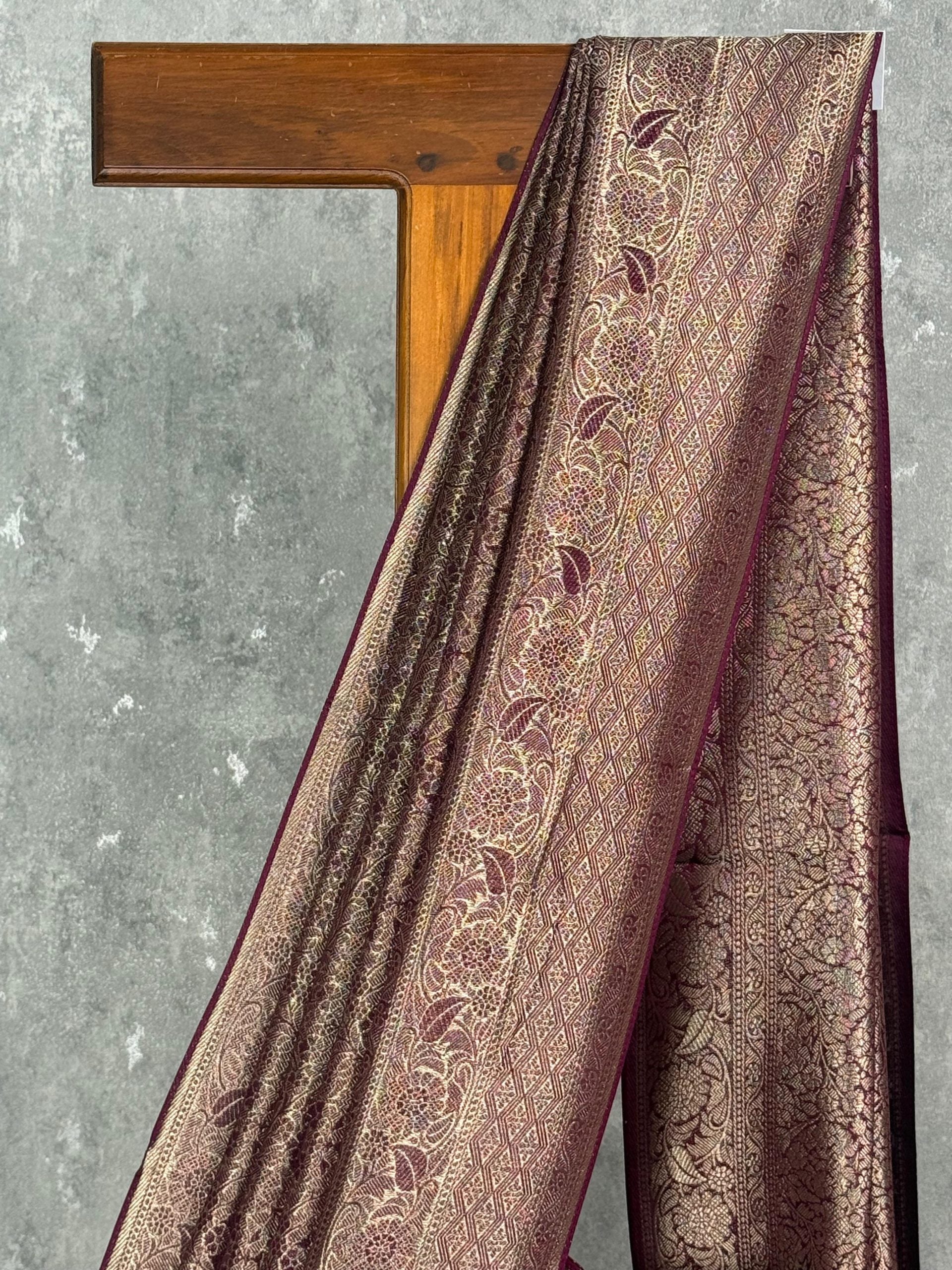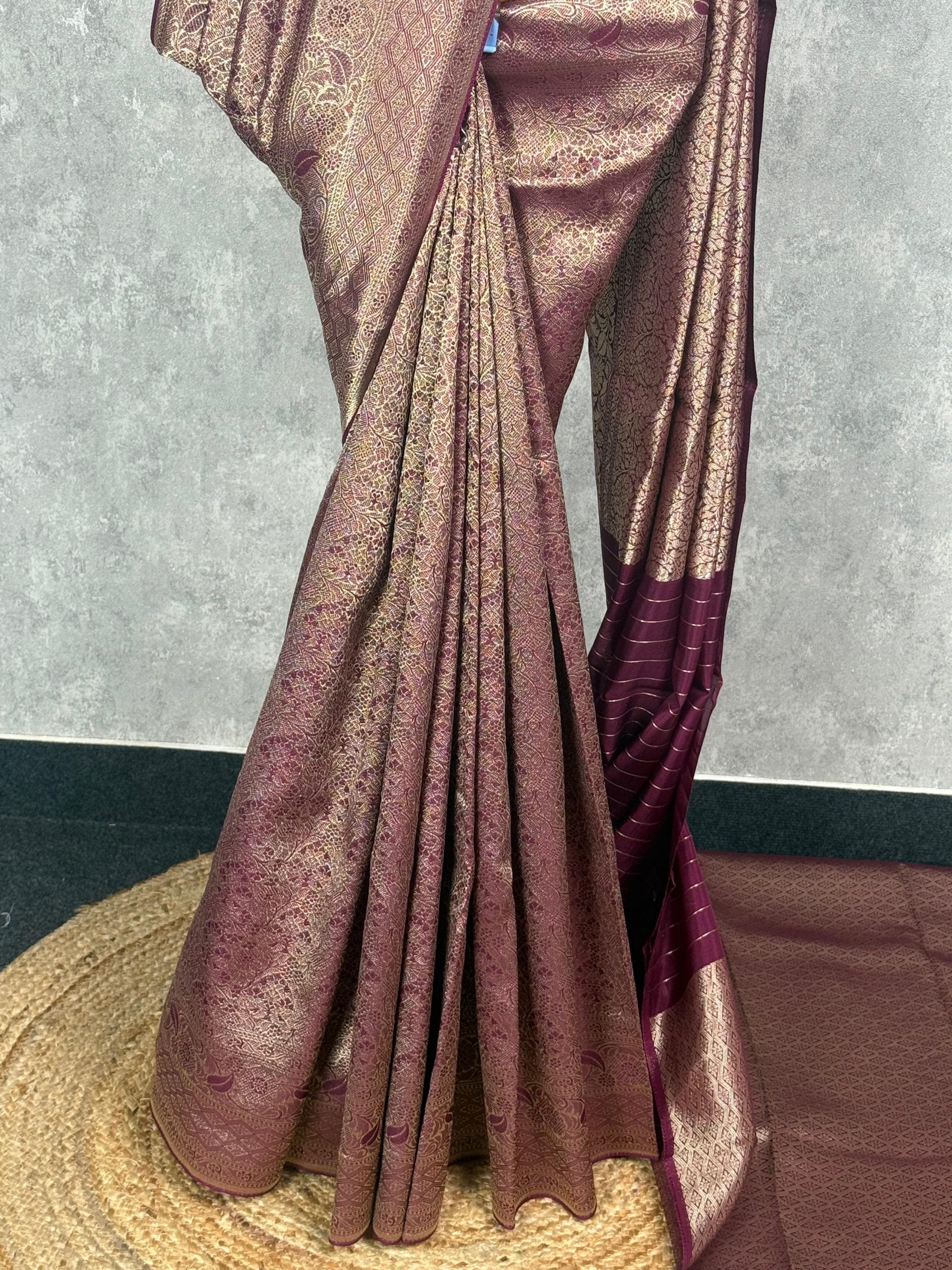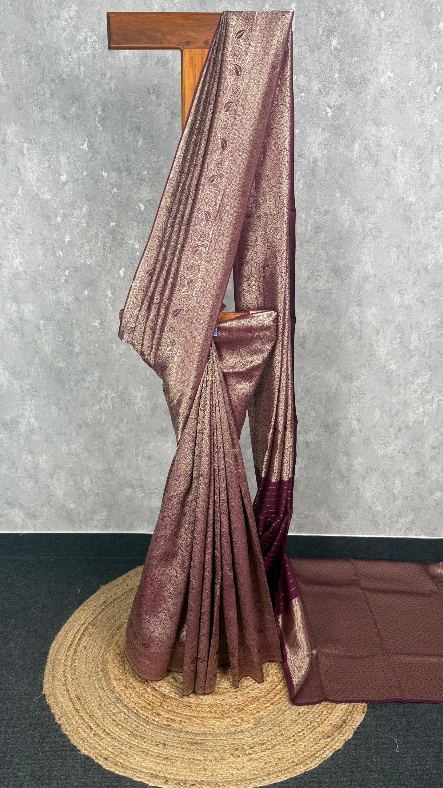 This exquisite saree features a deep plum hue enriched with intricate golden zari weaving that gives it a regal and timeless appeal. The delicate motifs and finely detailed patterns enhance its luxurious texture, making it perfect for weddings, festive occasions, and grand celebrations. Its rich drape adds a graceful, sophisticated charm to any look.