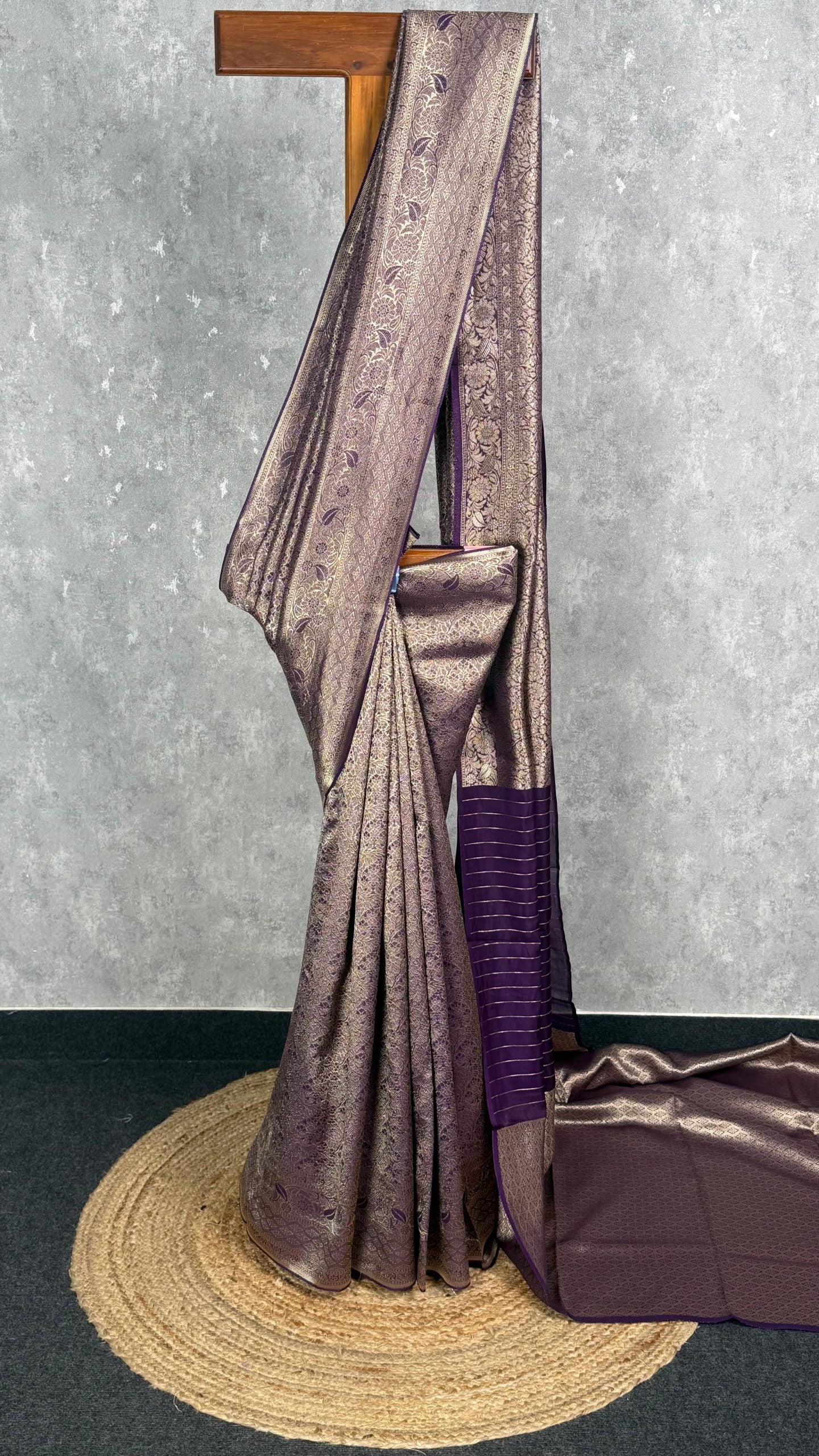 This saree beautifully blends deep purple with rich silver-toned zari work, creating an opulent and luxurious look. The intricate all-over weaving and elegant pallu add a touch of regal charm, perfect for weddings and grand celebrations. Its refined detailing and graceful drape make it a timeless statement piece.