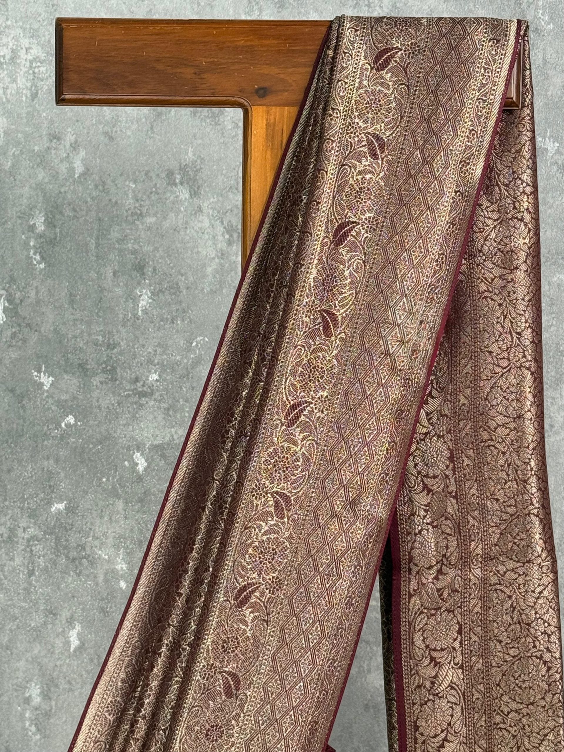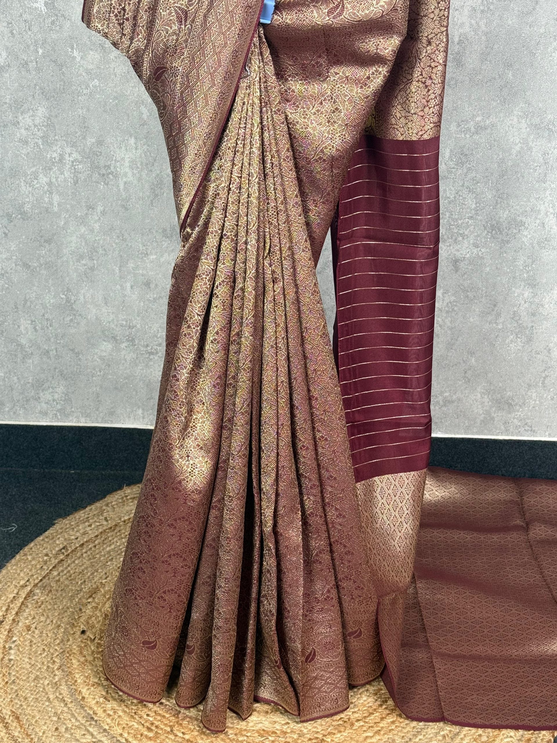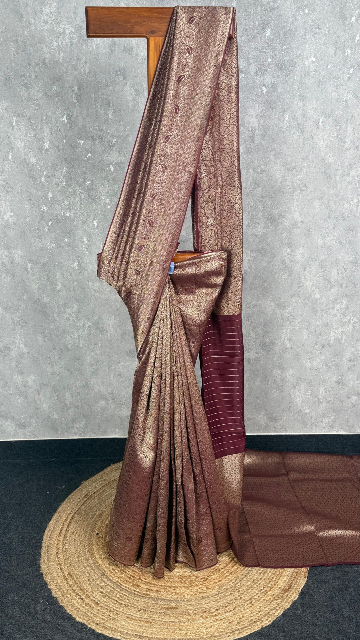 This saree features a rich blend of deep maroon and antique gold weaving, giving it a luxurious and regal appeal. The intricate motifs and beautifully crafted pallu add depth and sophistication, perfect for festive and traditional occasions. Its elegant finish and classic charm make it a timeless addition to any wardrobe.