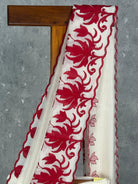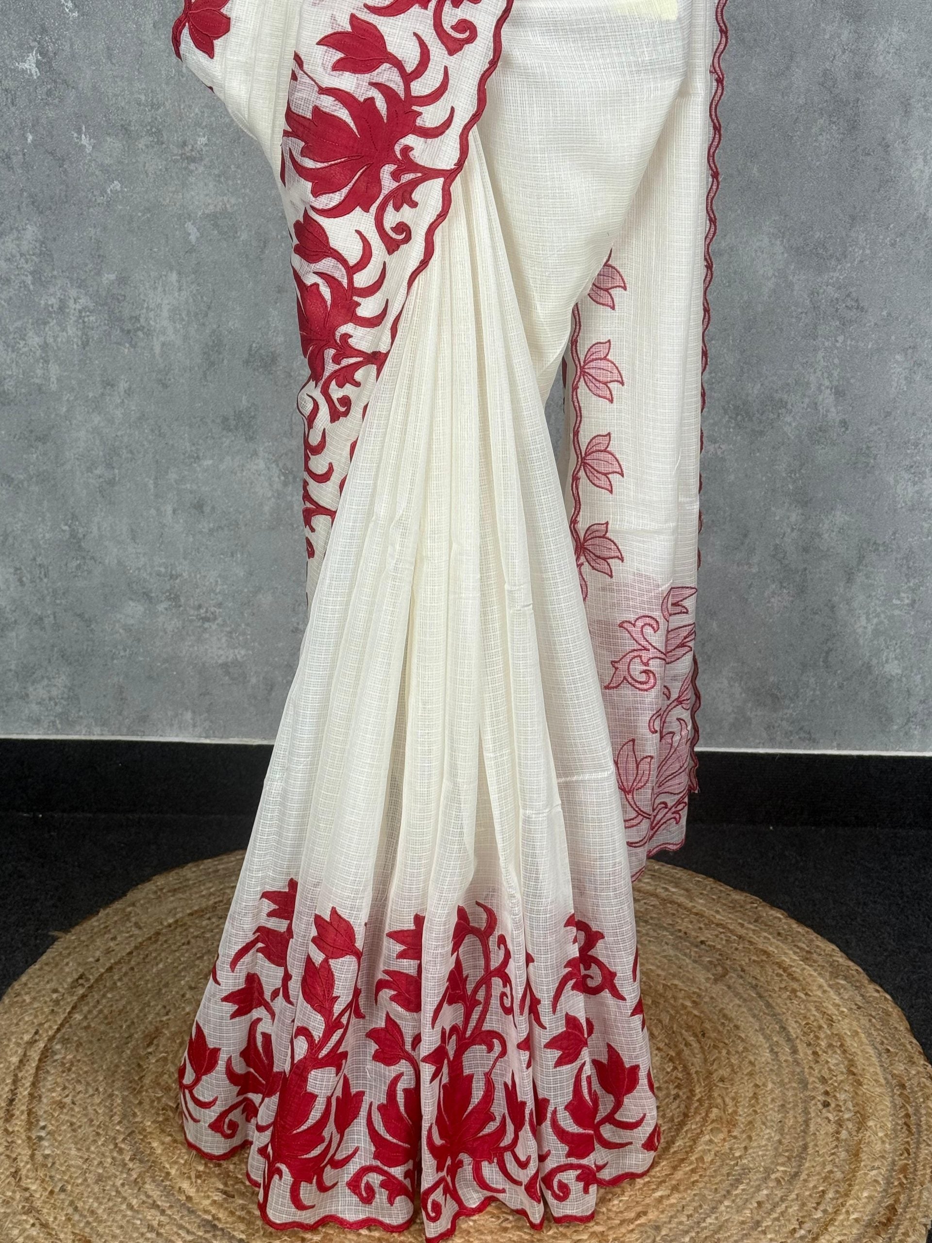 This stunning saree features a soft ivory base adorned with bold red floral embroidery, creating a captivating blend of tradition and charm. The intricate threadwork and scalloped border add a refined touch to its graceful silhouette. Perfect for festive occasions or elegant gatherings, it embodies timeless sophistication.