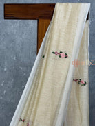 This elegant silk linen saree comes in a soft ivory-beige tone with intricate floral embroidery scattered gracefully across the body. The fabric blends the smoothness of silk with the breathable texture of linen, making it lightweight and comfortable to wear. A subtly woven pallu with pastel threadwork adds a refined finish to the design.The saree comes with attached self color blouse piece.