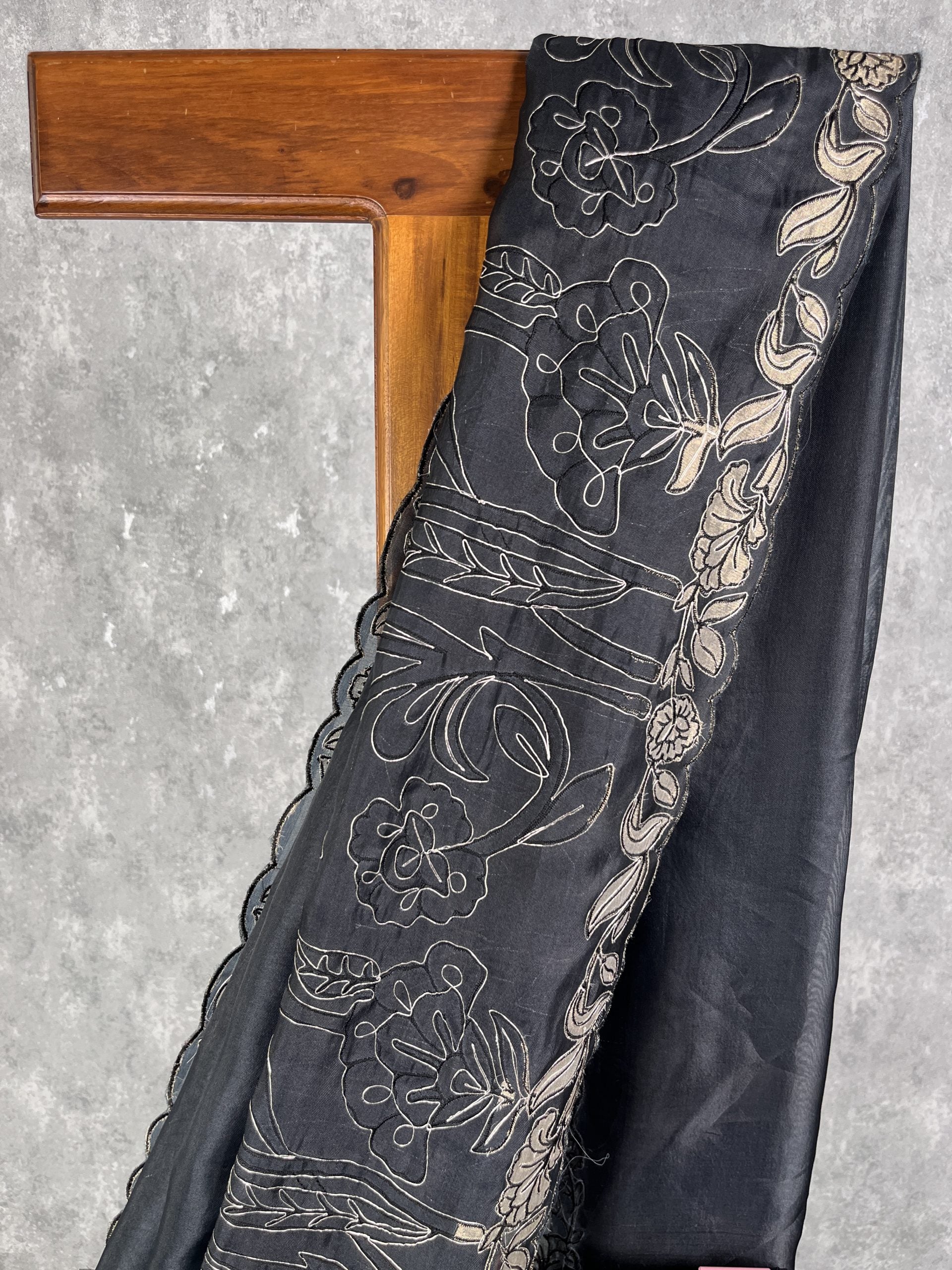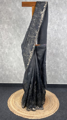 Pure silk organza saree in black with self color applique embroidery and zari aari embroidery all over the body. The border has intricate tissue applique and cutwork edges. The saree has attached self color blouse piece.