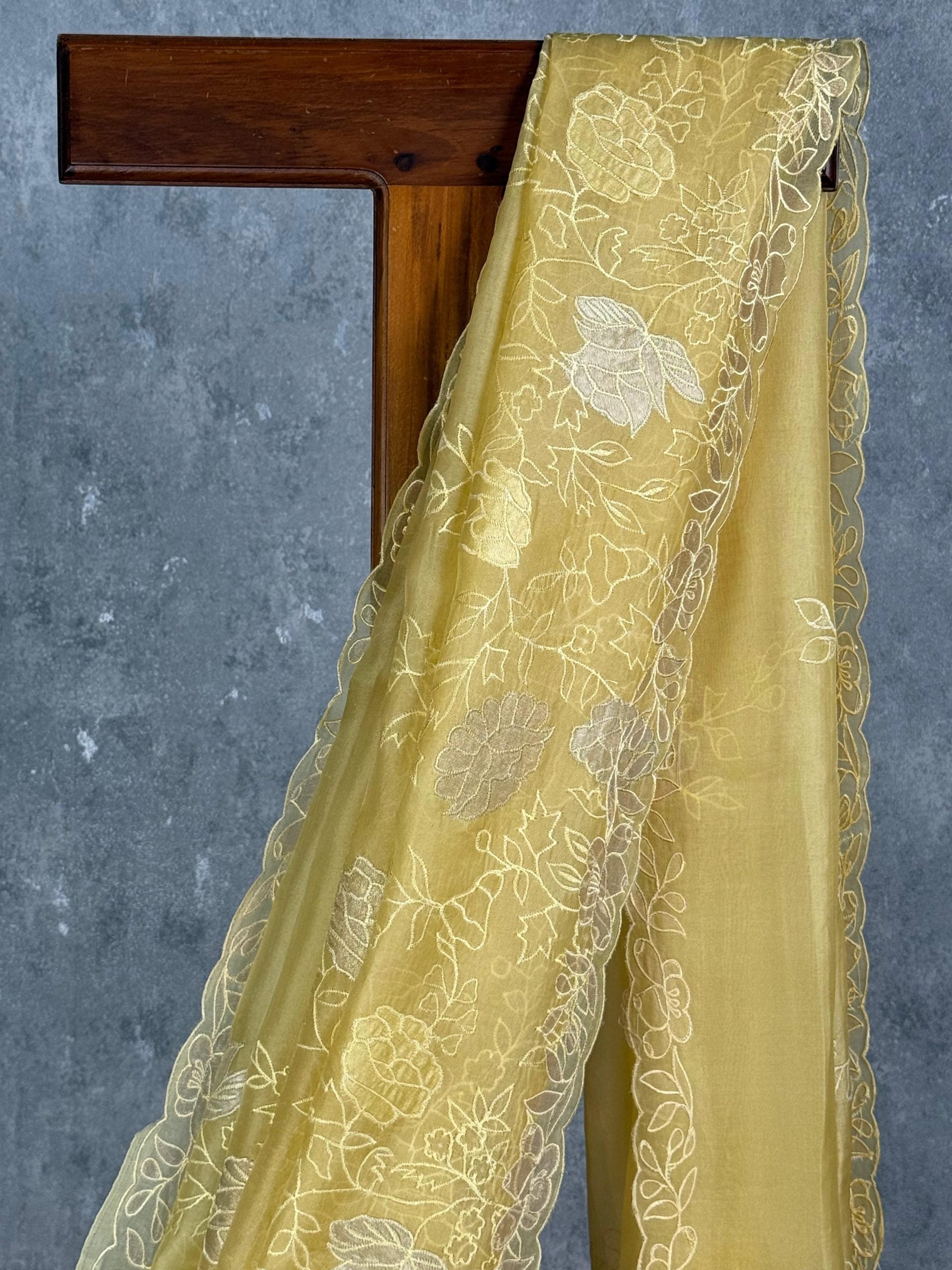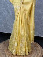 This beautiful yellow saree radiates warmth and charm with its soft, cheerful hue and delicate floral embroidery. The intricate detailing along the border adds a graceful touch, making it perfect for festive occasions and daytime celebrations