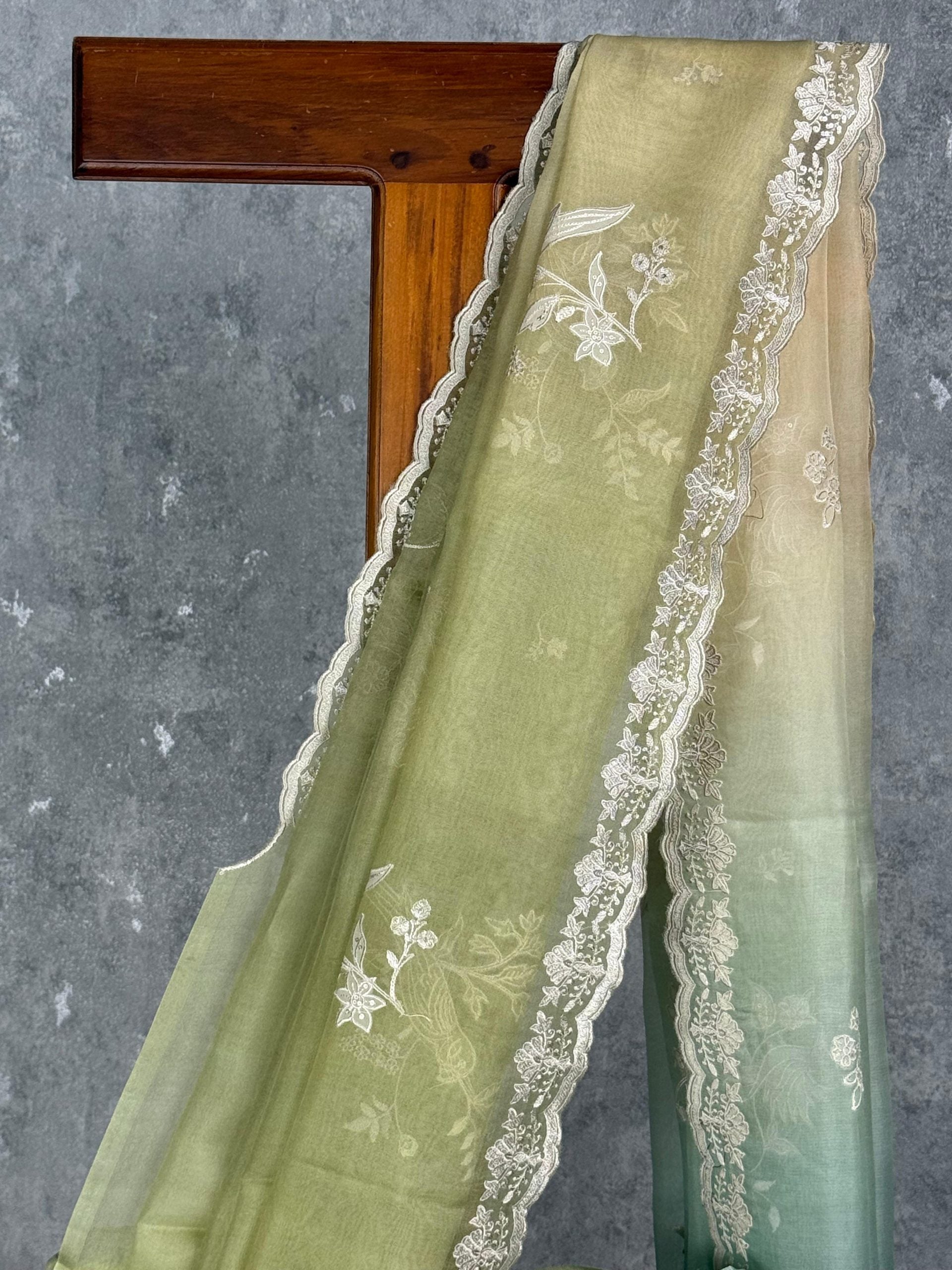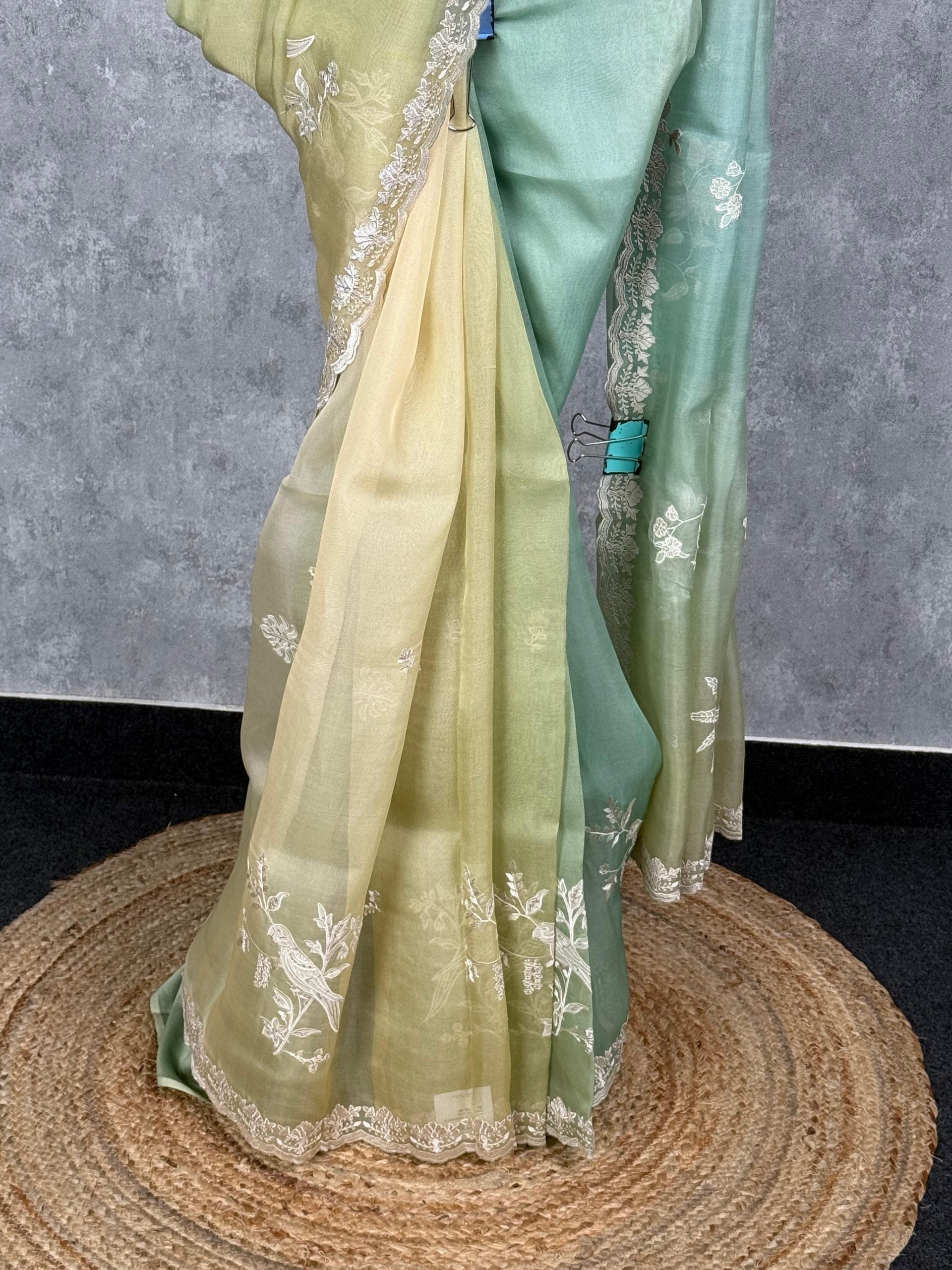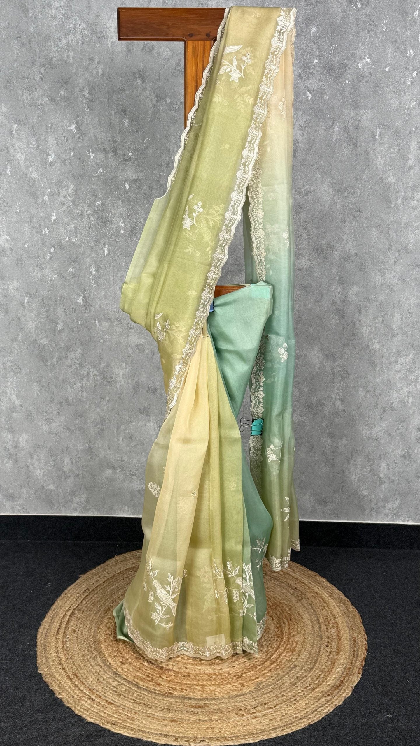 This saree features a serene ombré blend of soft yellow and mint green, creating a refreshing and elegant look. Delicate white embroidery and a beautifully scalloped lace border add a refined, graceful charm. Perfect for daytime celebrations and intimate gatherings, it exudes subtle sophistication with a gentle, airy appeal.