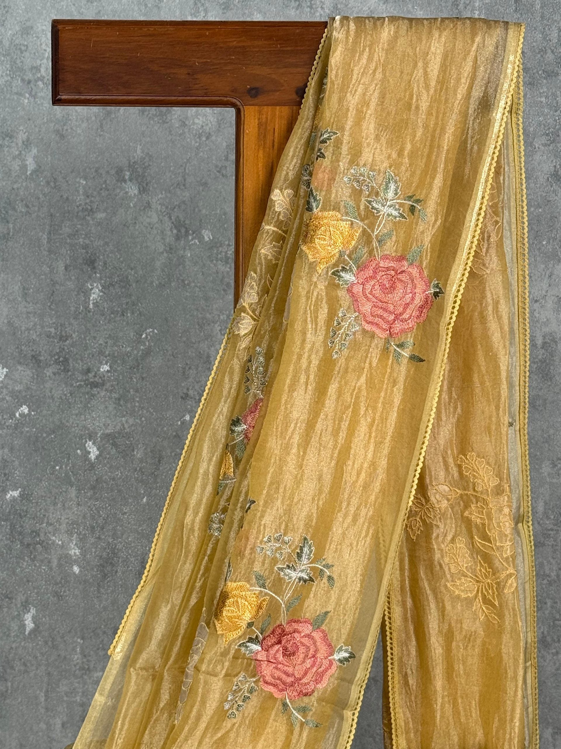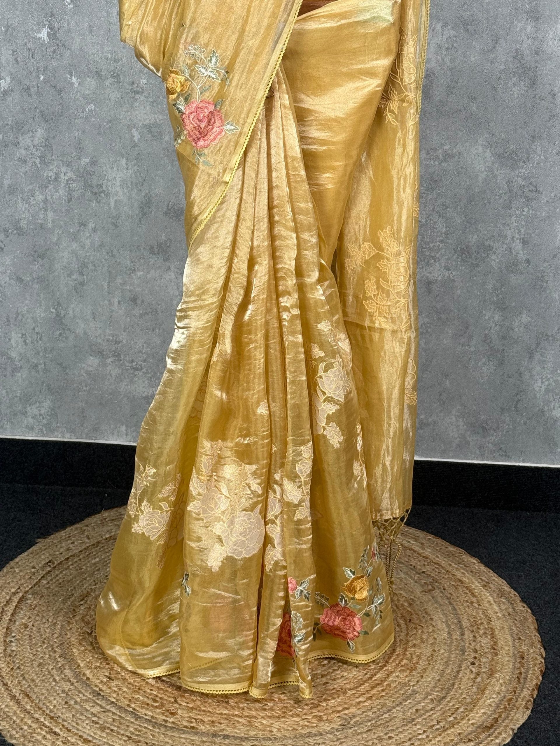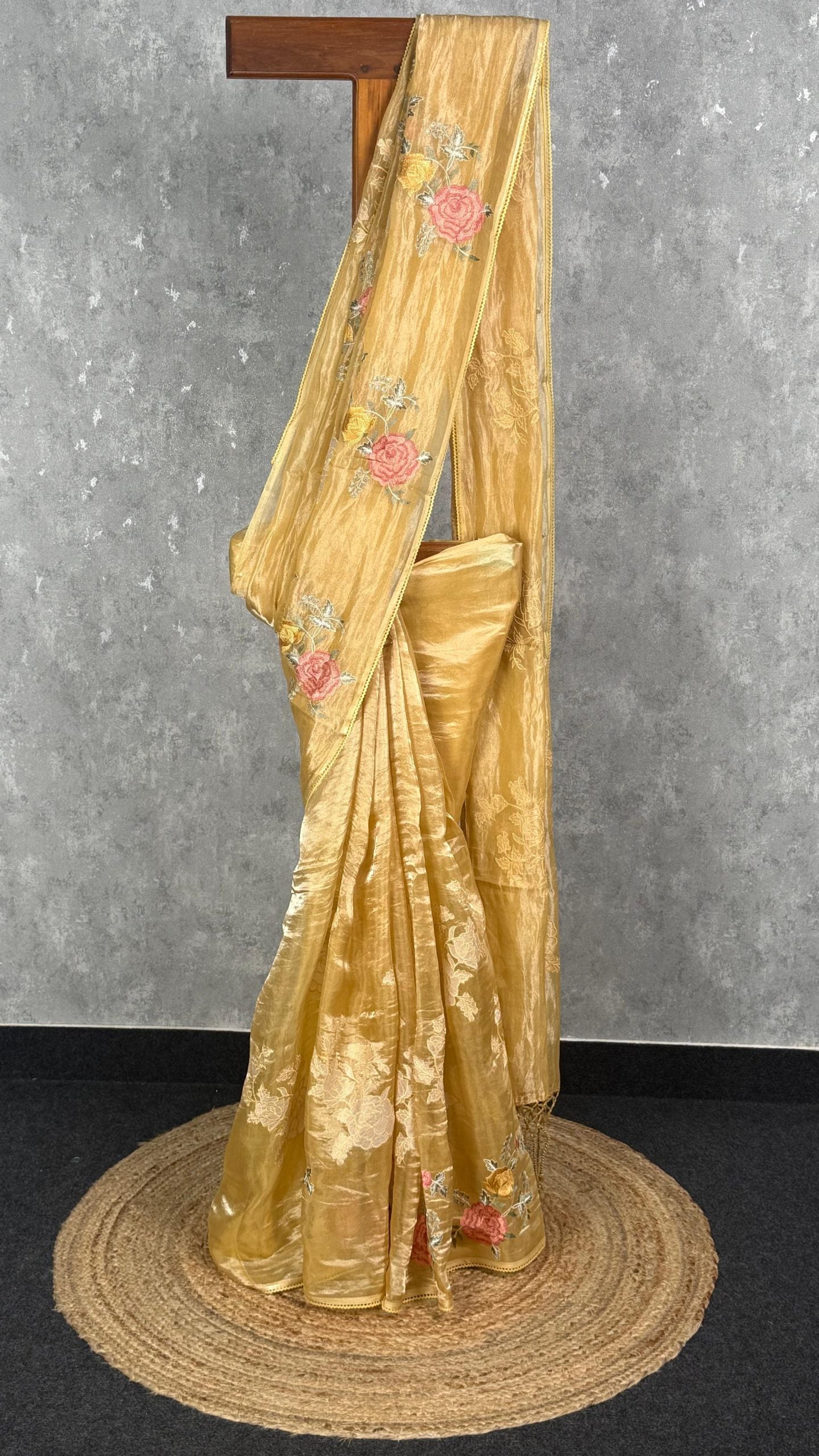 This saree exudes a regal charm with its rich mustard-gold shade and lustrous, textured finish. The beautifully embroidered floral motifs in soft pink and yellow add a graceful, feminine touch to the drape. Perfect for festive occasions and grand celebrations, it brings together elegance, warmth, and sophistication.
