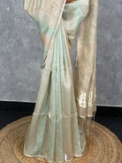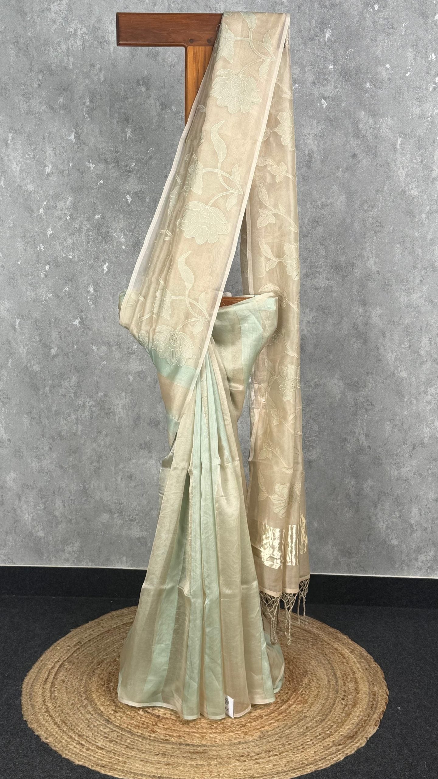 This saree features a soothing blend of mint green and beige, giving it a soft and elegant appeal. The sheer pallu is adorned with delicate floral embroidery that enhances its graceful and refined look. Perfect for daytime events and subtle celebrations, it offers timeless charm with a contemporary touch.