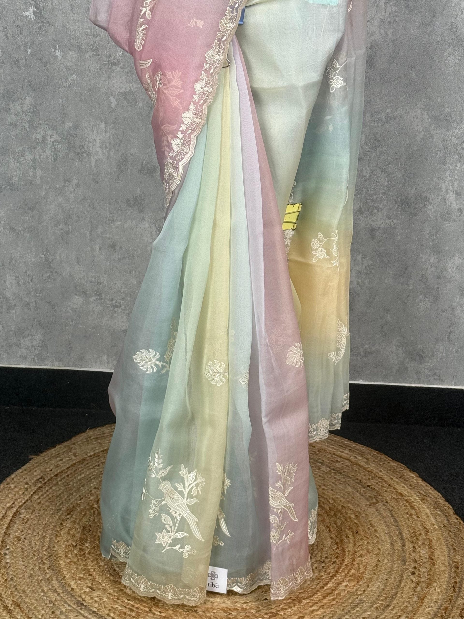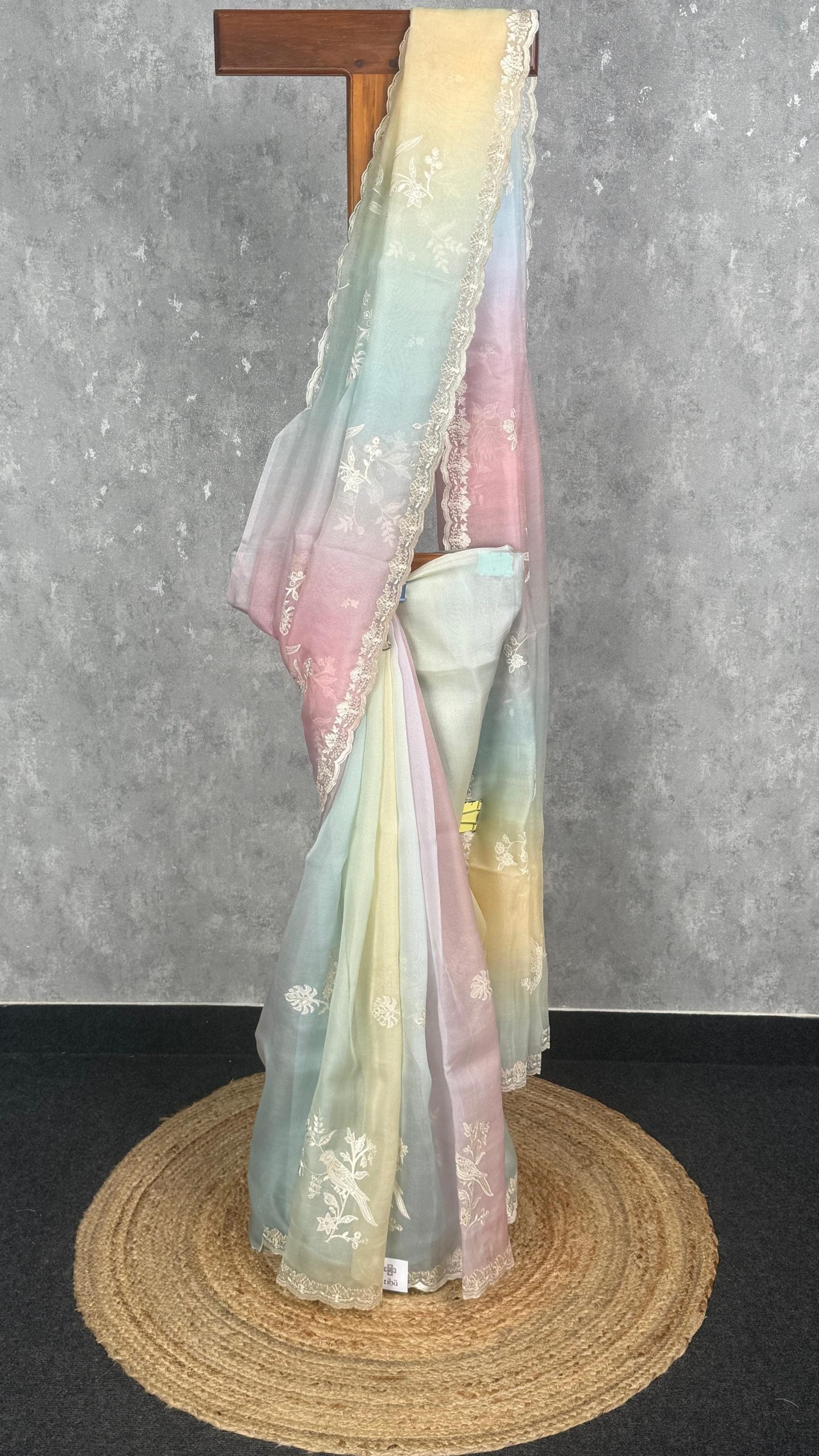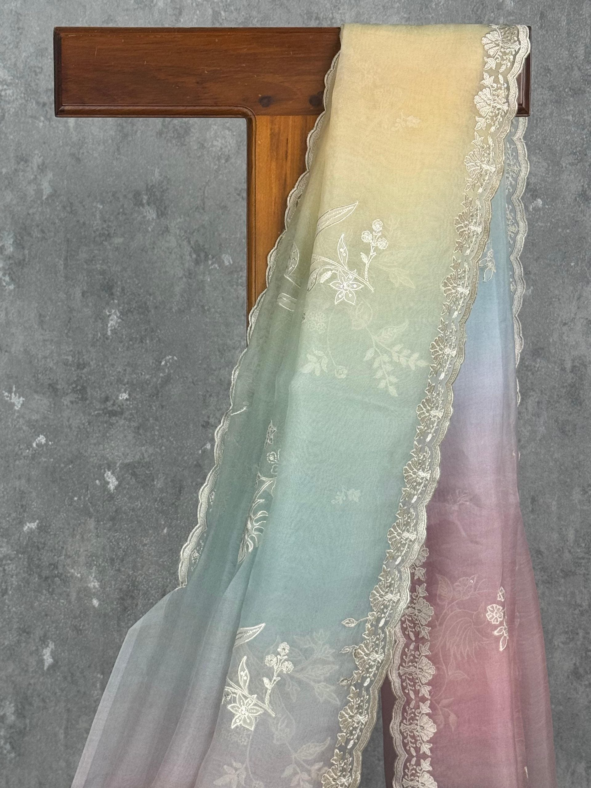 This saree features a dreamy pastel ombré palette blending shades of yellow, blue, pink, and peach for a soft, ethereal look. Delicate white embroidery and a scalloped lace border enhance its elegance and add a touch of sophistication. Perfect for daytime celebrations and special occasions, it offers a graceful and enchanting appeal.