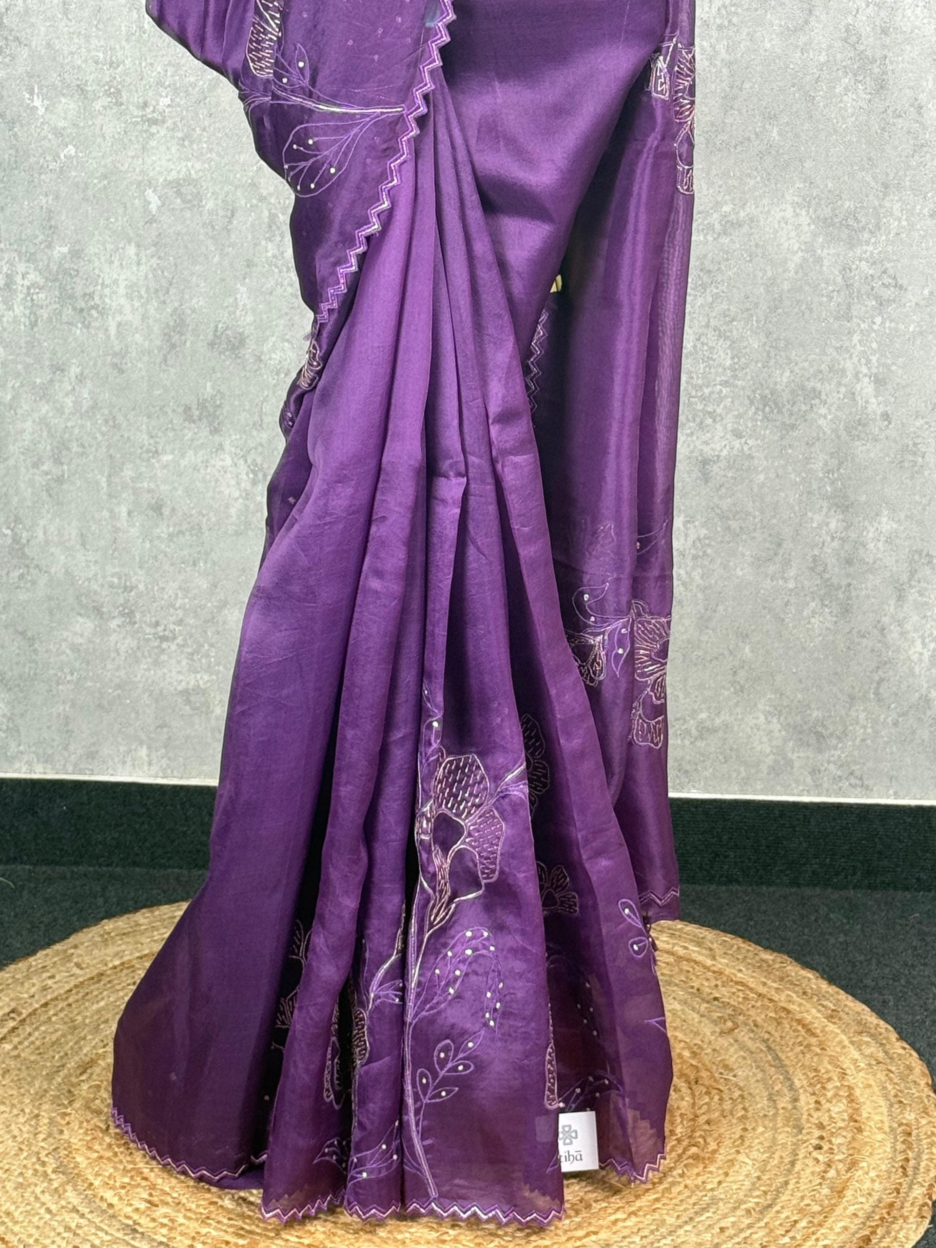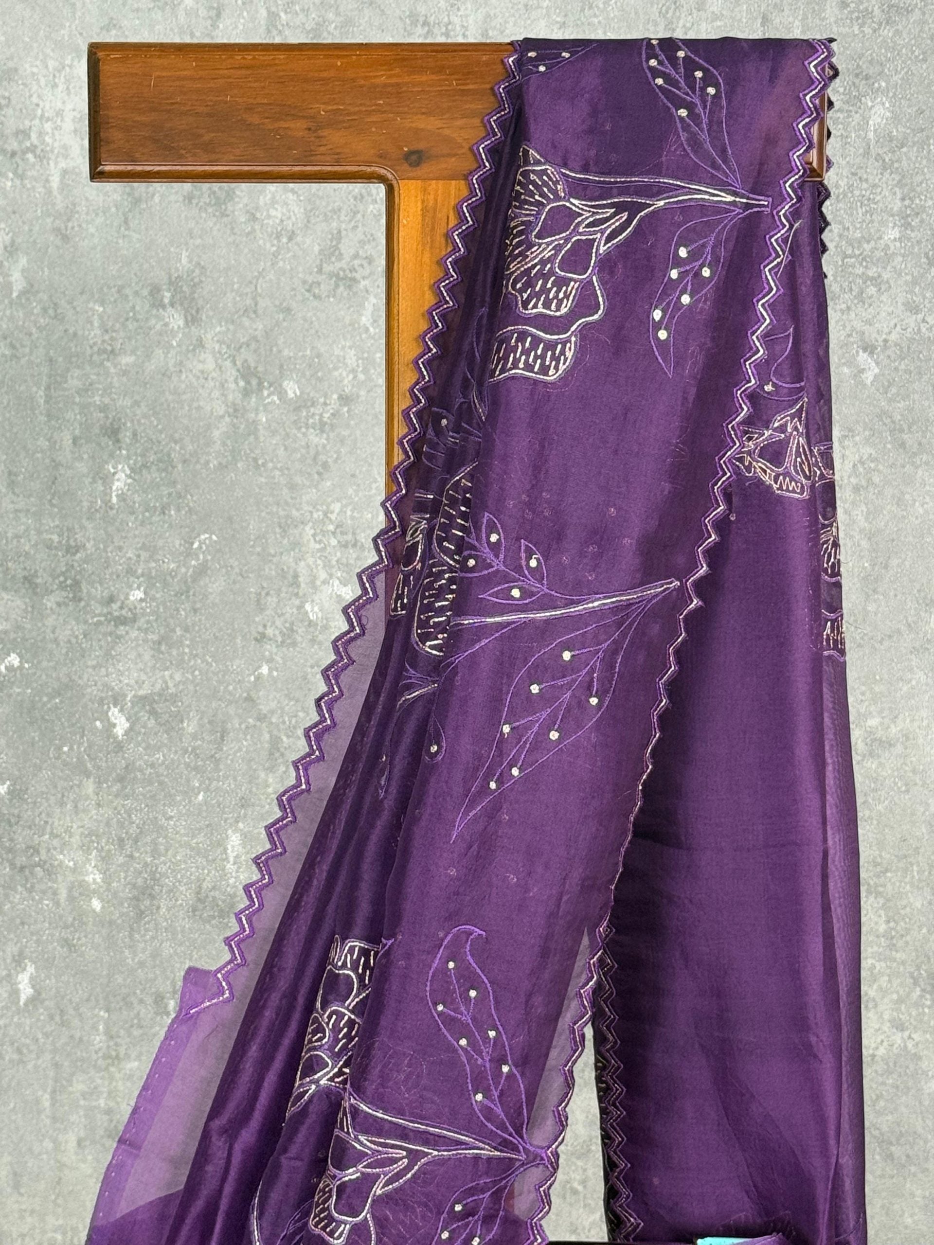 This deep purple saree exudes regal elegance and charm. Adorned with delicate thread embroidery and scalloped lace borders, it beautifully captures a blend of tradition and sophistication. Perfect for evening occasions, it adds a graceful and luxurious touch to your ensemble.