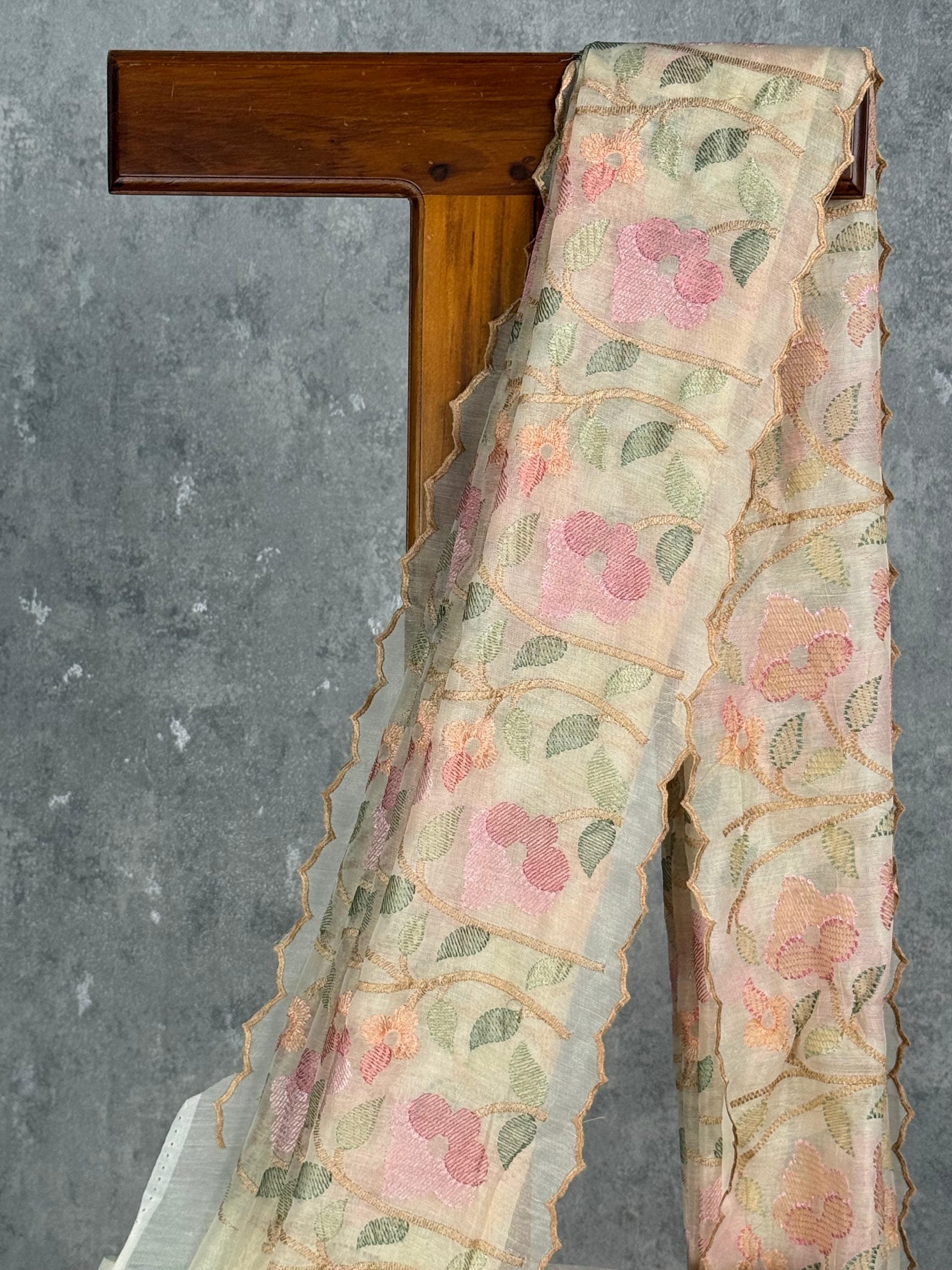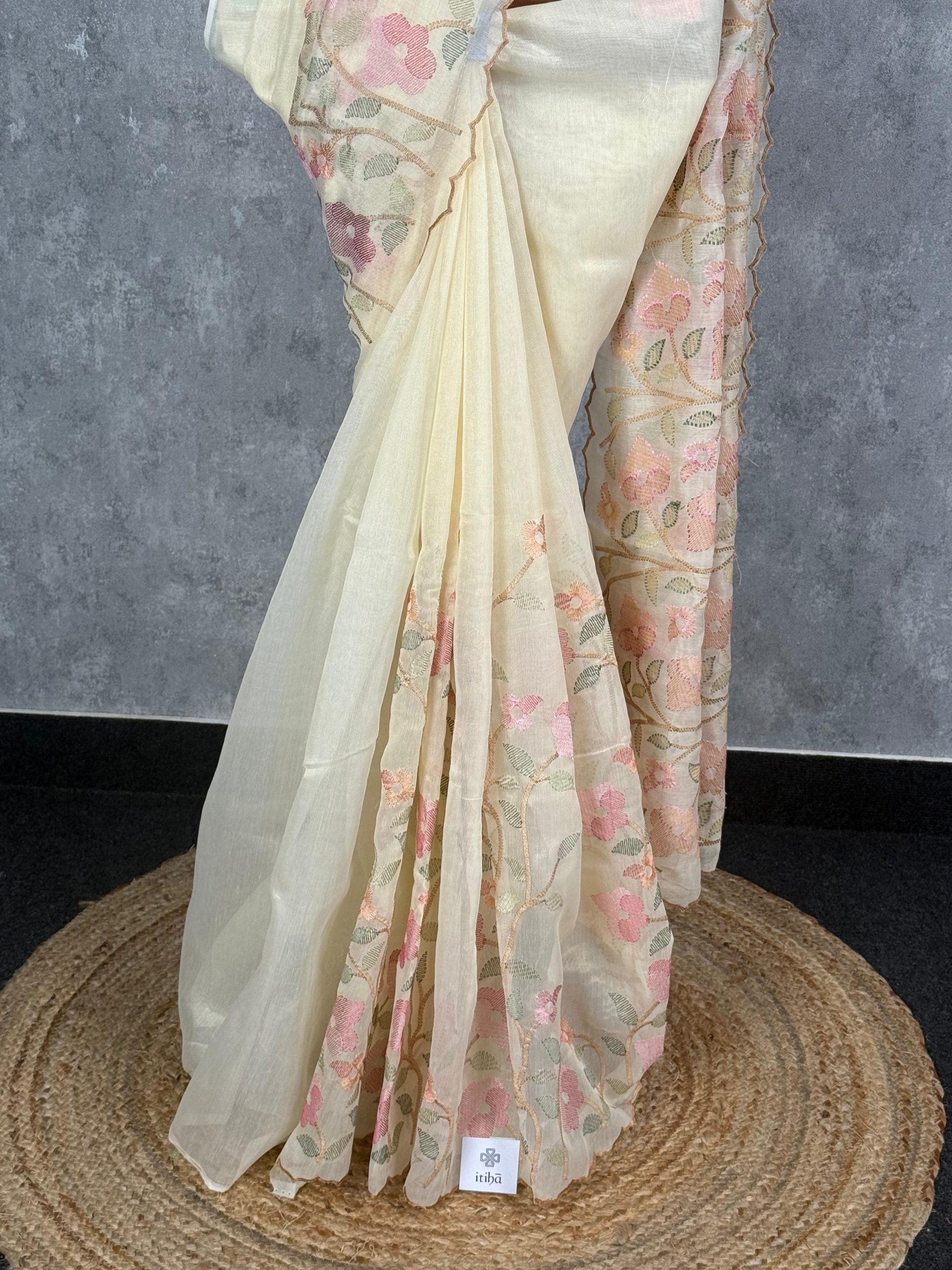 This elegant saree features a soft cream base beautifully enhanced with delicate pastel floral embroidery. Its sheer, scalloped pallu adds a refined charm, giving the drape a graceful and feminine appeal. Perfect for daytime occasions, it blends subtle sophistication with timeless elegance.