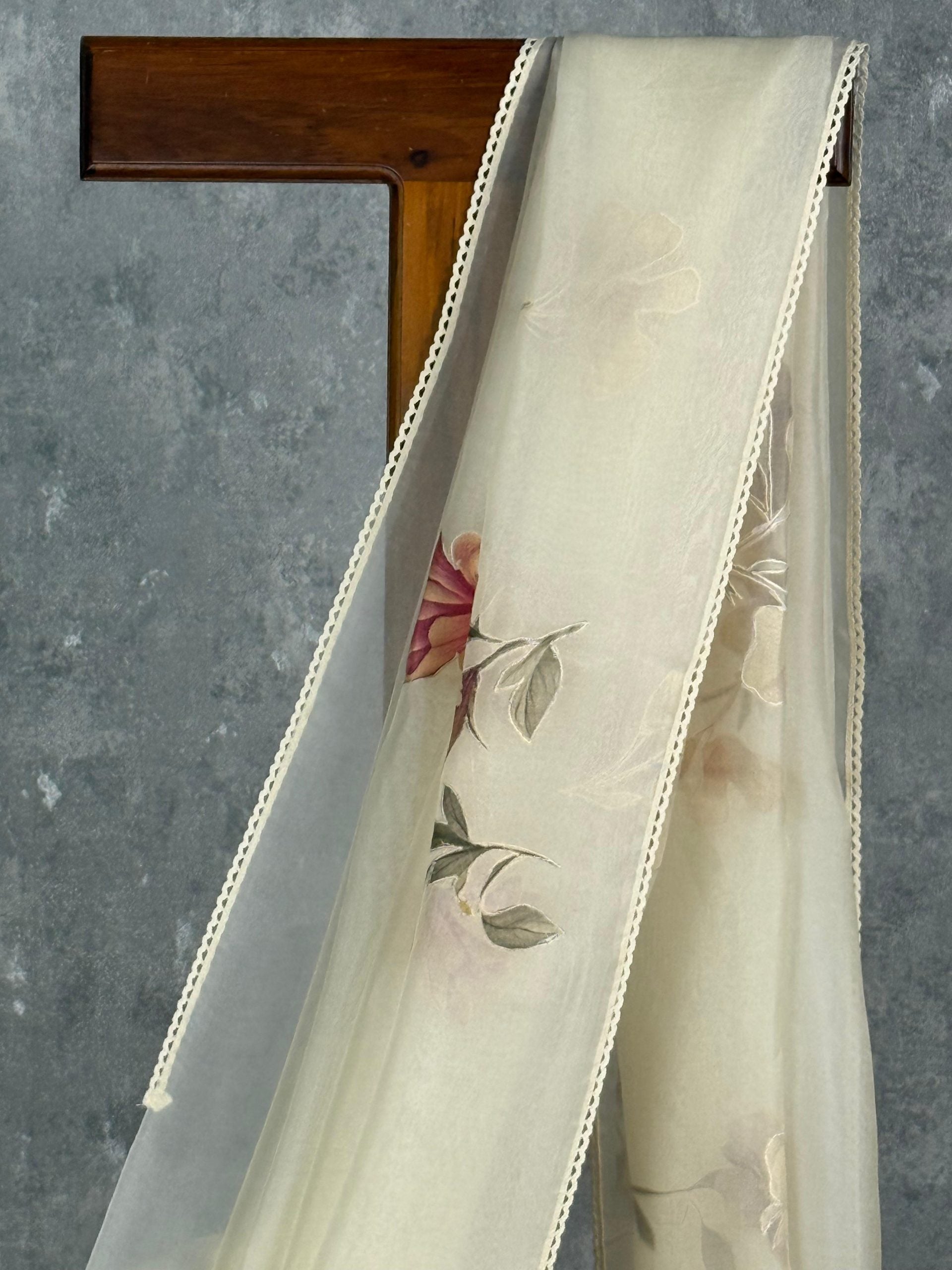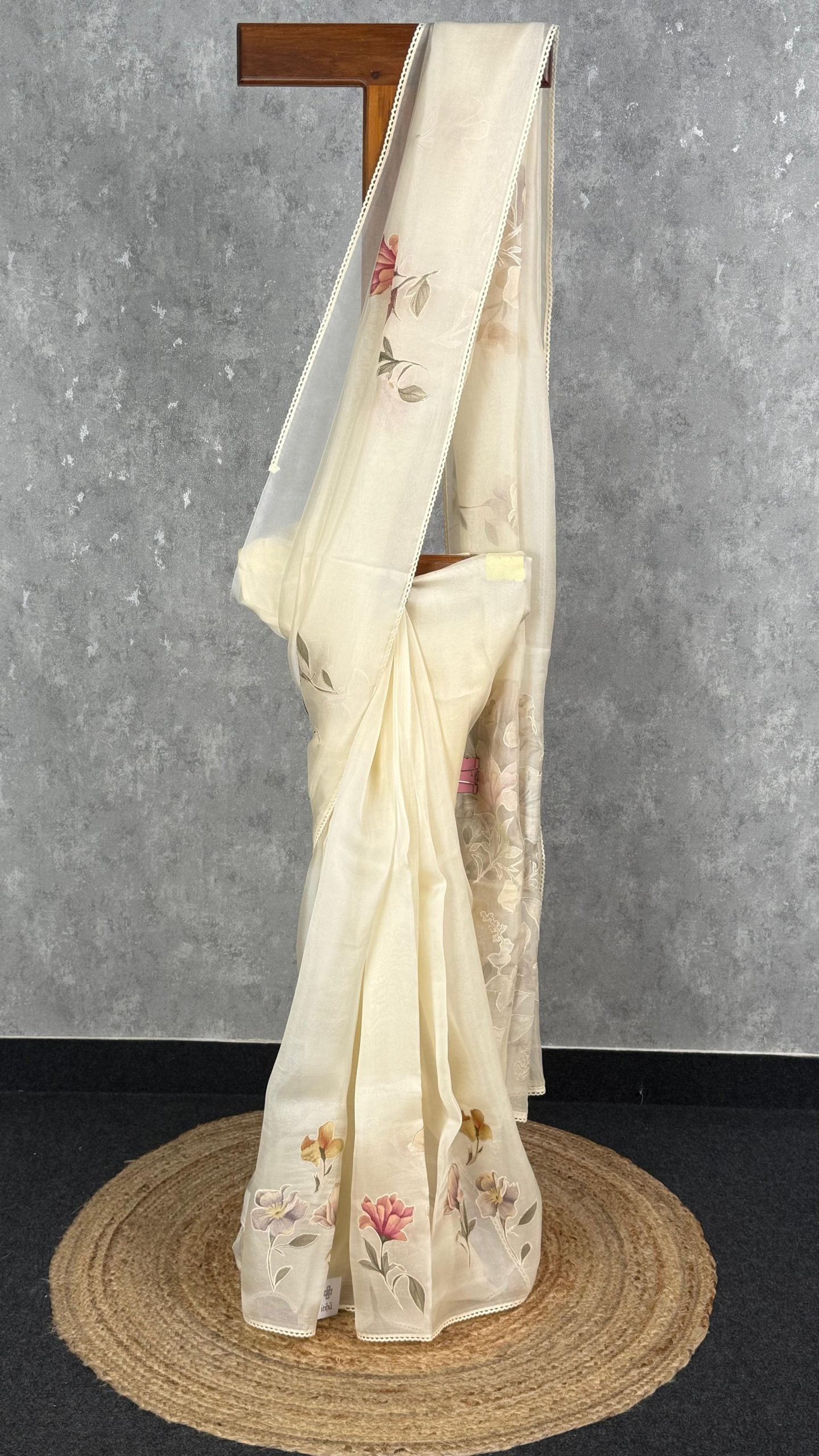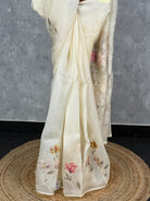 This elegant saree in a soft cream-ivory shade radiates subtle sophistication and timeless charm. Its delicate floral embroidery adds a touch of graceful beauty, enhancing the saree’s refined appeal. Perfect for daytime functions or intimate celebrations, it offers an effortlessly classy look.