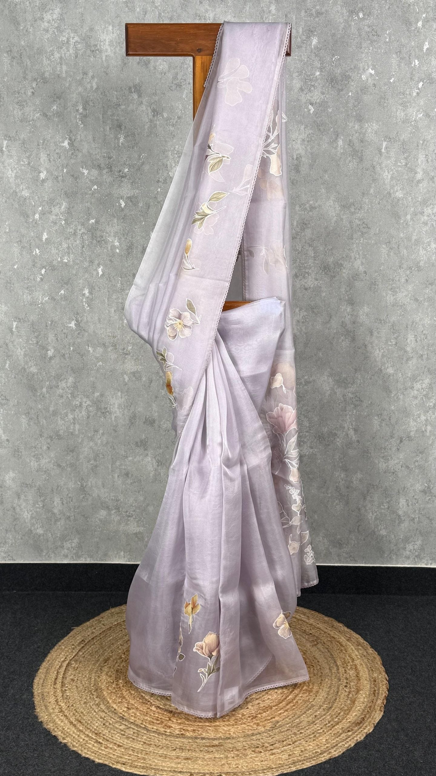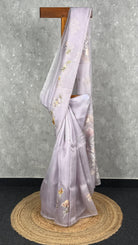 This saree radiates understated elegance with its soft lavender-grey shade and airy, translucent drape. Delicate floral embroidery adds a touch of artistry, giving it a refined and graceful charm. Perfect for subtle yet sophisticated occasions, it blends simplicity with timeless beauty.