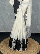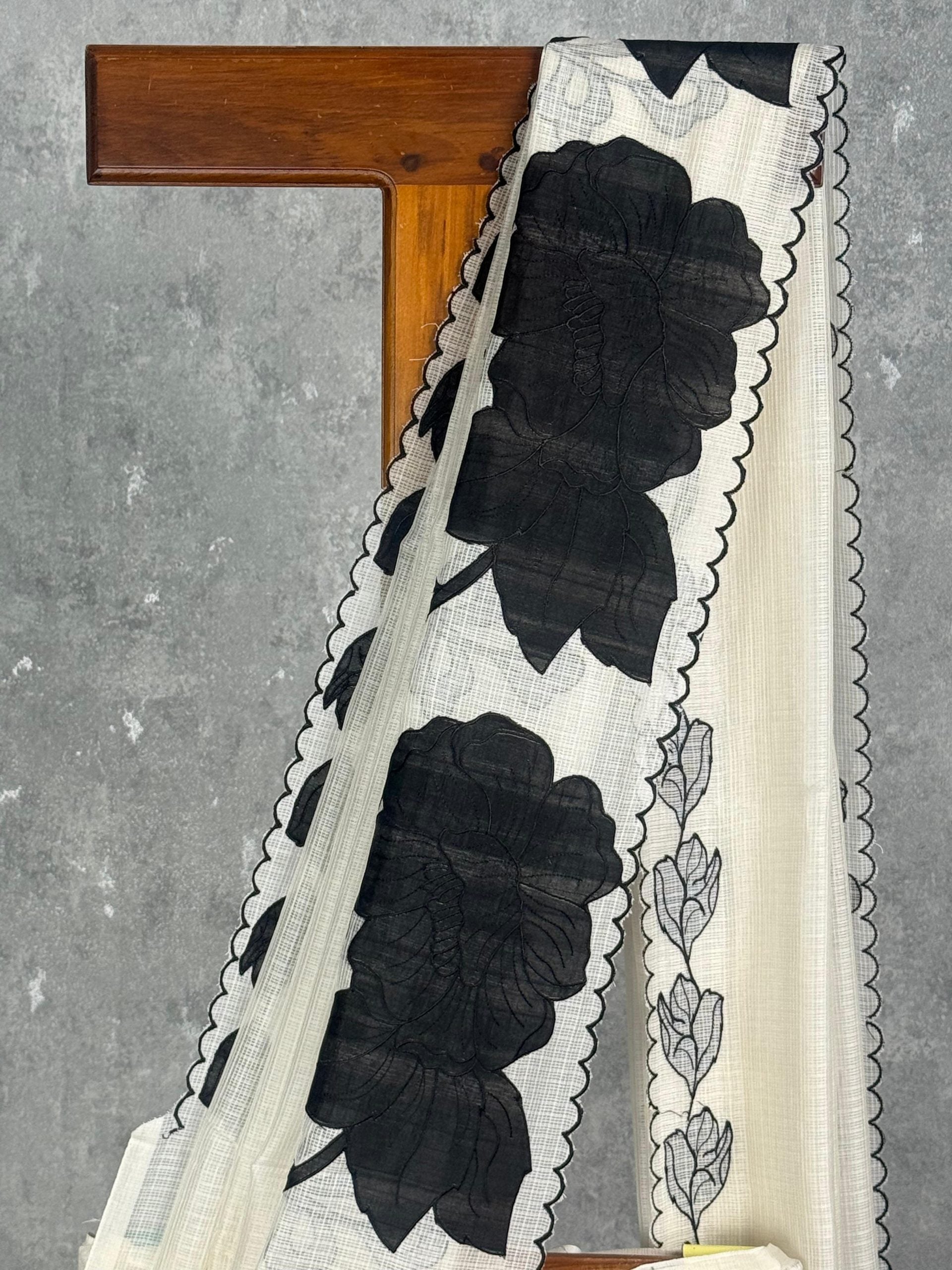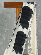 This elegant saree showcases a serene ivory base accentuated with bold black floral motifs, creating a striking contrast. The intricate embroidery and scalloped border add a touch of sophistication to its timeless appeal. Perfect for both festive occasions and elegant gatherings, it exudes effortless grace and charm.