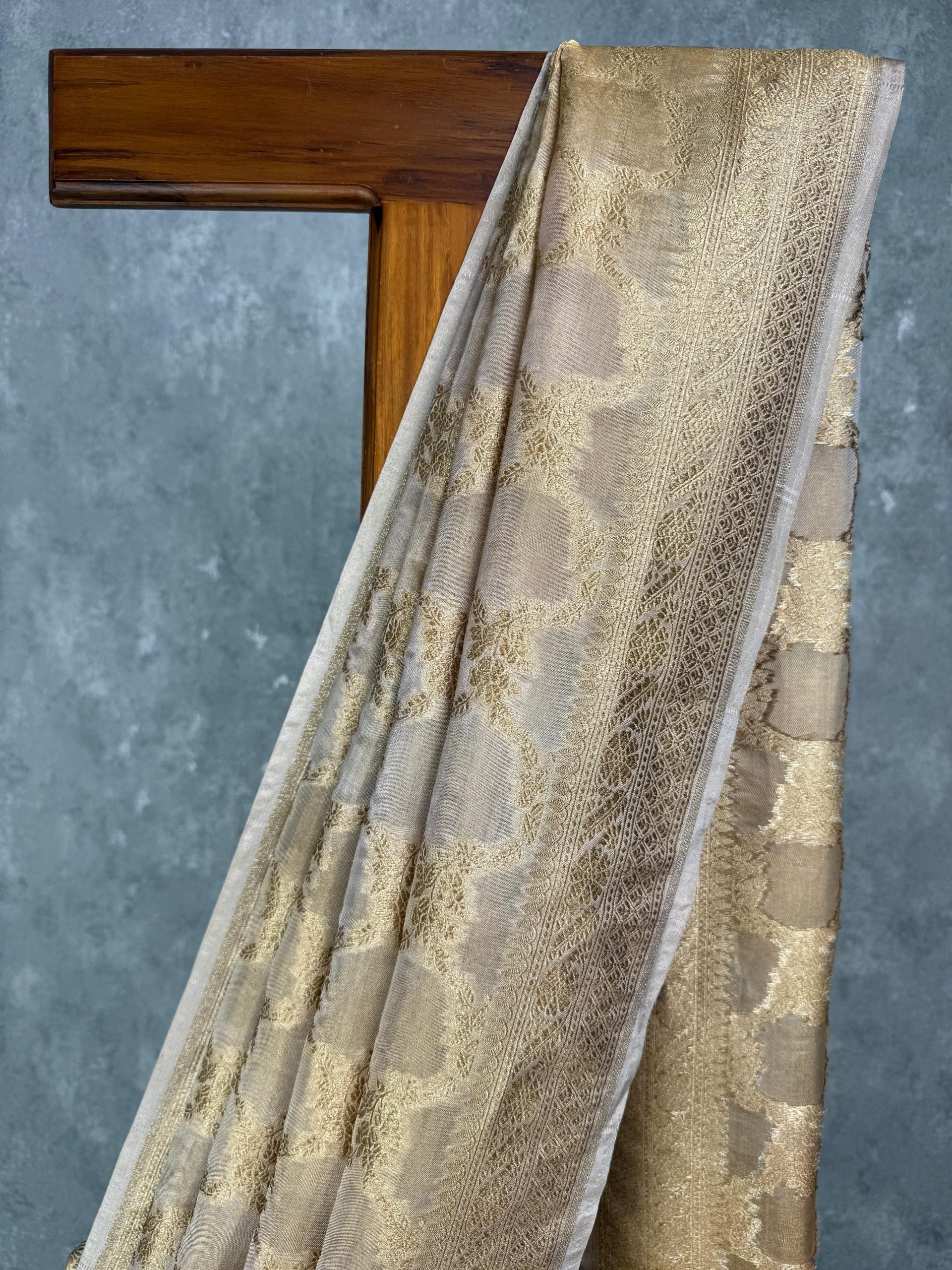 This luxurious Tissue Organza Banarasi Saree comes in a rich golden beige tone, featuring intricate zari woven patterns throughout. The saree exudes traditional elegance with its detailed Banarasi motifs and lustrous finish. The saree comes with attached self coloured blouse piece.