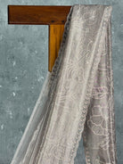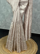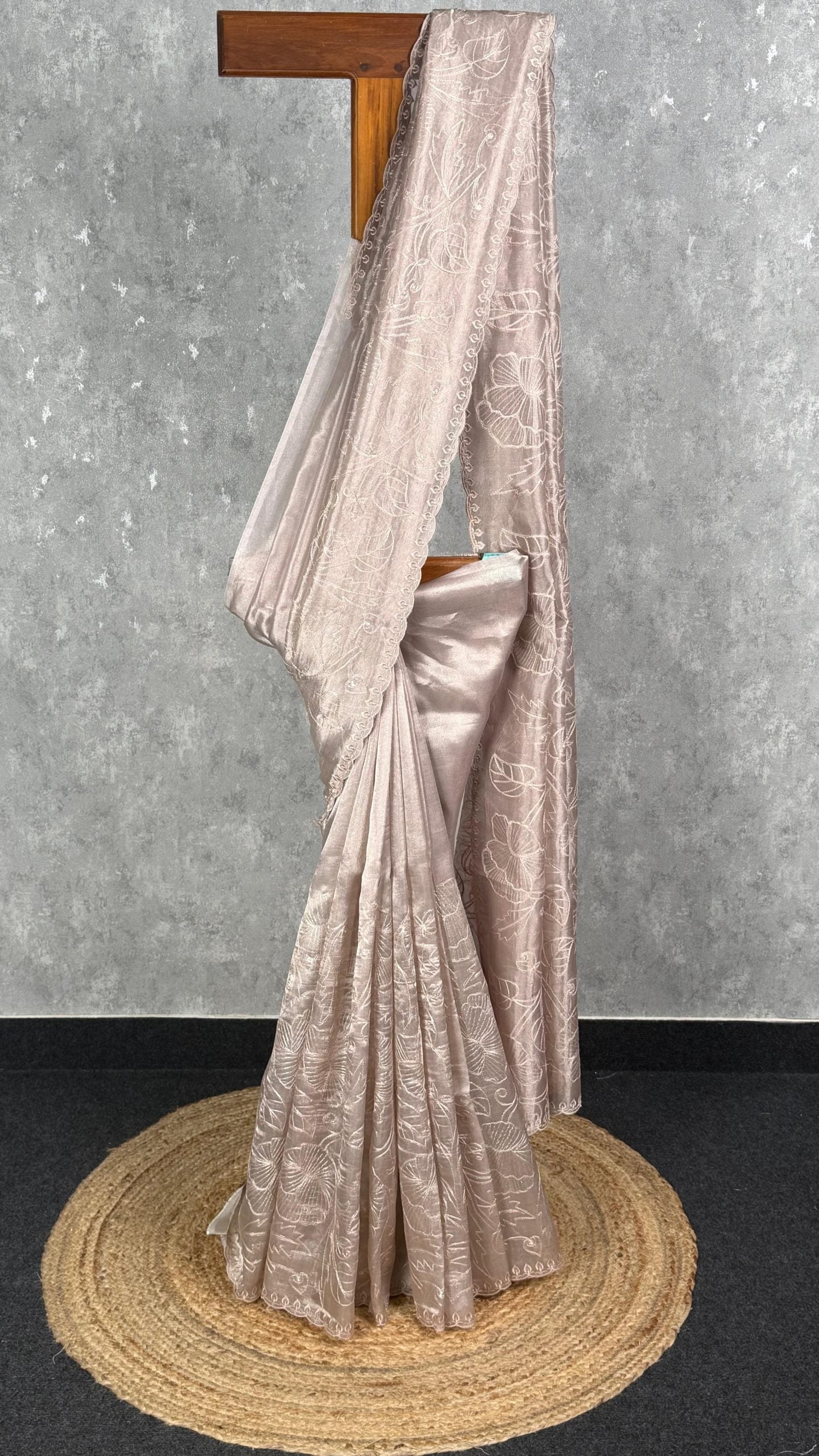 This elegant saree in a subtle taupe shade showcases exquisite floral embroidery that enhances its refined appeal. The soft sheen of the fabric combined with delicate detailing makes it a perfect choice for formal events and special occasions.