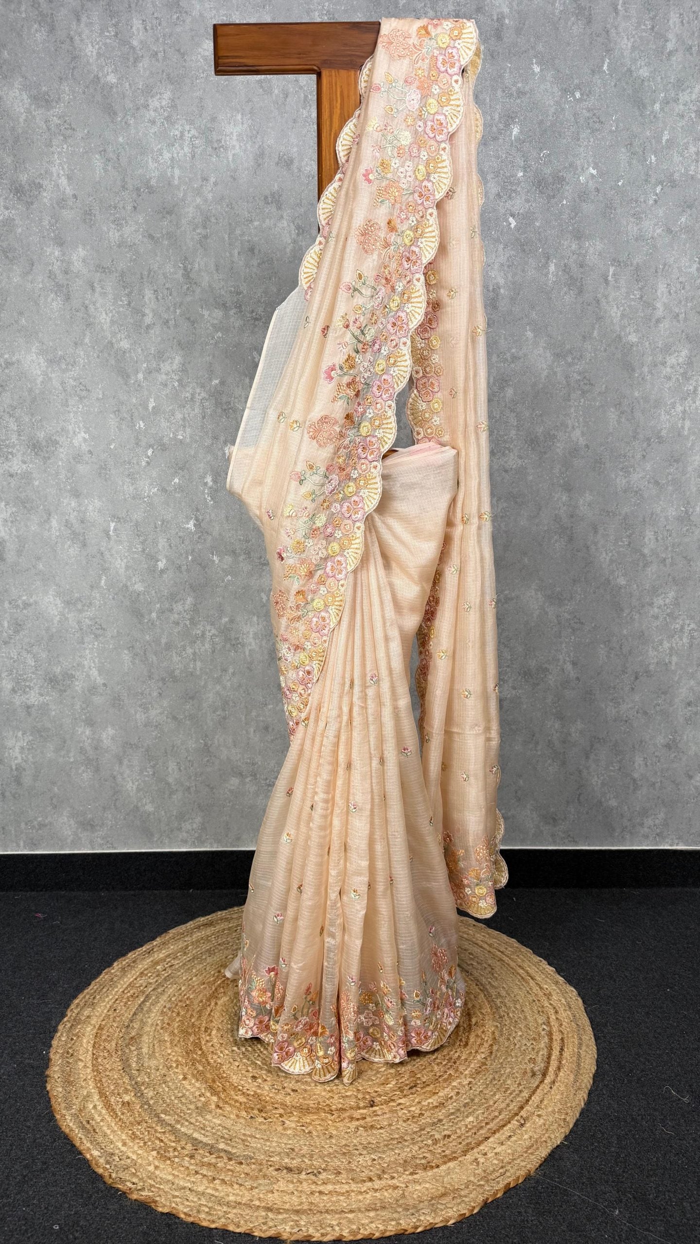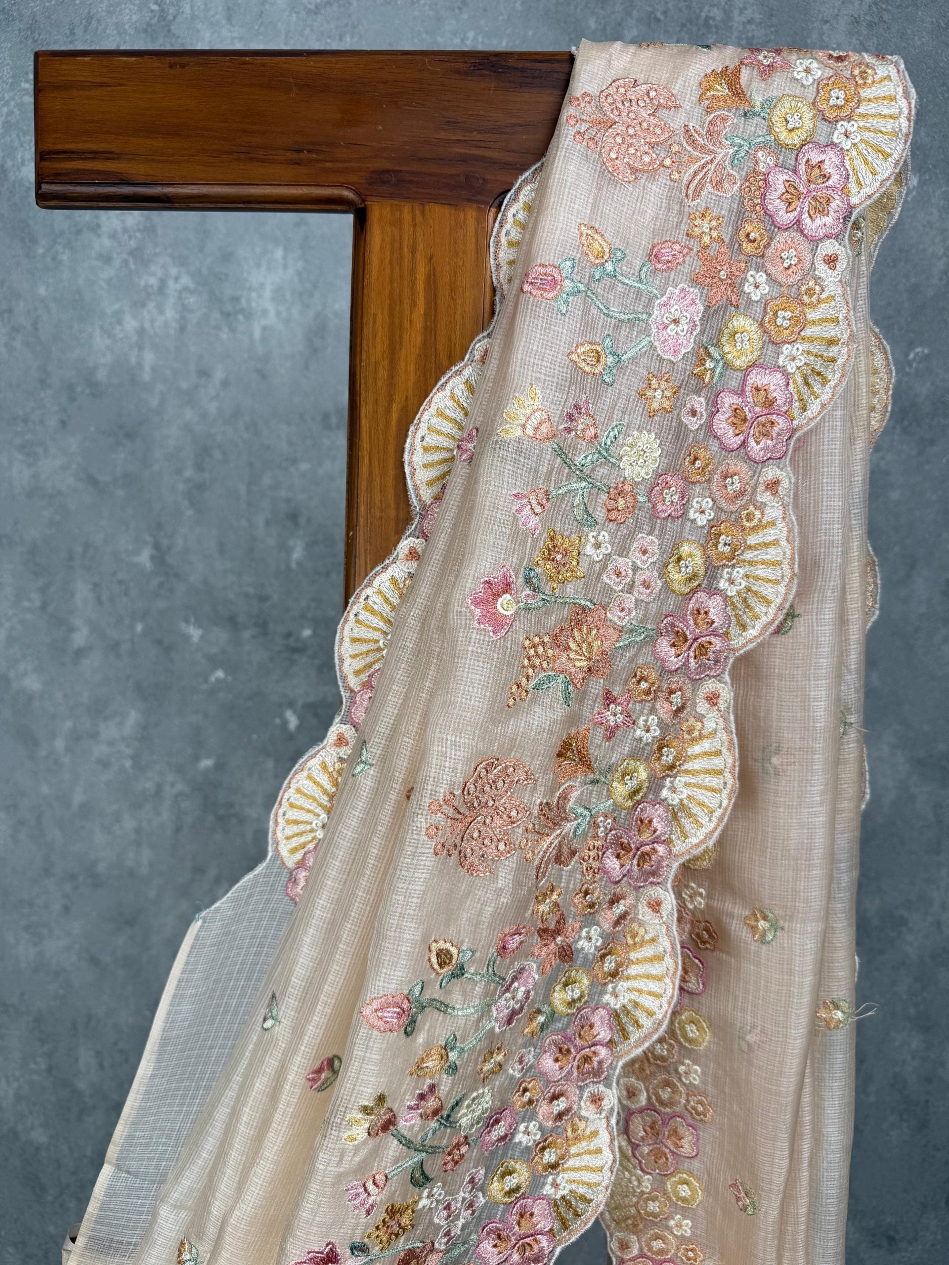 This elegant Tussar Kota saree comes in a subtle light peach tone with intricate tone-on-tone embroidery. It features floral embroidery placed near the border. The saree comes with attached blouse piece.