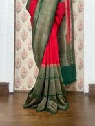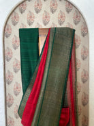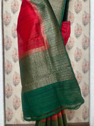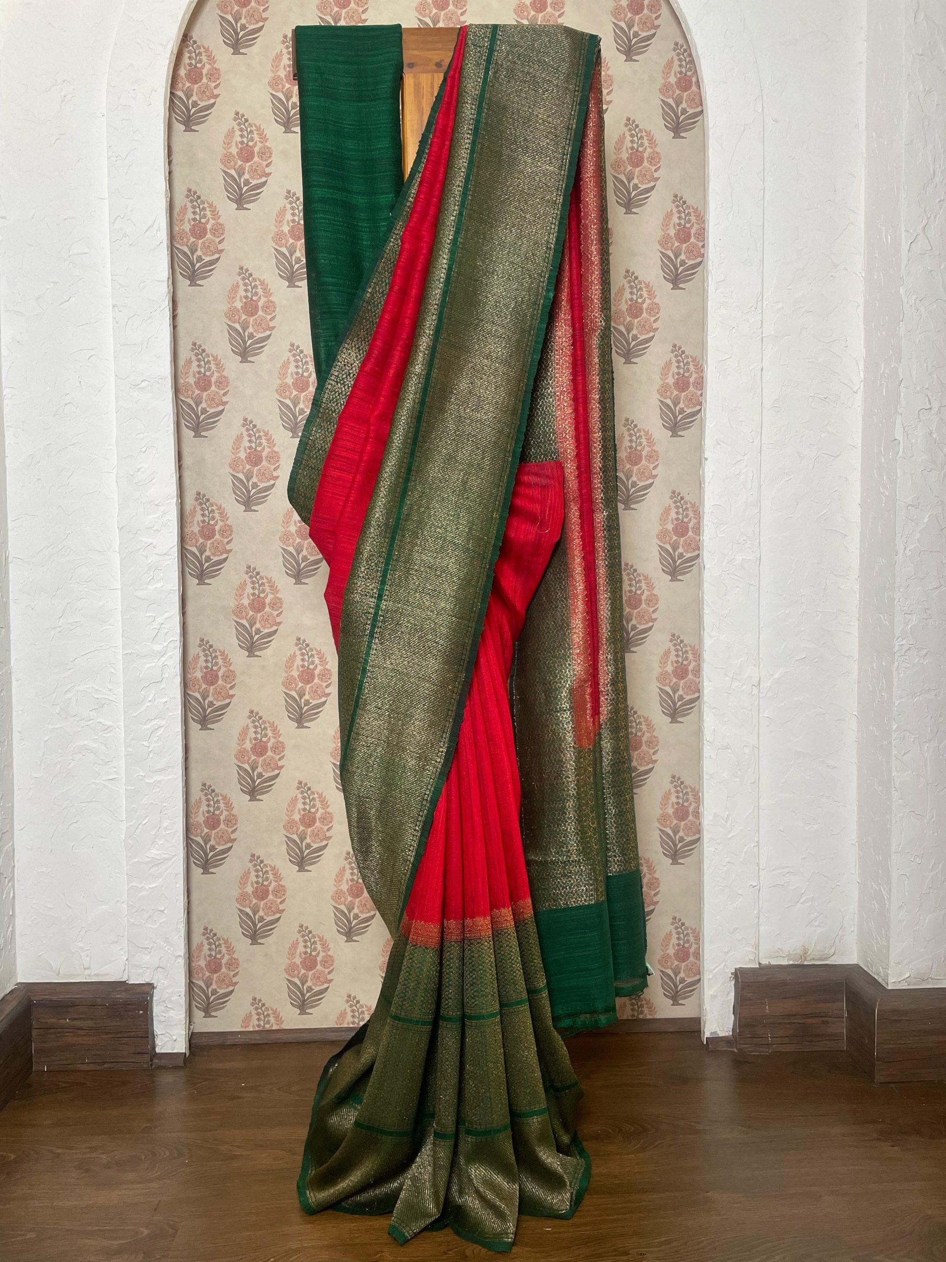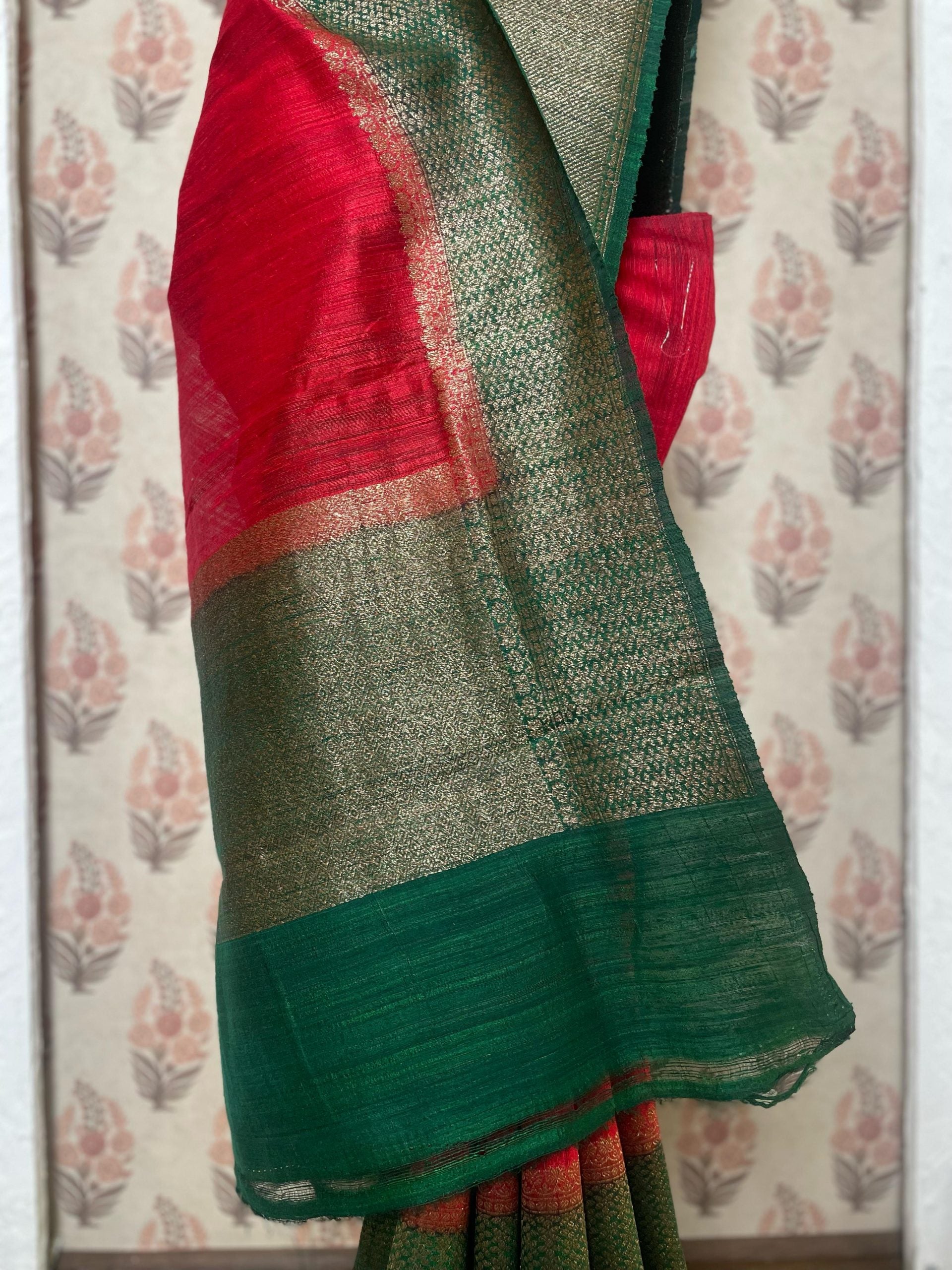 Pure tussar raw silk handloom saree with antique zari banarasi weave with big border. The saree comes with contrast color blouse piece.